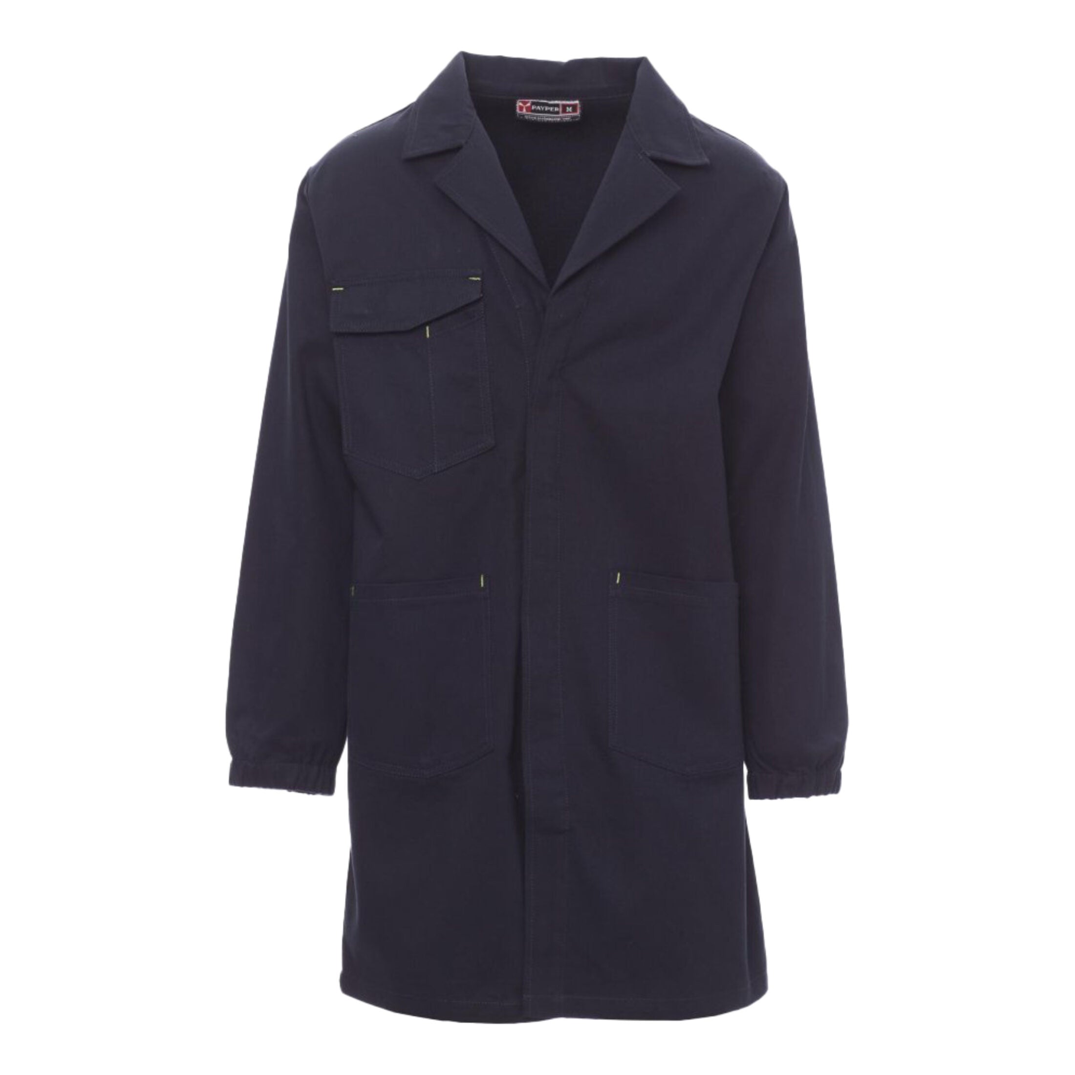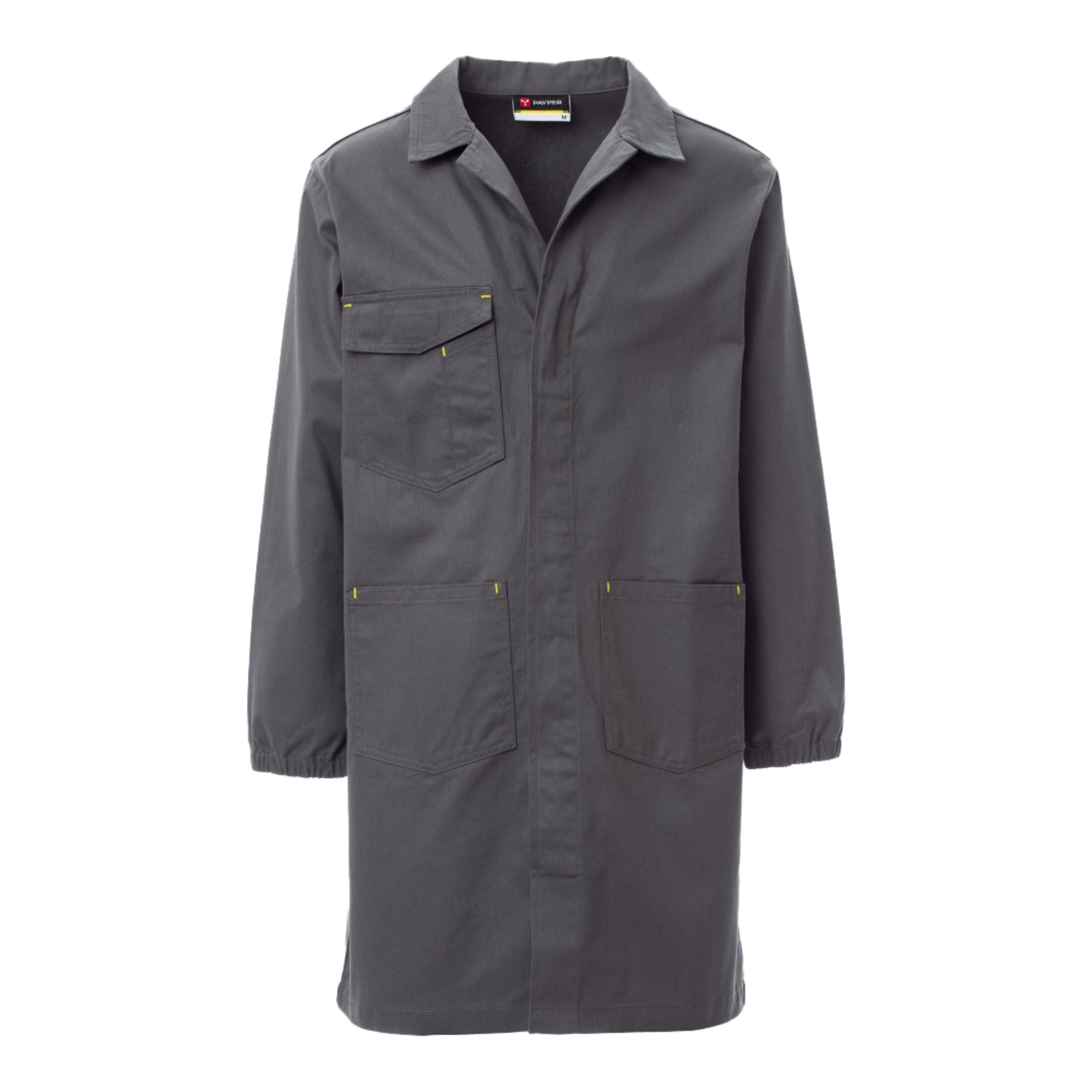 Camice con collo aperto, elastico ai polsi, chiusura frontale con bottoni coperta. Dotato di due tasche applicate in vita e una tasca al petto con scomparti per smartphone, badge e penna, con patta di chiusura in velcro.