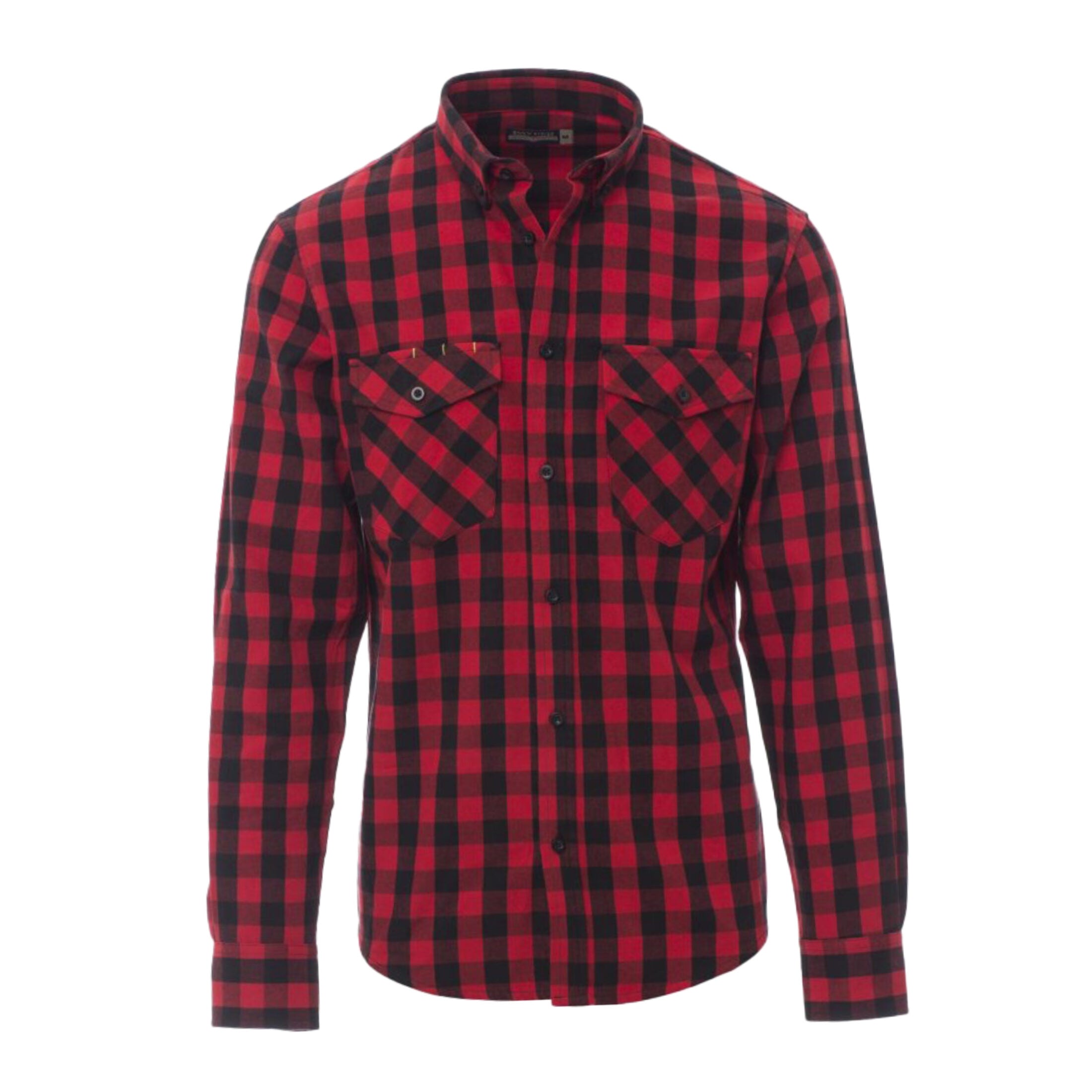 Camicia scozzese a manica lunga con bottoni effetto perlato, colletto modello botton down inglese, carré posteriore e due tasche al petto chiuse da patta con bottoni e porta penne.