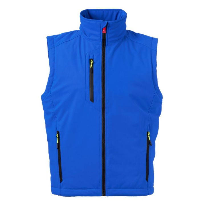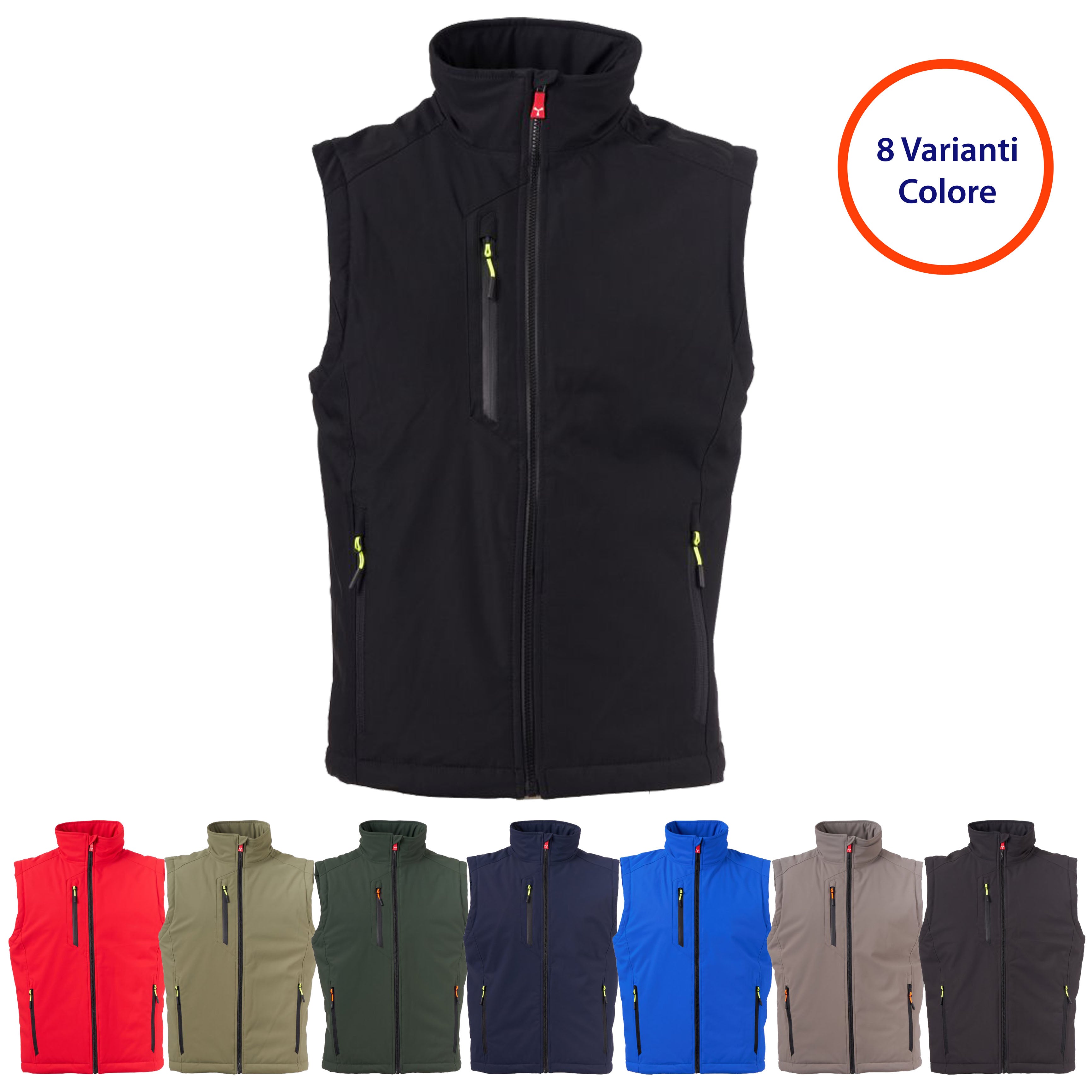 Gilet softshell professionale da uomo a 3 strati con media imbottitura da 140 g/m², ideale per utilizzo lavorativo nelle mezze stagioni e in inverno moderato. Impermeabile fino a 8000 mm H₂O e traspirante 5000 g/m² 24h, offre protezione da pioggia e vento mantenendo comfort termico. Dotato di chiusura con zip SBS con cursore in metallo “semi-auto lock” e tiretto personalizzato.