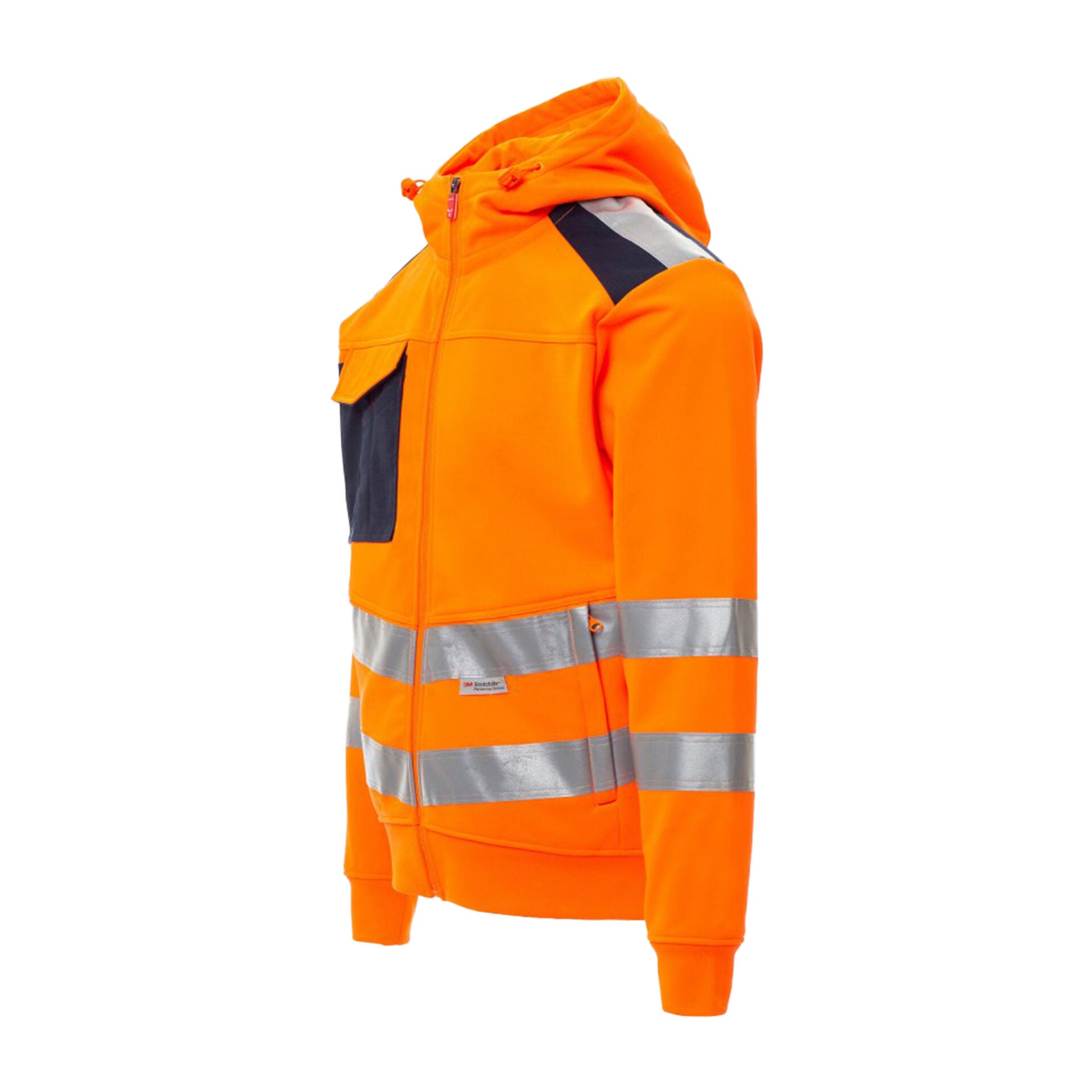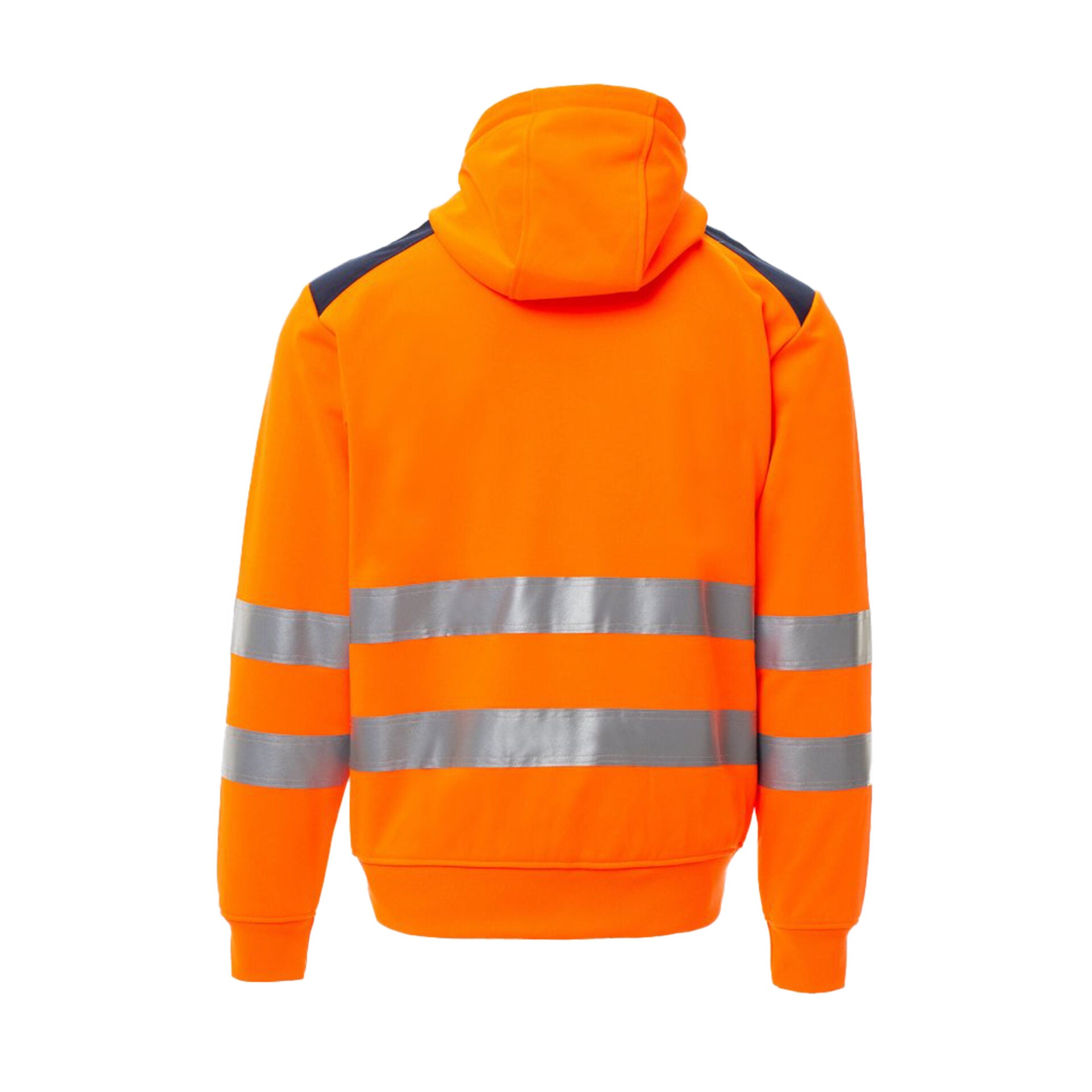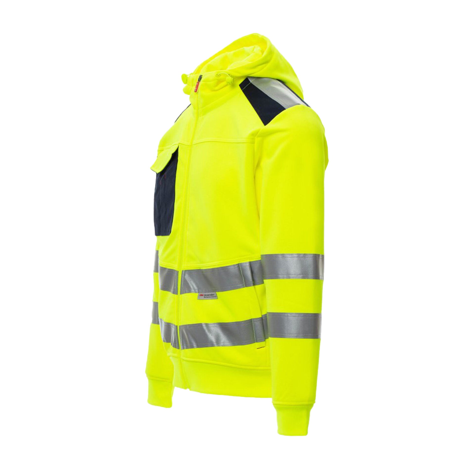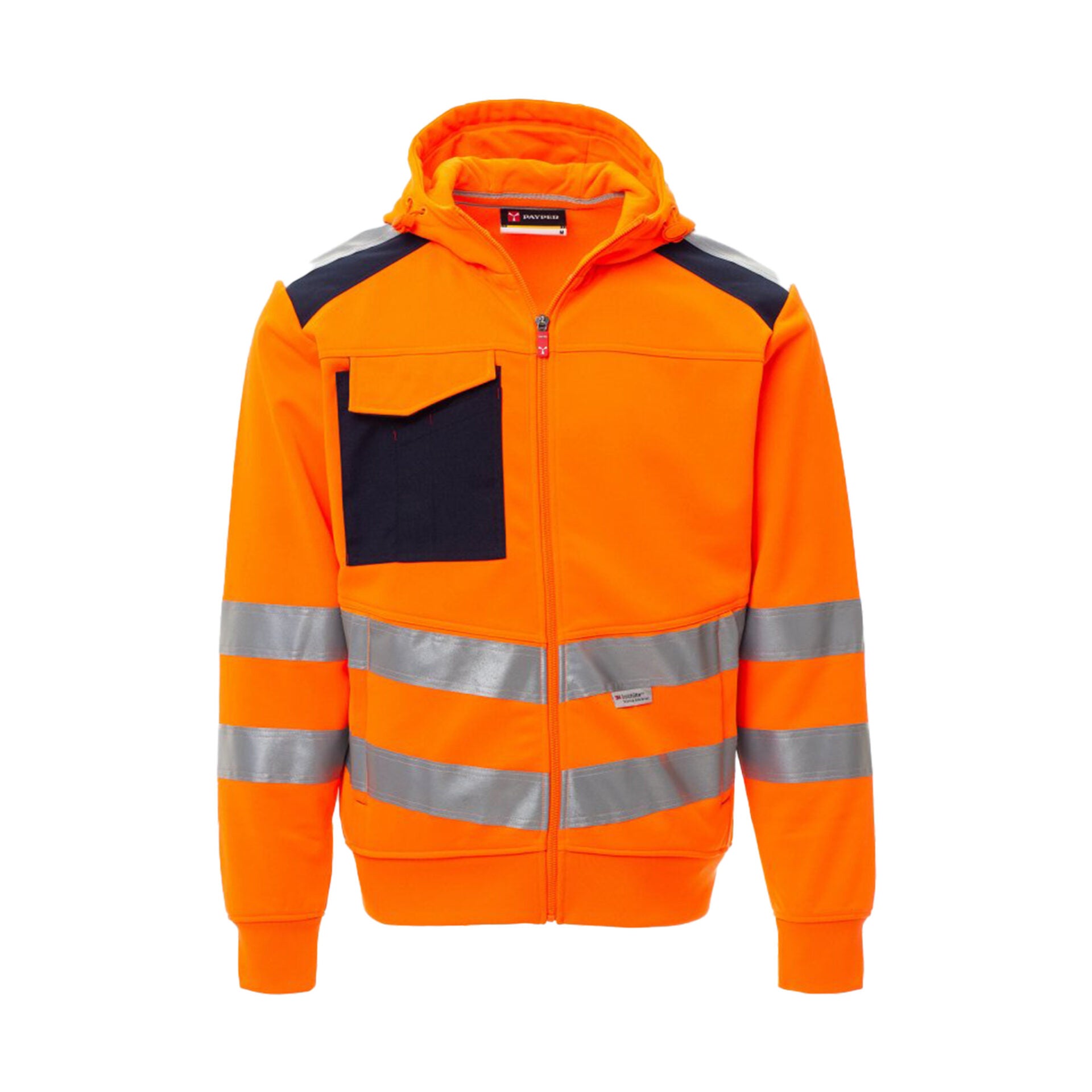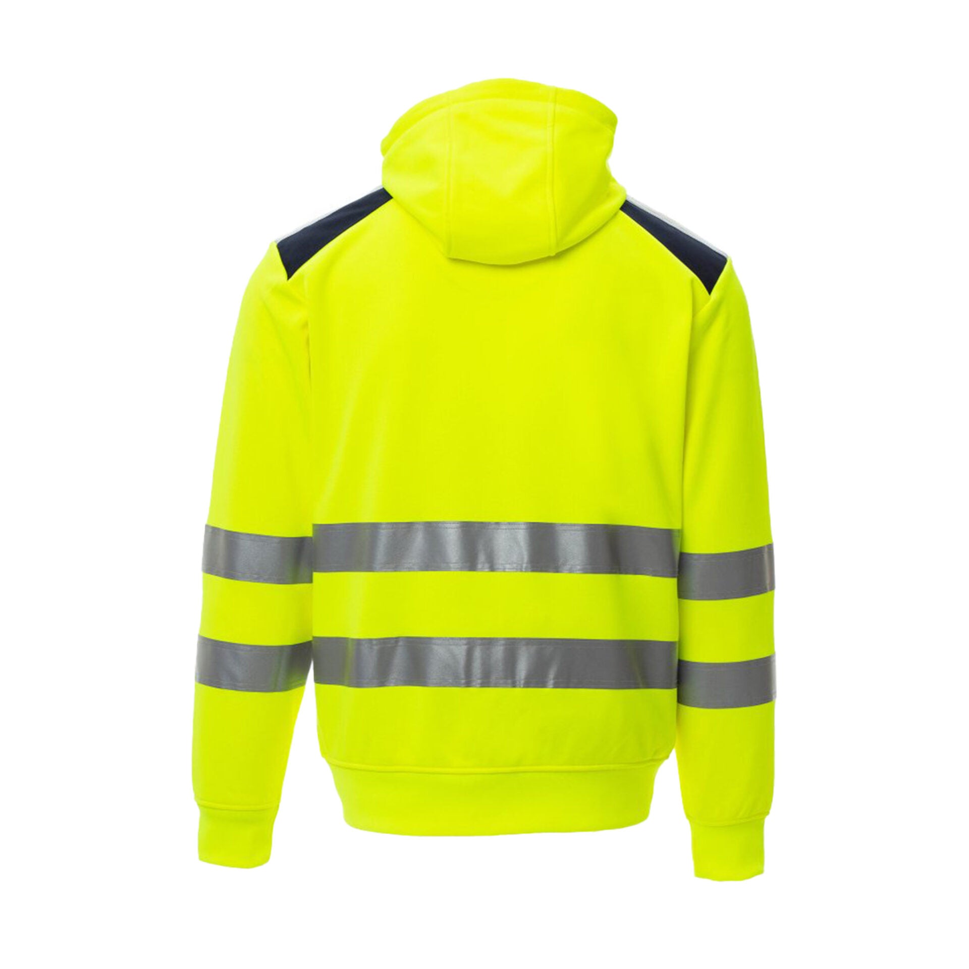Felpa da uomo in alta visibilità con cappuccio e bande riflettenti. Chiusura con zip intera SBS dotata di cursore in metallo autolock, polsini e vita in costina elasticizzata. Due tasche frontali con zip coperta e una tasca multifunzione al petto con anello porta badge e patta di chiusura LOCK SYSTEM.