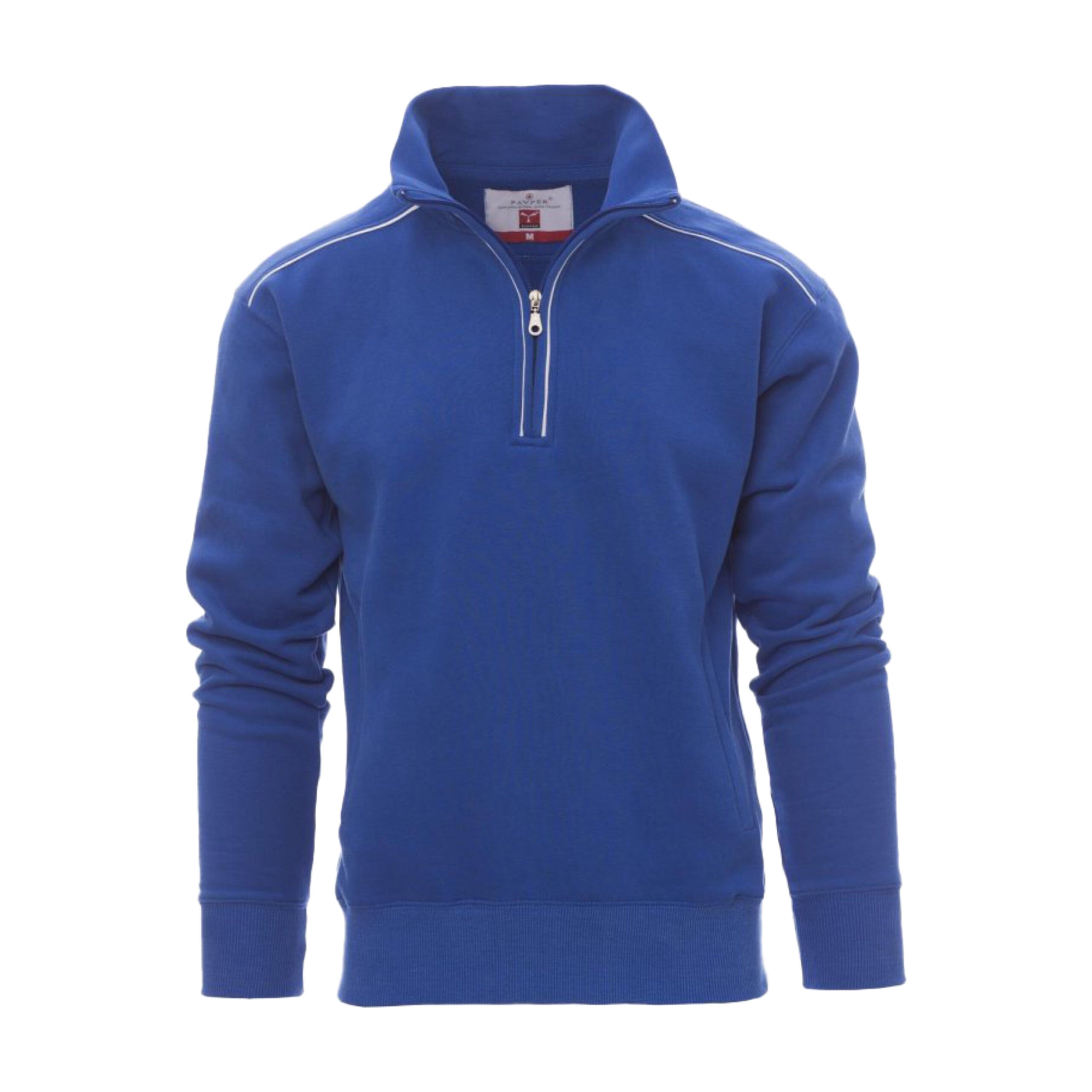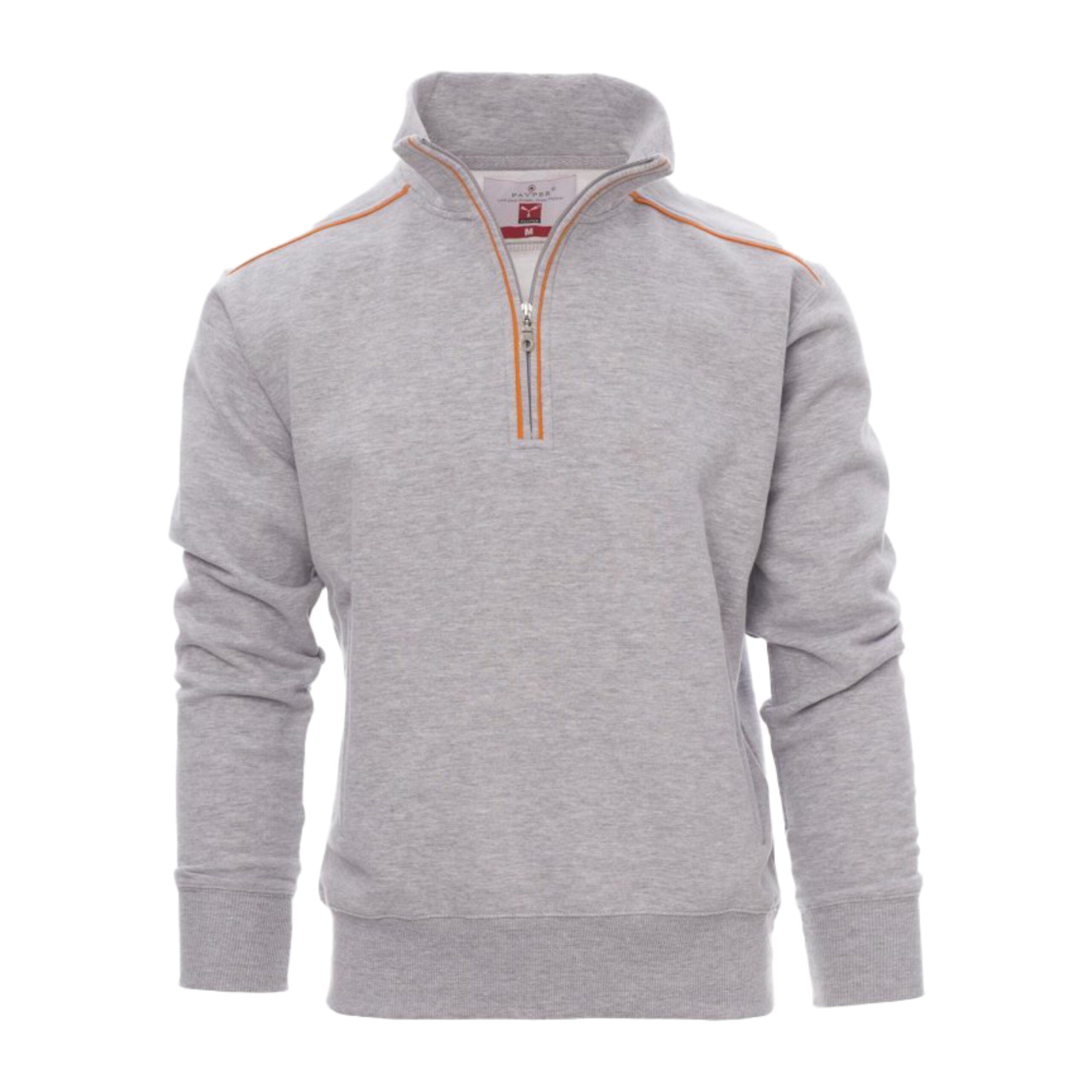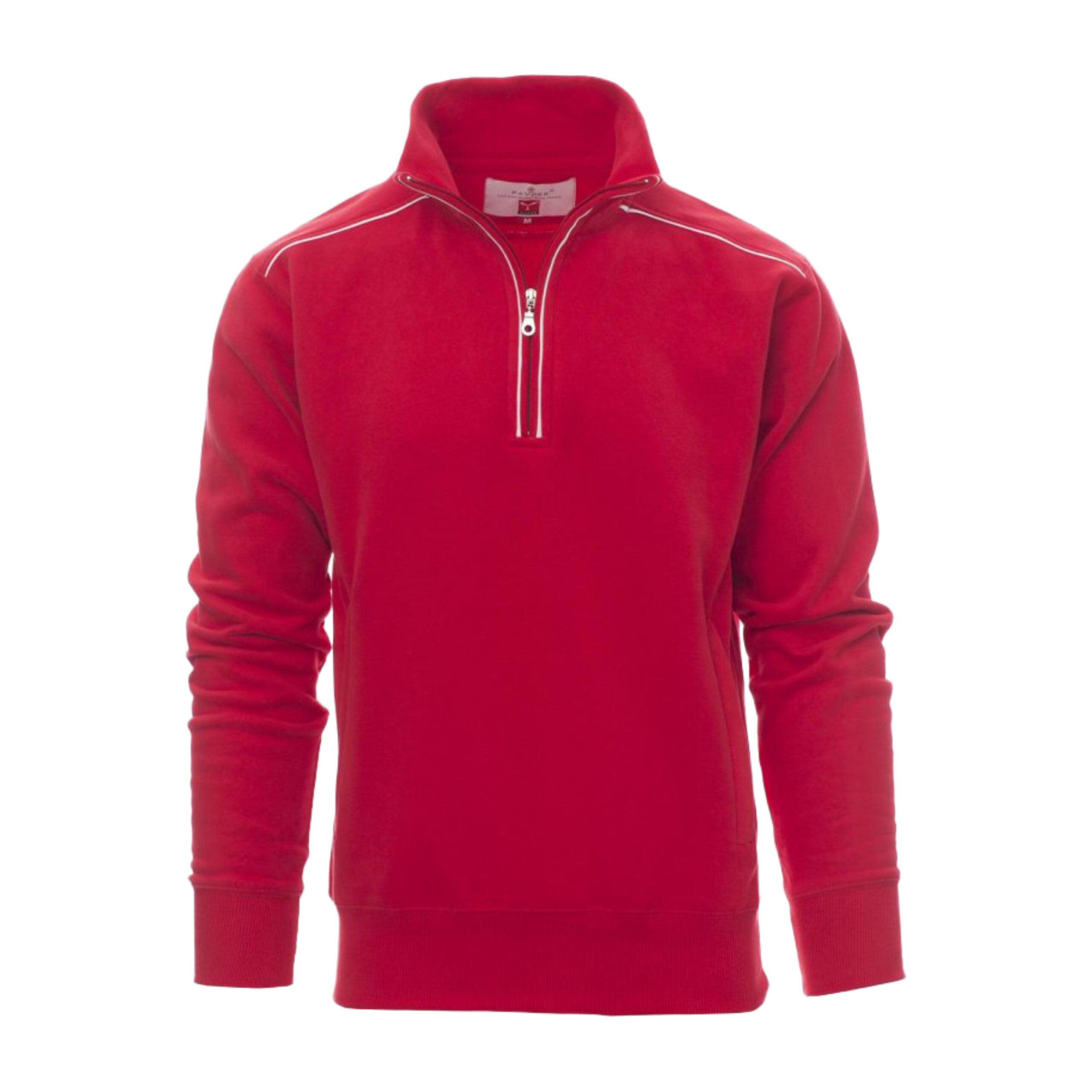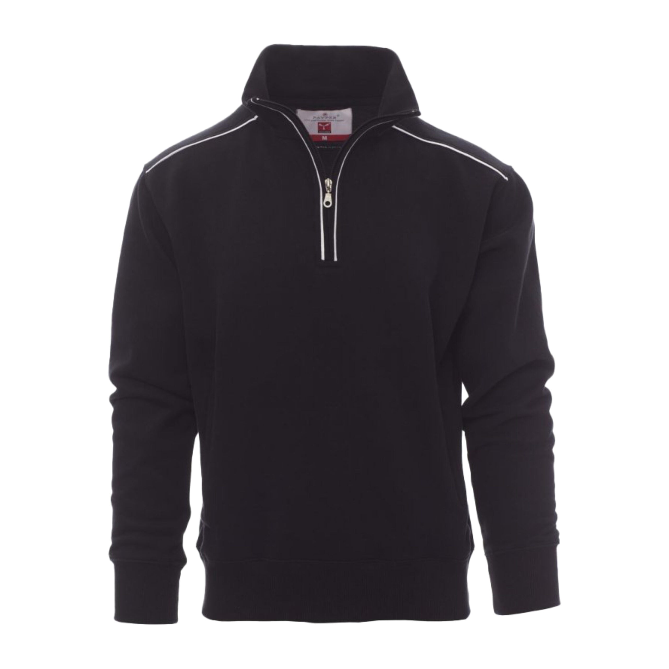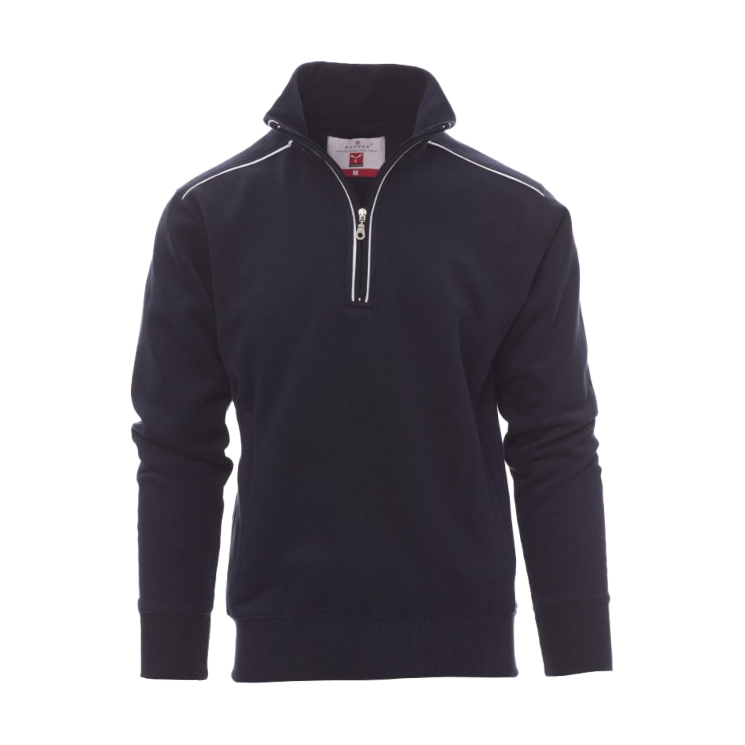 Felpa da uomo con mezza zip in tinta (in plastica con cursore in metallo), ideale per ambienti lavorativi. Presenta profili a contrasto su spalle, bordo cerniera e schiena. Completano il capo due tasche con zip, polsini e vita in costina elasticizzata per un maggior comfort.