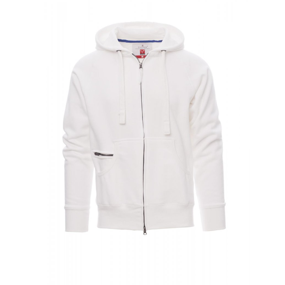 Felpa da uomo con zip intera SBS coperta in plastica, dotata di doppio cursore in metallo per una maggiore praticità. Il cappuccio è realizzato con doppia cucitura ed è completato da coulisse bianca in corda con cuciture in tinta e anelle in metallo, per un look curato e funzionale.