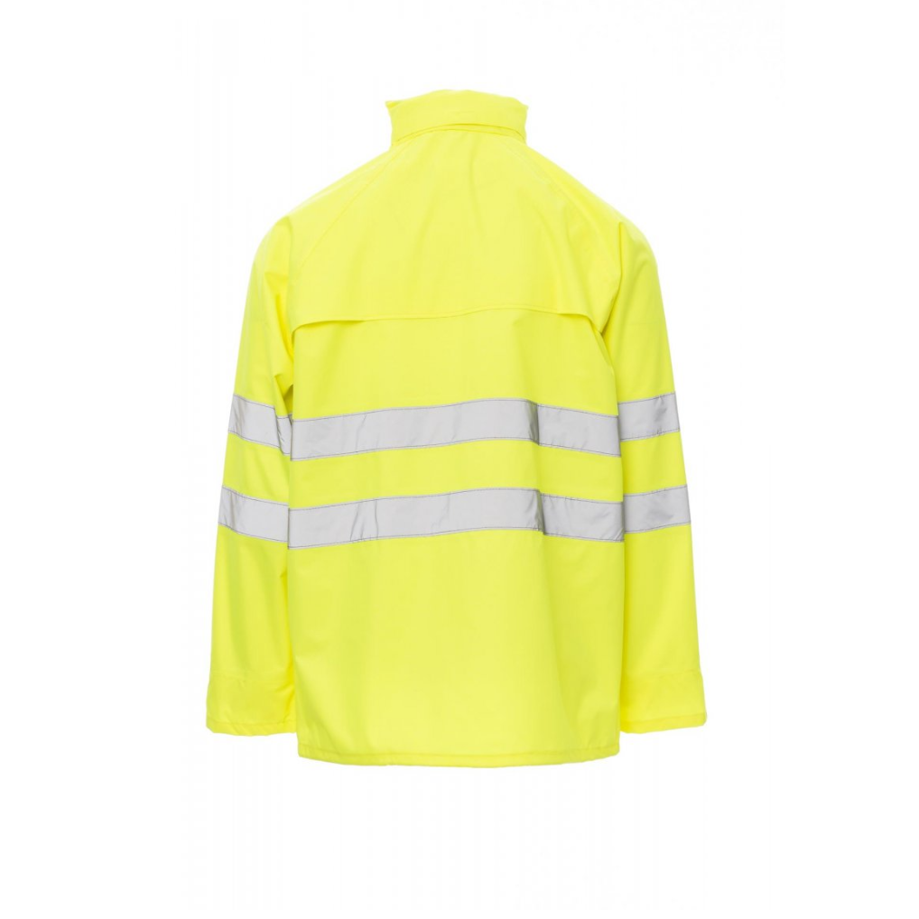 Giacca antipioggia alta visibilità con bande riflettenti 3M e spalmatura in PU. Ideale per lavori in ambienti esterni, garantisce impermeabilità, sicurezza e comfort. Dotata di maniche raglan per una migliore mobilità, zip intera in nylon coperta da patta con bottoni automatici e cappuccio richiudibile nel colletto.