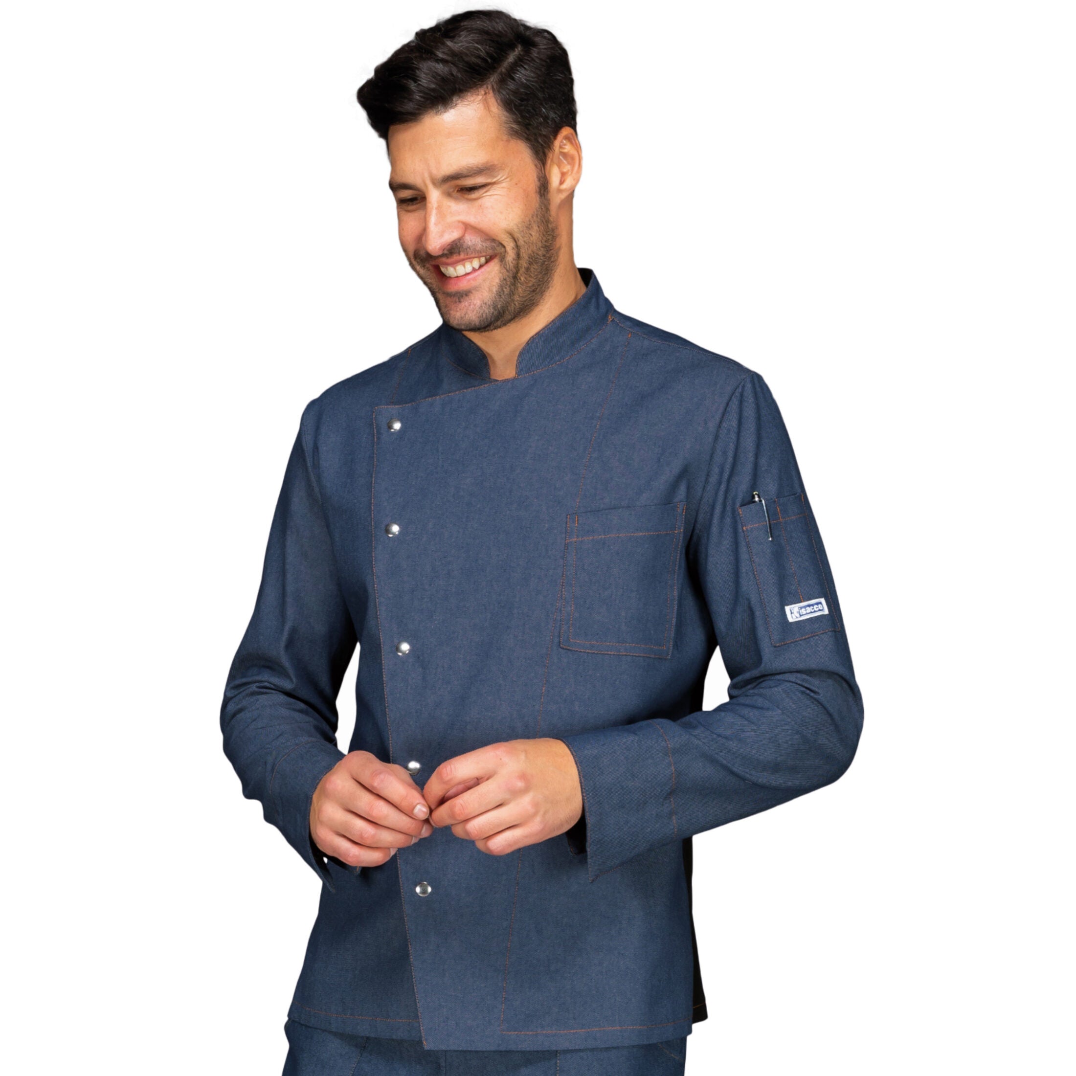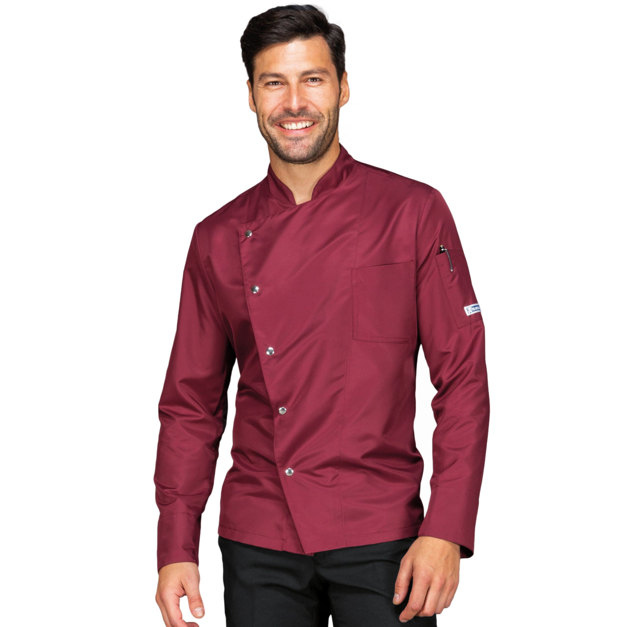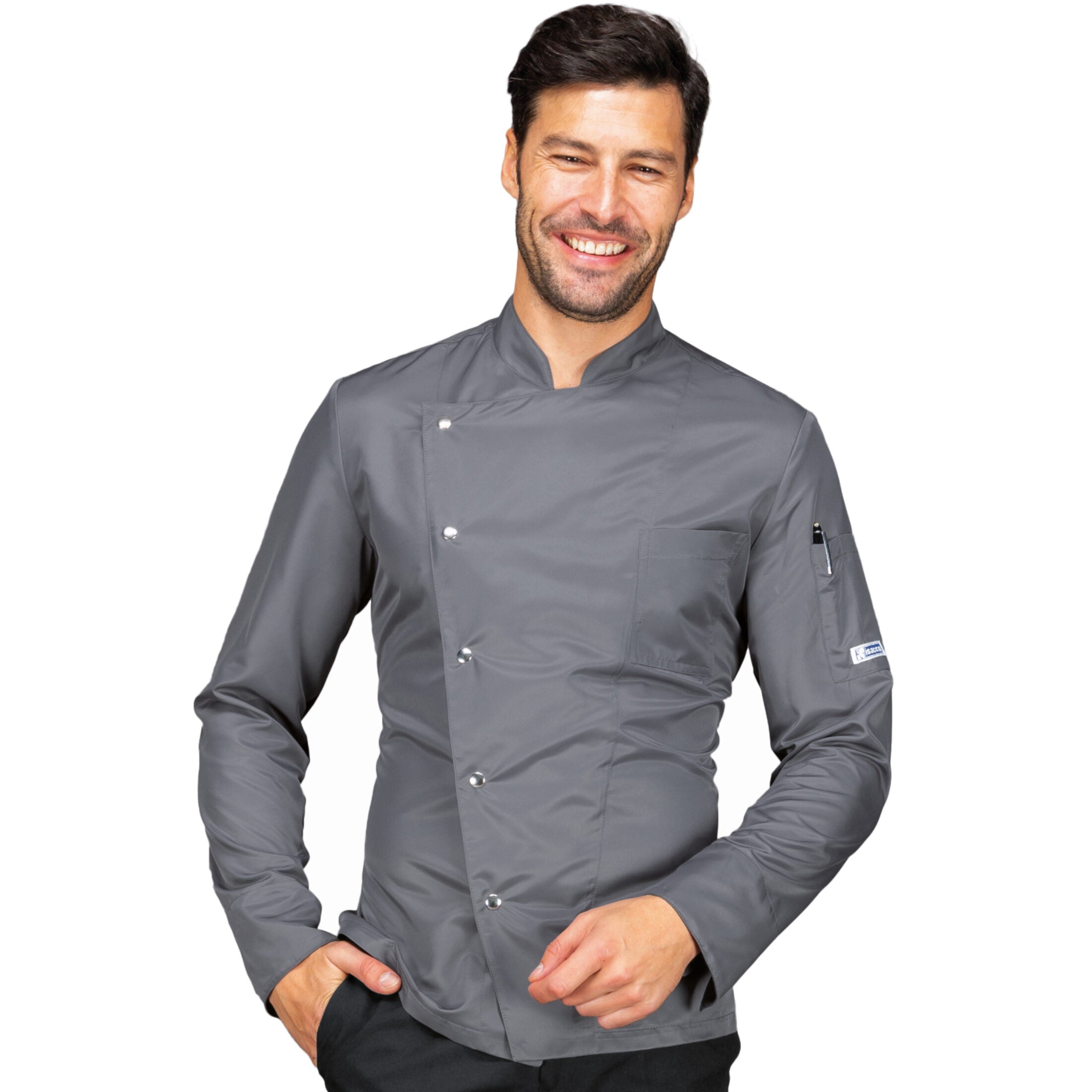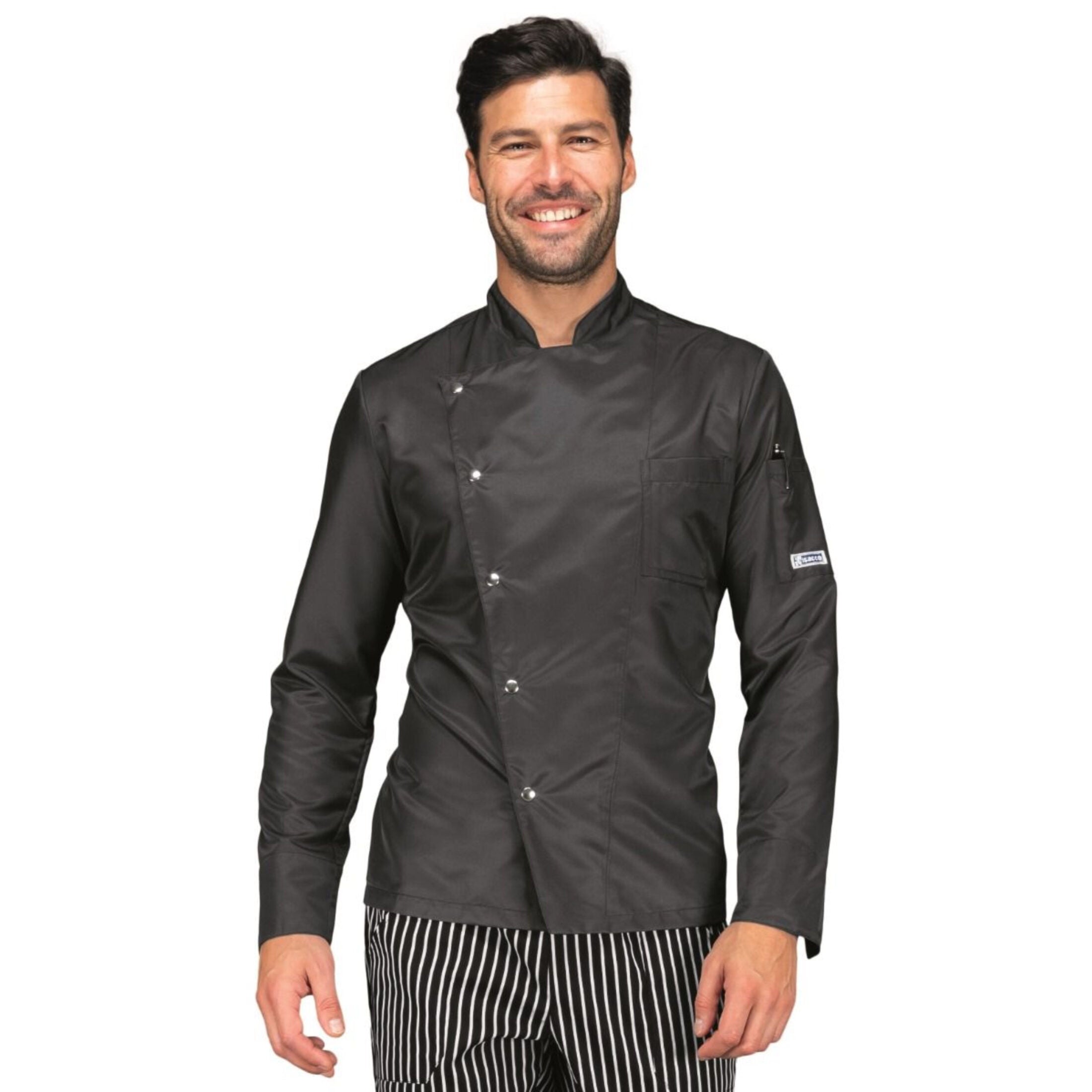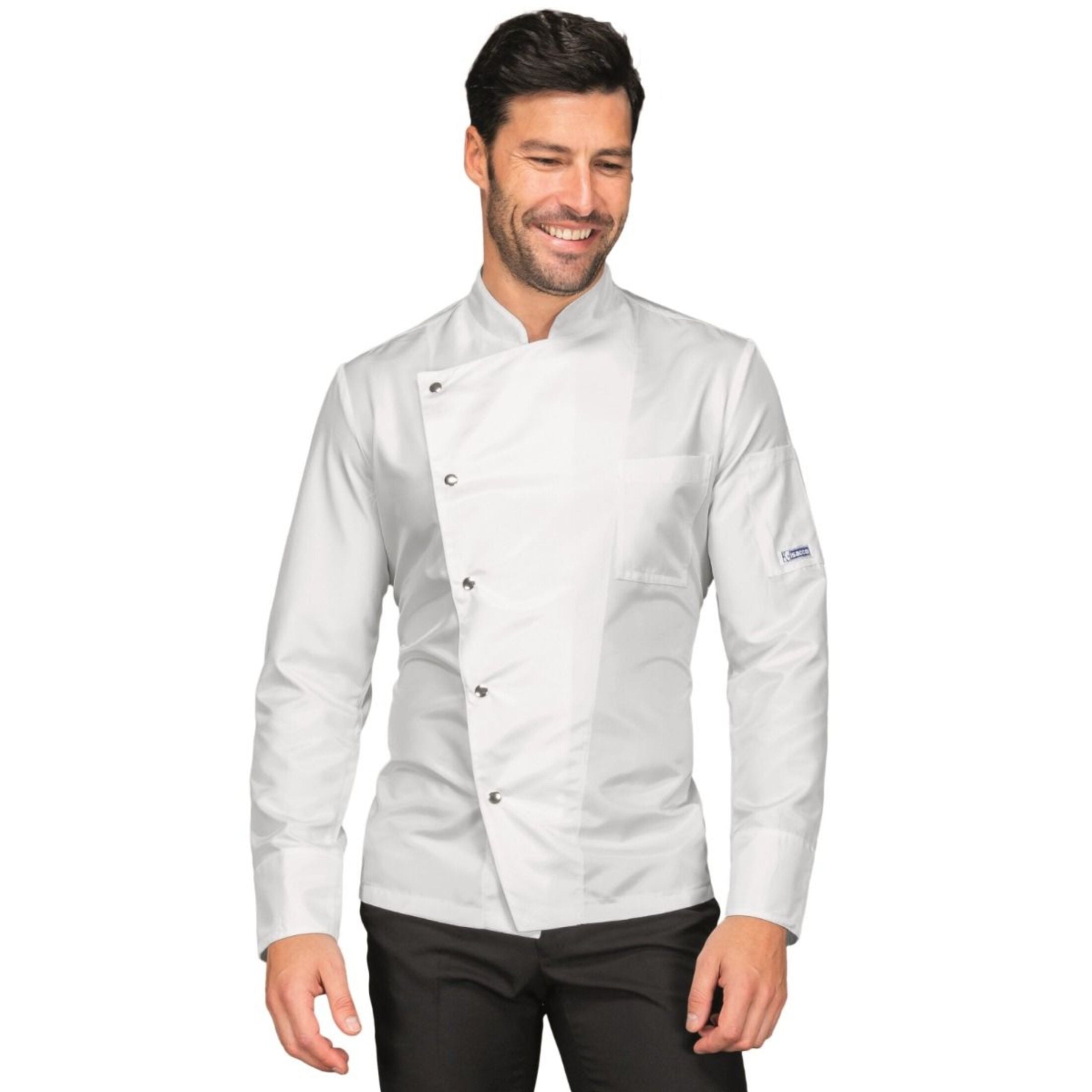 Giacca da cuoco slim unisex Isacco Belfast a manica lunga, progettata per offrire comfort e stile in cucina. Perfetta per chef professionisti, studenti di scuola alberghiera e personale della ristorazione. Realizzata in poliestere Superdry e cotone, è leggera, traspirante e resistente. Dotata di bottoni a pressione e due tasche funzionali: una sul petto e una sul braccio.