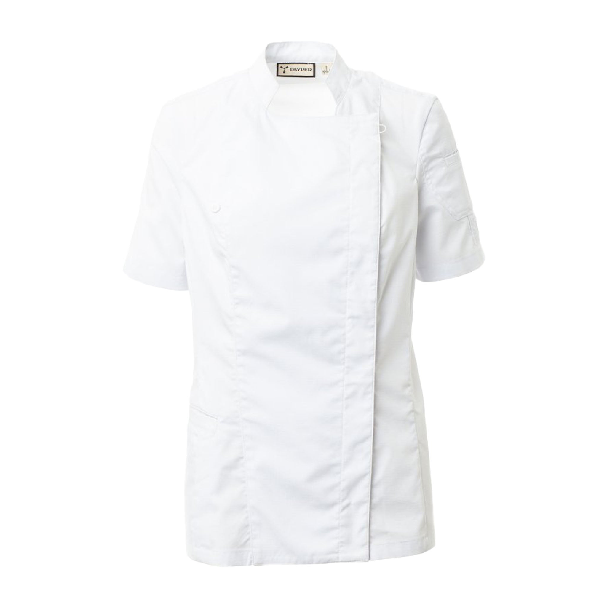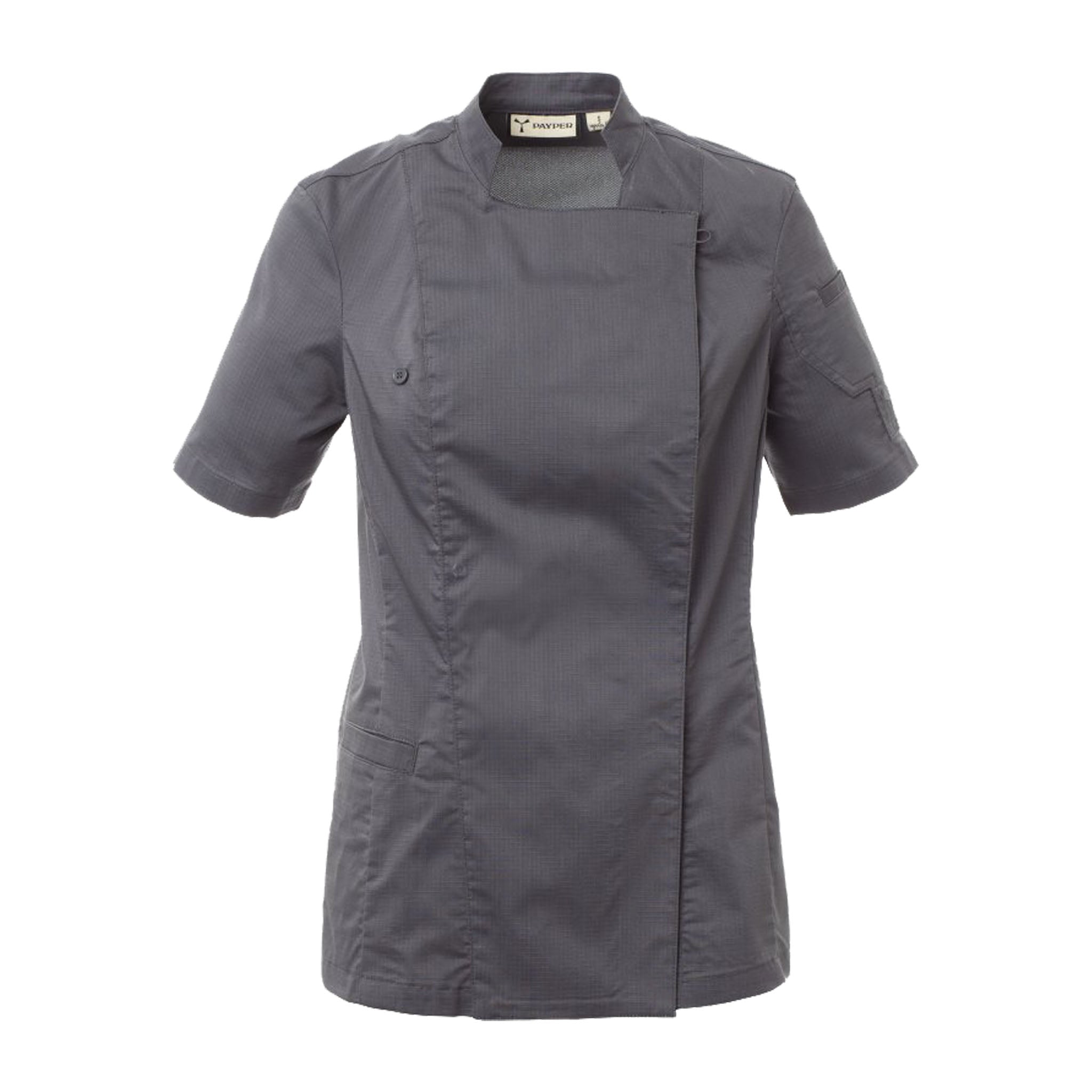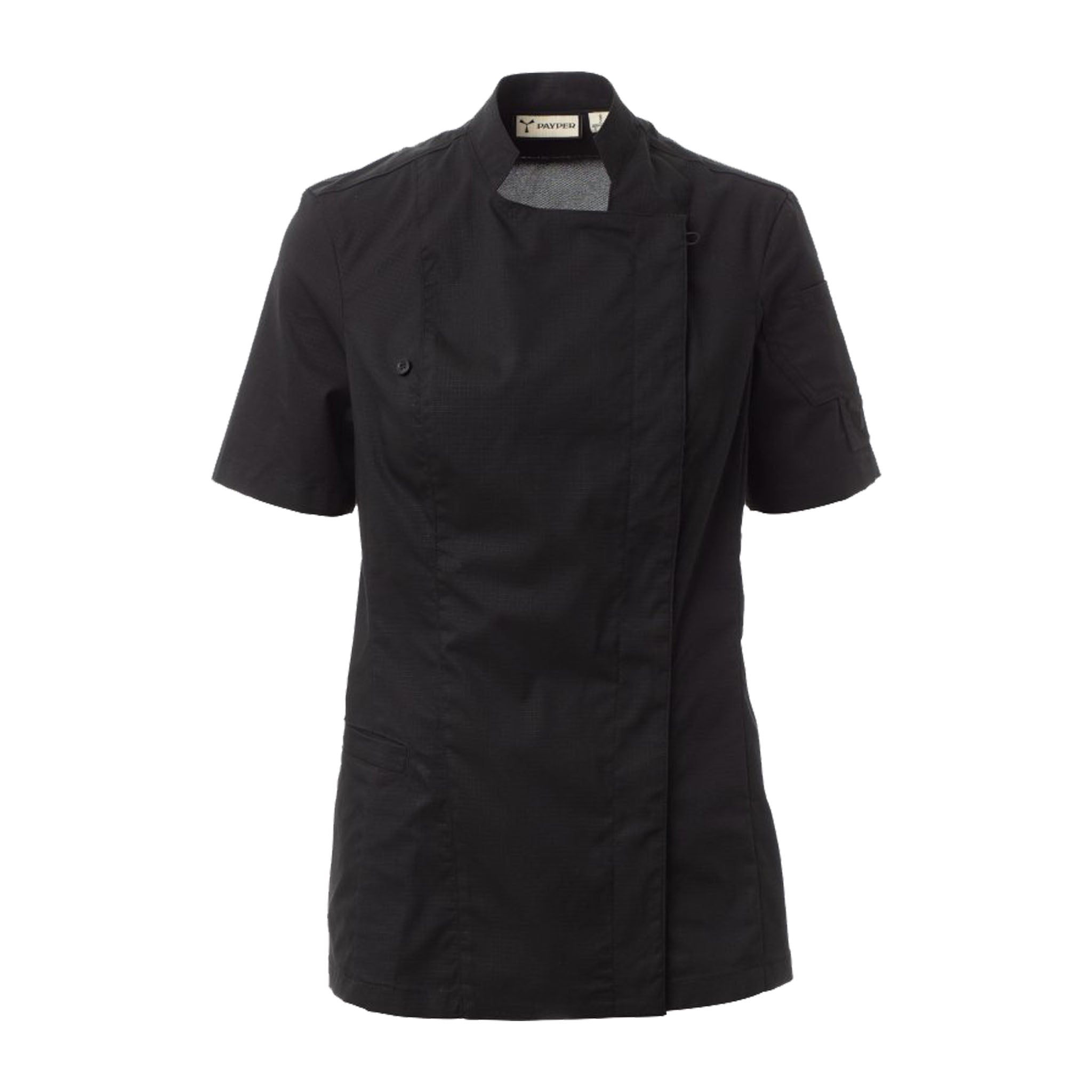 Giacca da donna con collo alla coreana, realizzata in tessuto Ripstop di cotone e Lycra® T400® per un'eccellente elasticità e traspirabilità. La schiena è dotata di rete traspirante per un comfort maggiore nelle ore di lavoro. La chiusura è a doppio petto con bottoni automatici e presenta un lembo ripiegabile con bottone a vista, che crea un elegante scollo a V effetto bavero sartoriale. La manica è corta con orlo pulito. Iconica toppa sagomata con ricamo ad elica tono su tono sulla spalla sinistra, dotata di taschino porta penne. In vita è presente una pratica tasca porta smartphone.