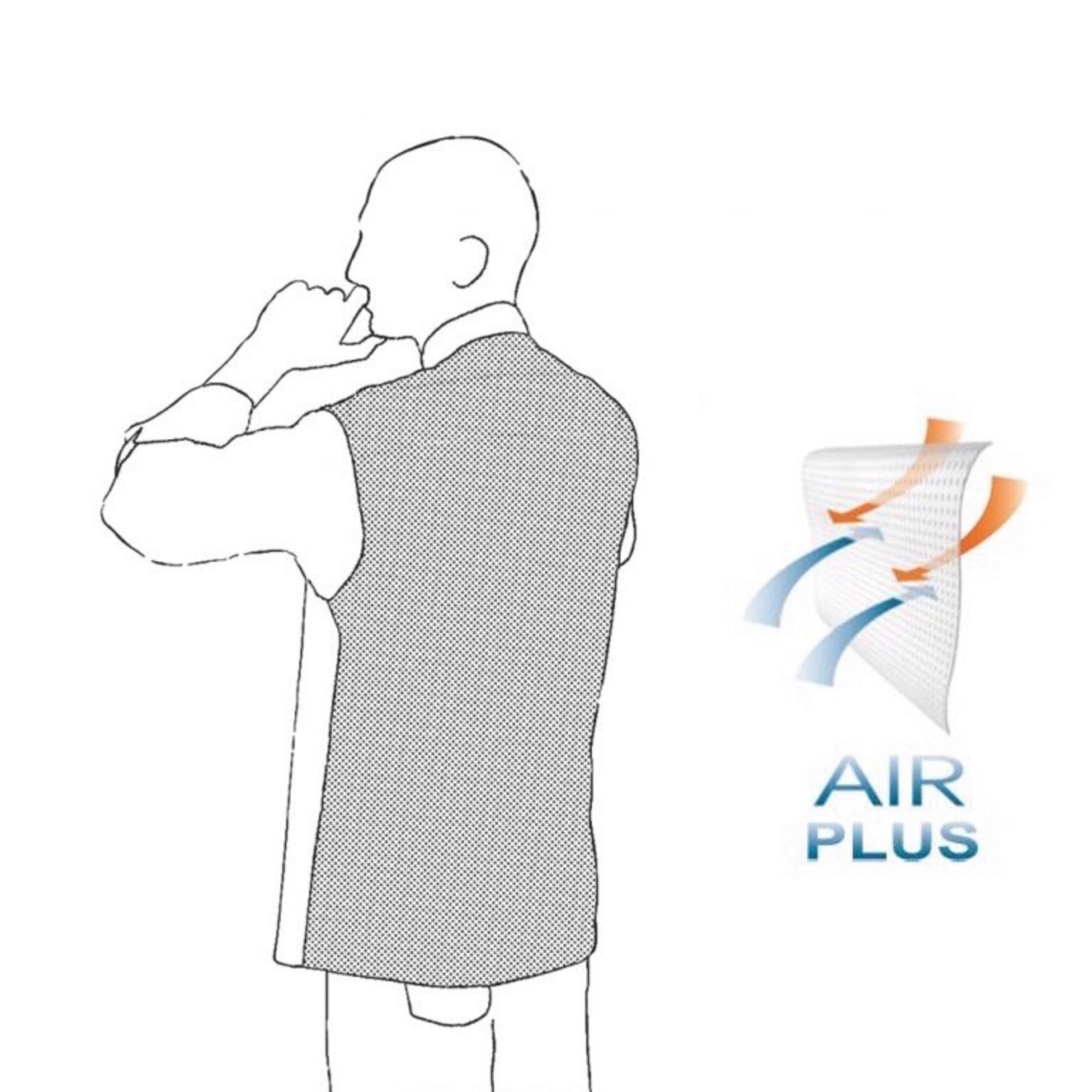 Realizzata in 100% microfibra da 130 g/m², è leggera, traspirante e impermeabile. Il pannello posteriore in Air Plus favorisce la ventilazione naturale per un maggiore comfort durante i turni intensi.