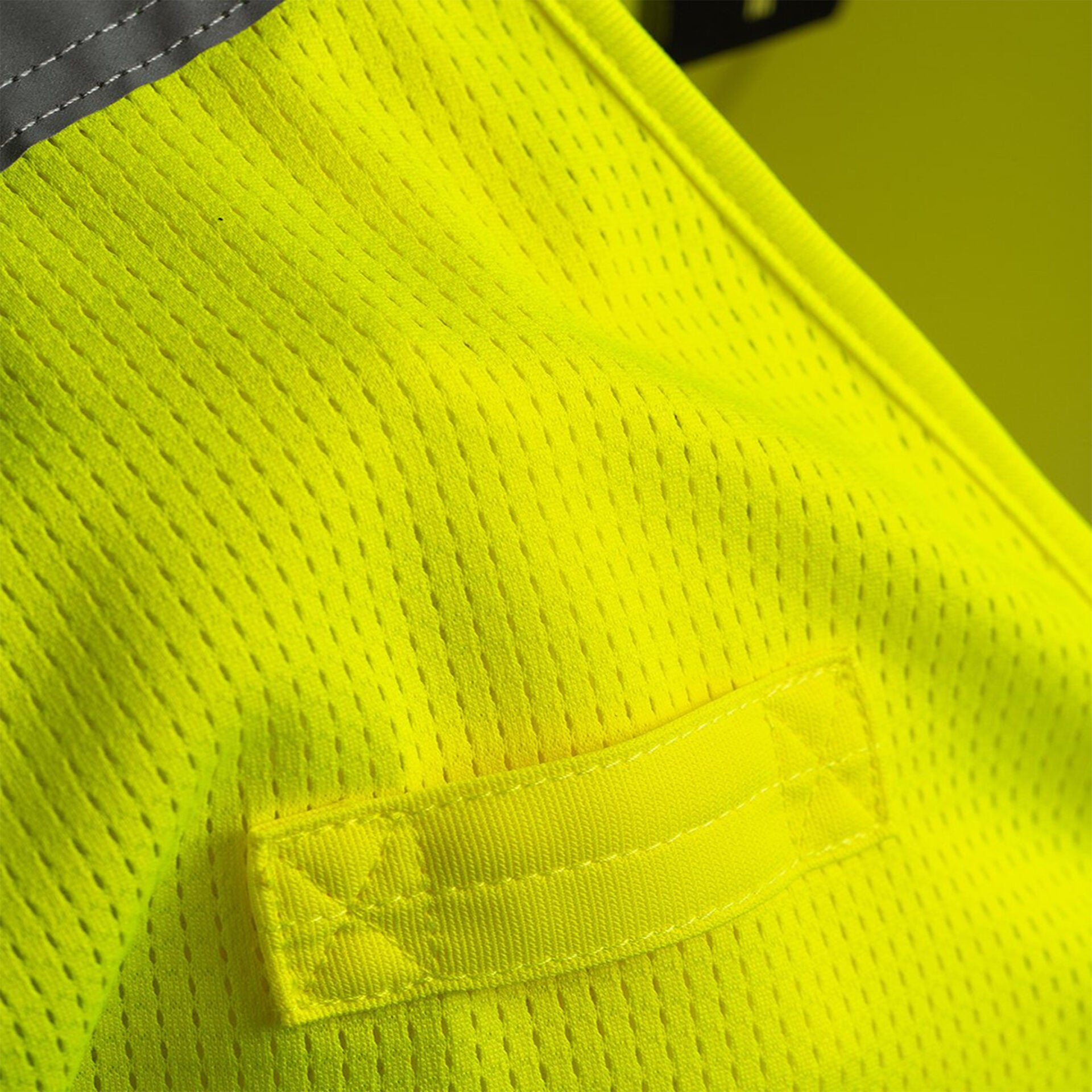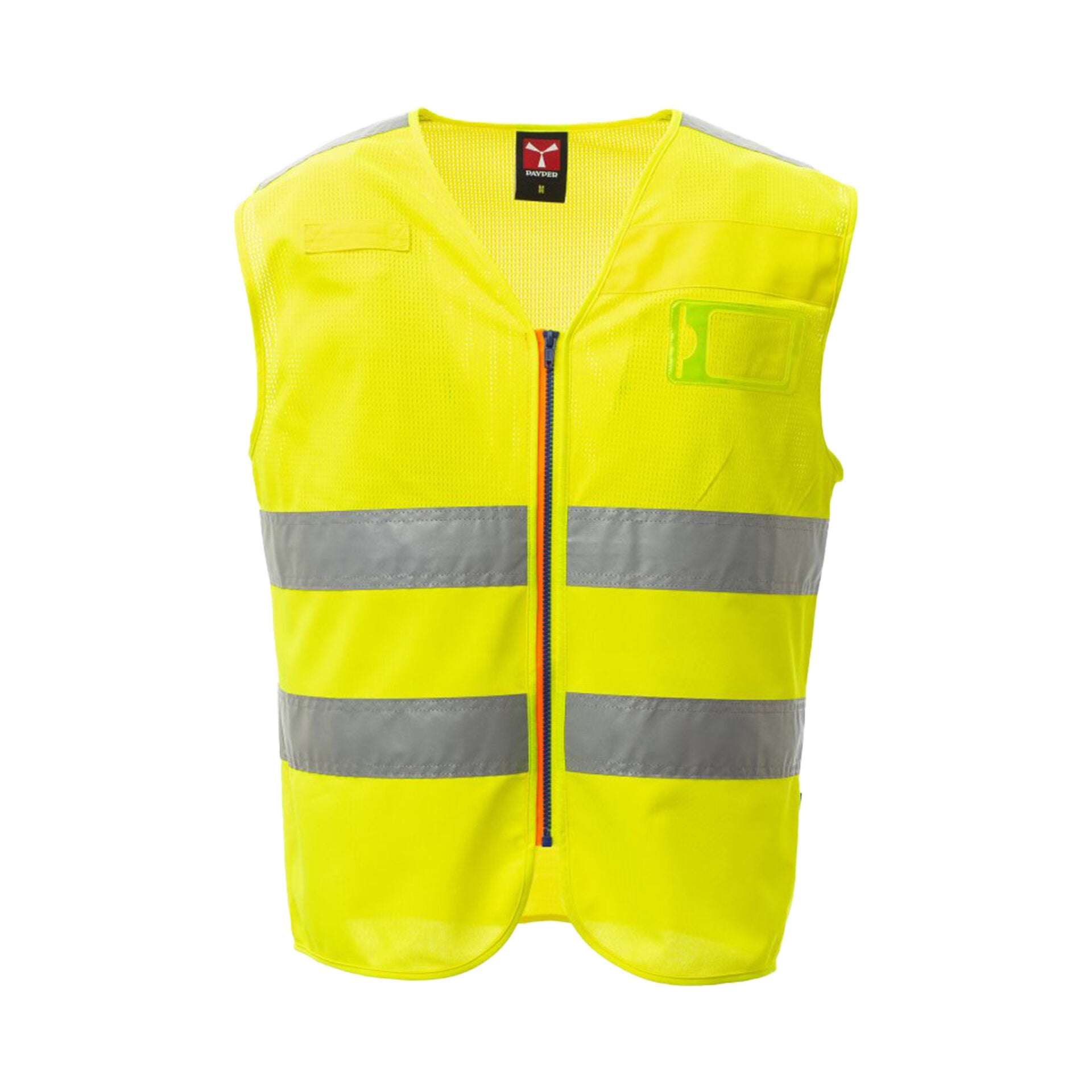 Gilet ad alta visibilità con design tecnico e funzionale. La parte superiore è realizzata in rete traspirante, mentre la parte inferiore in tessuto dry-tech. Dotato di bande retroriflettenti su spalle e corpo, chiusura frontale con zip SBS e nastro bicolore. Presente una banda in tessuto dry-tech per personalizzazione, porta badge fisso sul petto sinistro e passante multifunzione sul petto destro.