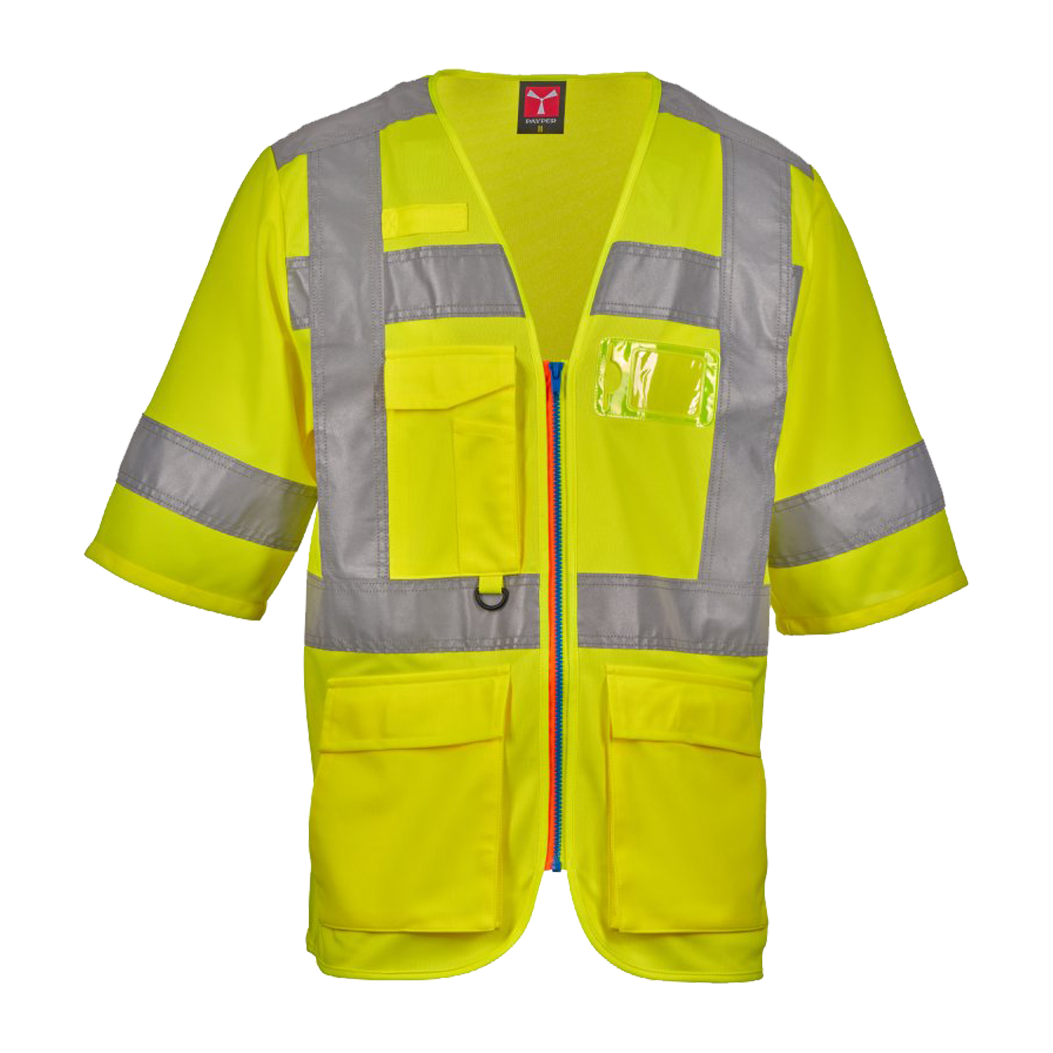 Gilet con manica corta alta visibilità in tessuto dry-tech, con bande retroriflettenti orizzontali e verticali per massima visibilità. Design stile giacca con zip bicolore, porta badge fisso e dettagli multifunzione per il lavoro. Acquista su fuccishop.