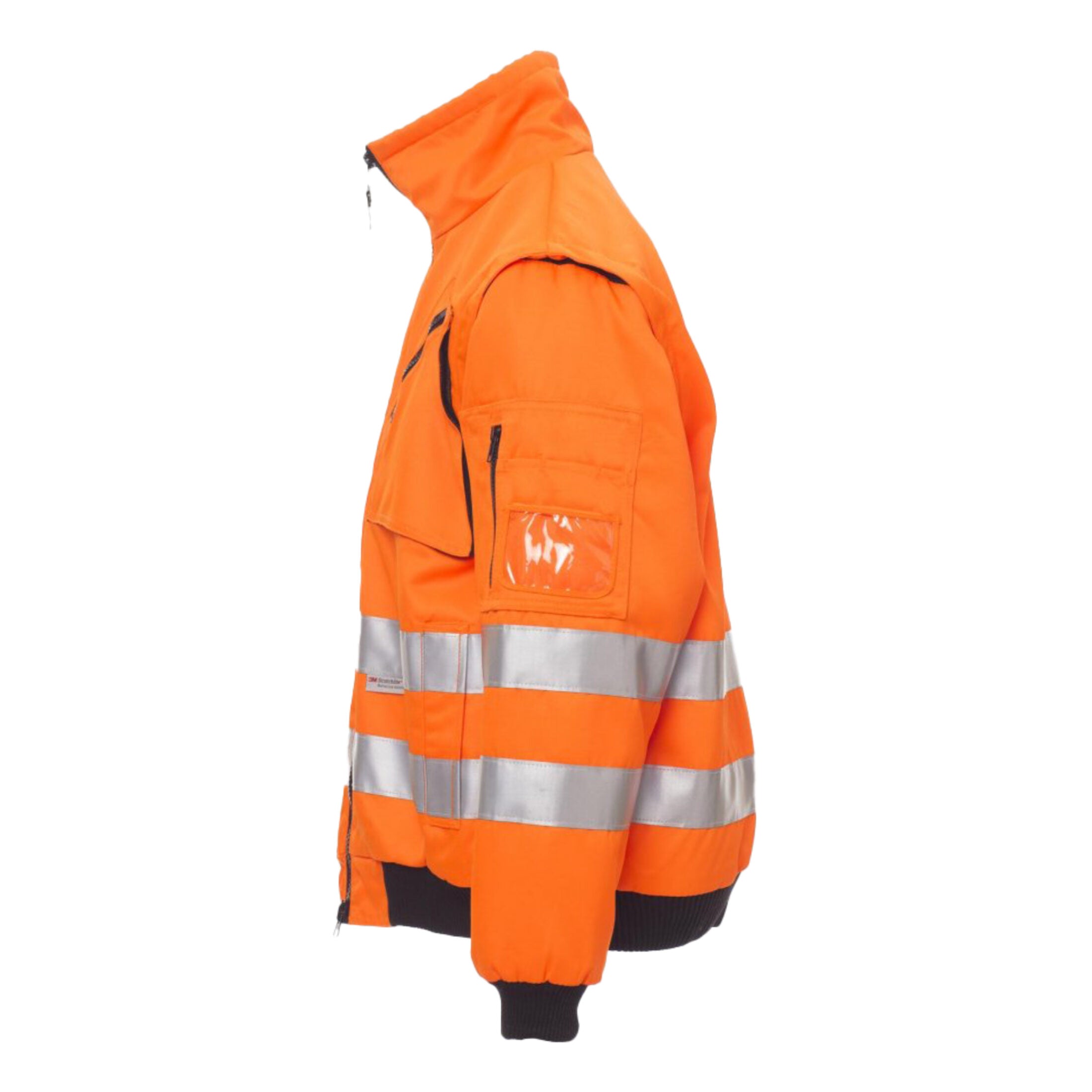 Giubbino in alta visibilità con bande 3M, maniche staccabili, zip 8mm in plastica con doppio cursore in metallo. Vita e polsini elasticizzati, due tasche frontali con zip, due tasche al petto con zip, portacellulare, una zip esterna sul lato cuore per facilitare stampe e ricami, una tasca multifunzione sulla manica. Interno in pile con una tasca interna e zip per personalizzazioni.