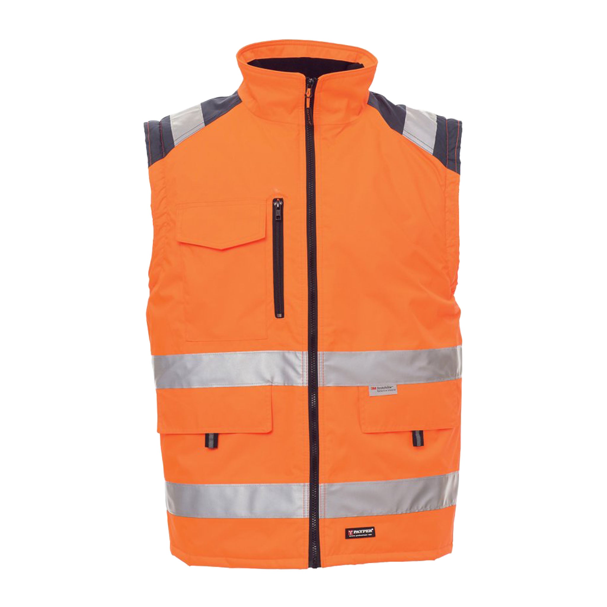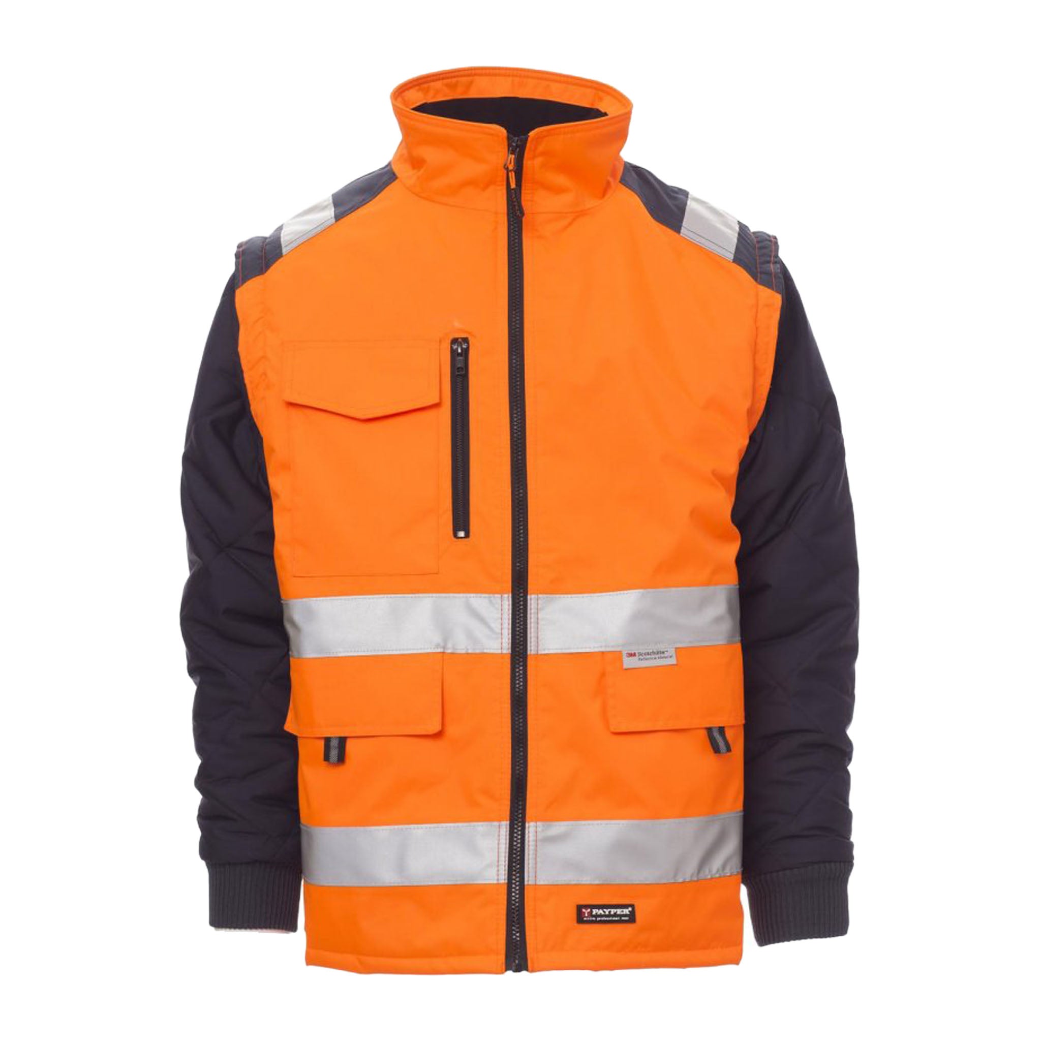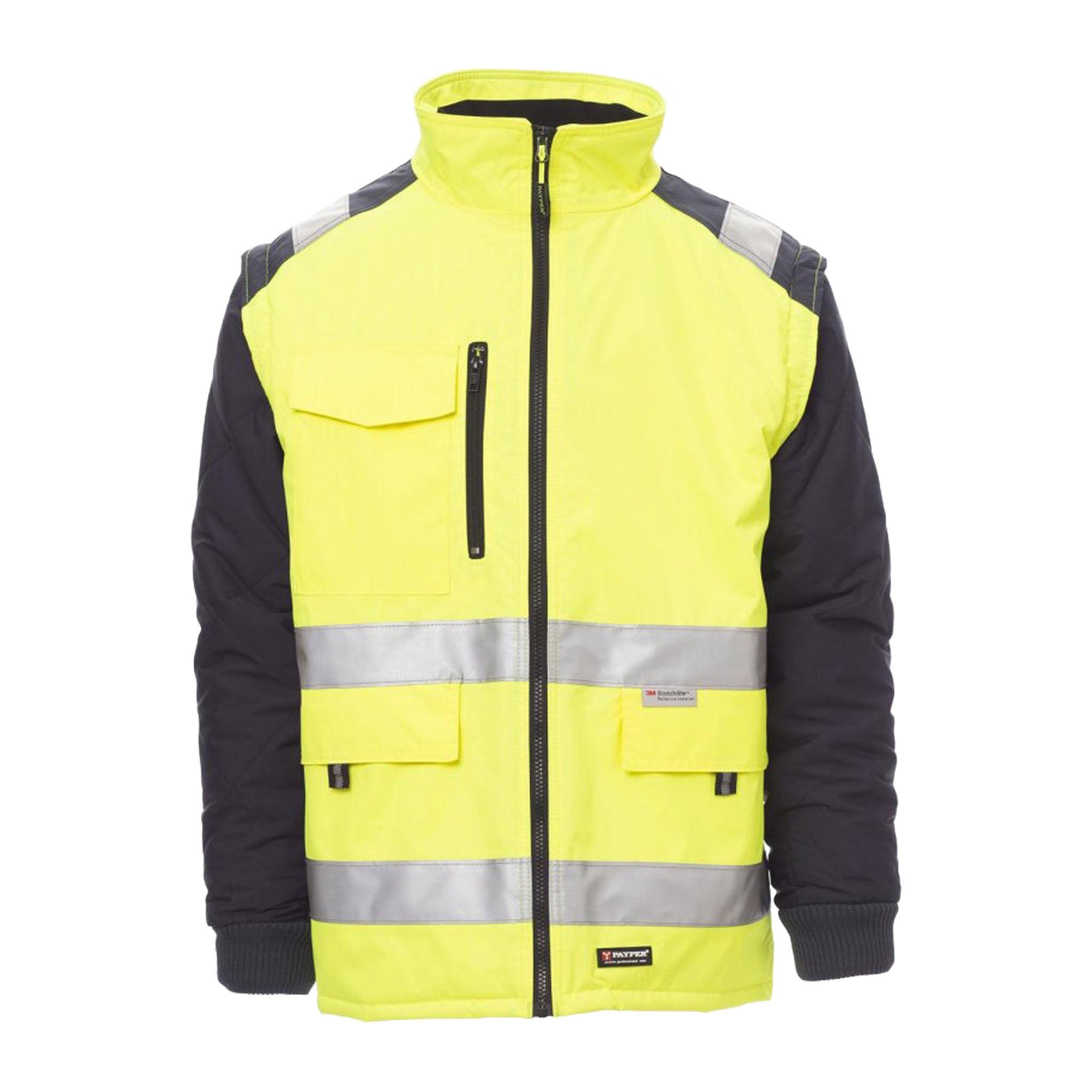 Giubbotto da lavoro ad alta visibilità, bicolore, con bande retroriflettenti. Apertura frontale con zip in plastica e cursore in metallo. Maniche a giro staccabili, polsini elasticizzati, colletto in pile e imbottitura interna non rimovibile. Il giubbotto include due tasche frontali con patta e velcro, una tasca al petto con patta e velcro, porta badge a scomparsa, porta cellulare e una zip laterale a contrasto. Internamente, una tasca aggiuntiva.
