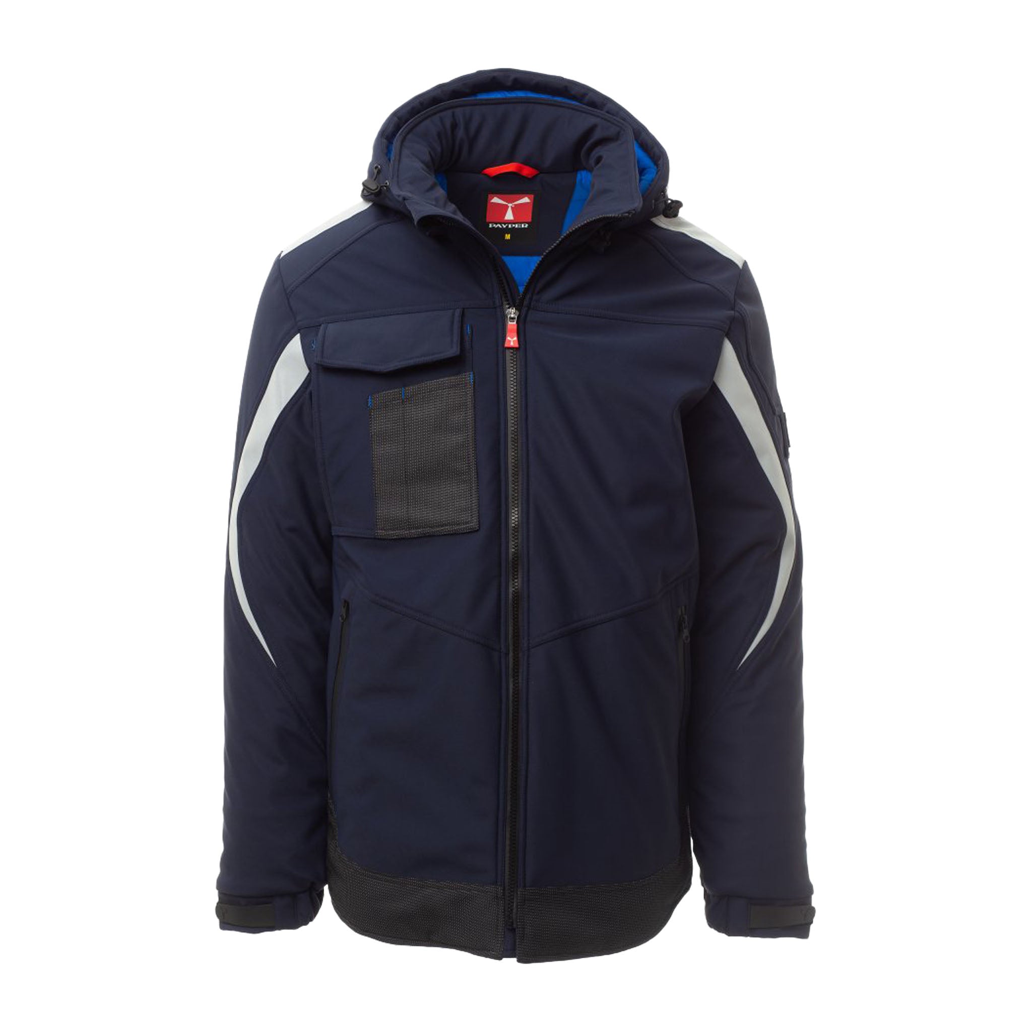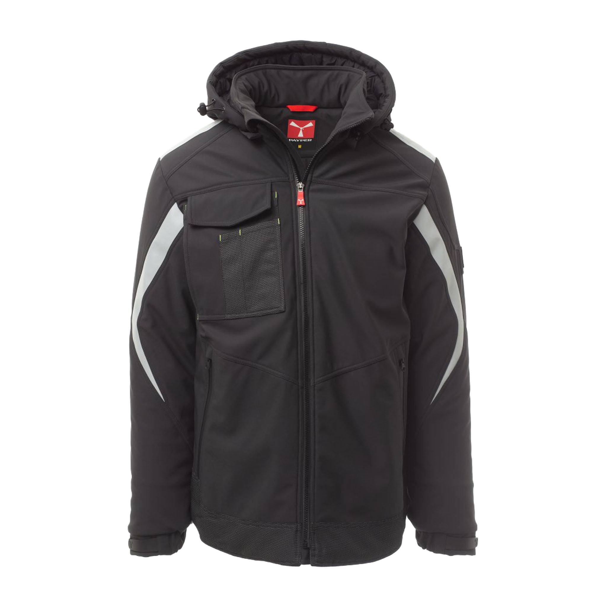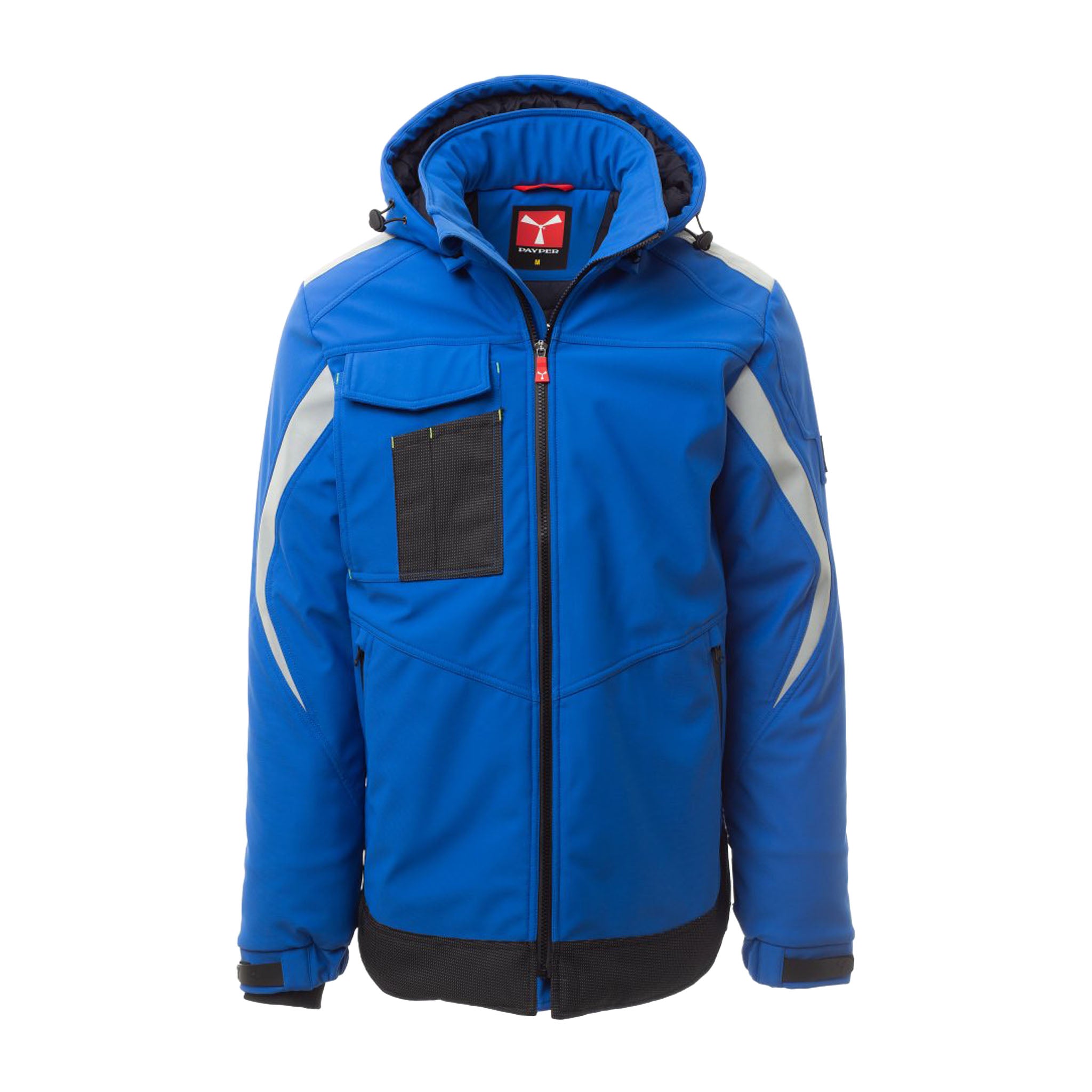 Soft-shell imbottito da uomo con chiusura tramite zip SBS con cursore in metallo "semi-auto lock" e tiretto personalizzato. Cappuccio removibile con coulisse regolabile, tessuto puntinato con effetto retroriflettente, polsini elasticizzati regolabili con velcro e polsino interno. Nastro retroriflettente su spalle e braccia per alta visibilità.