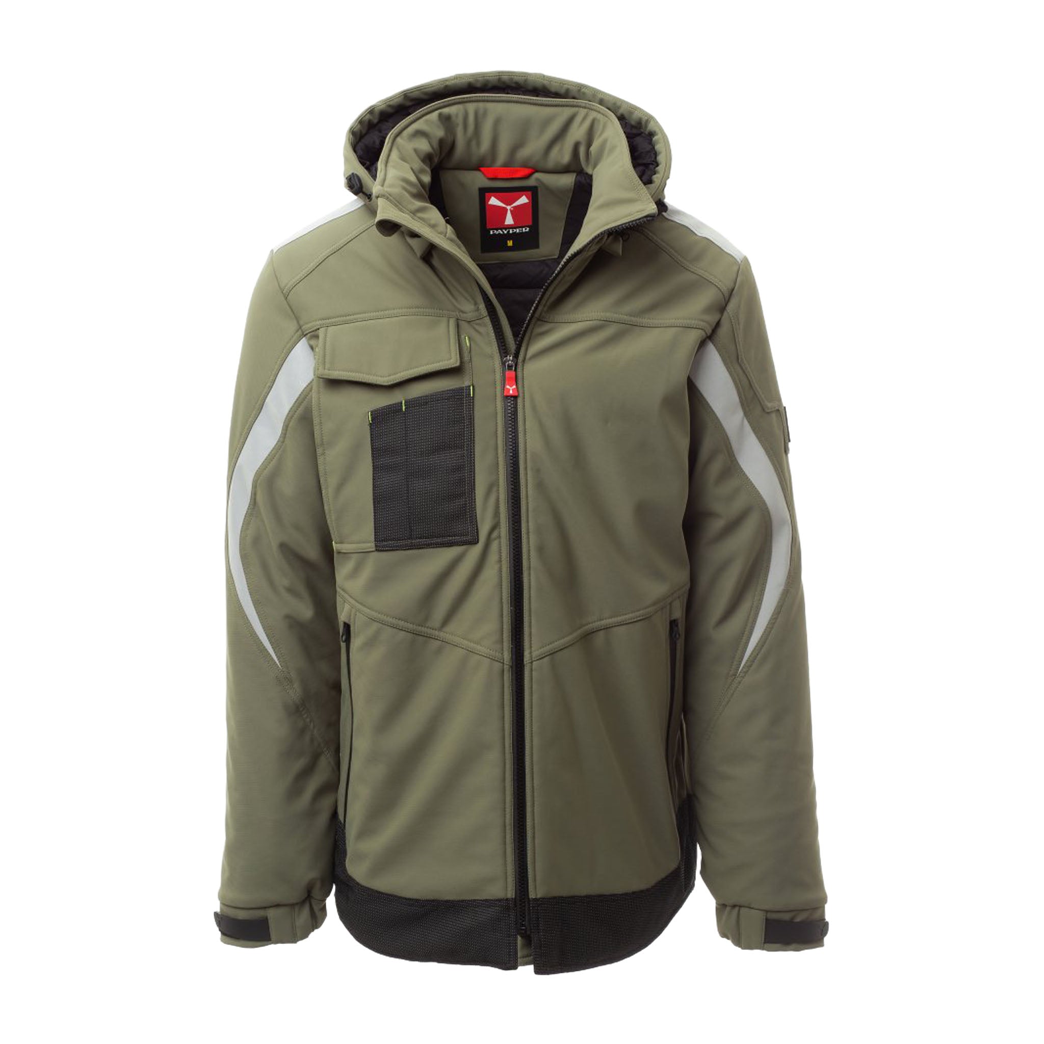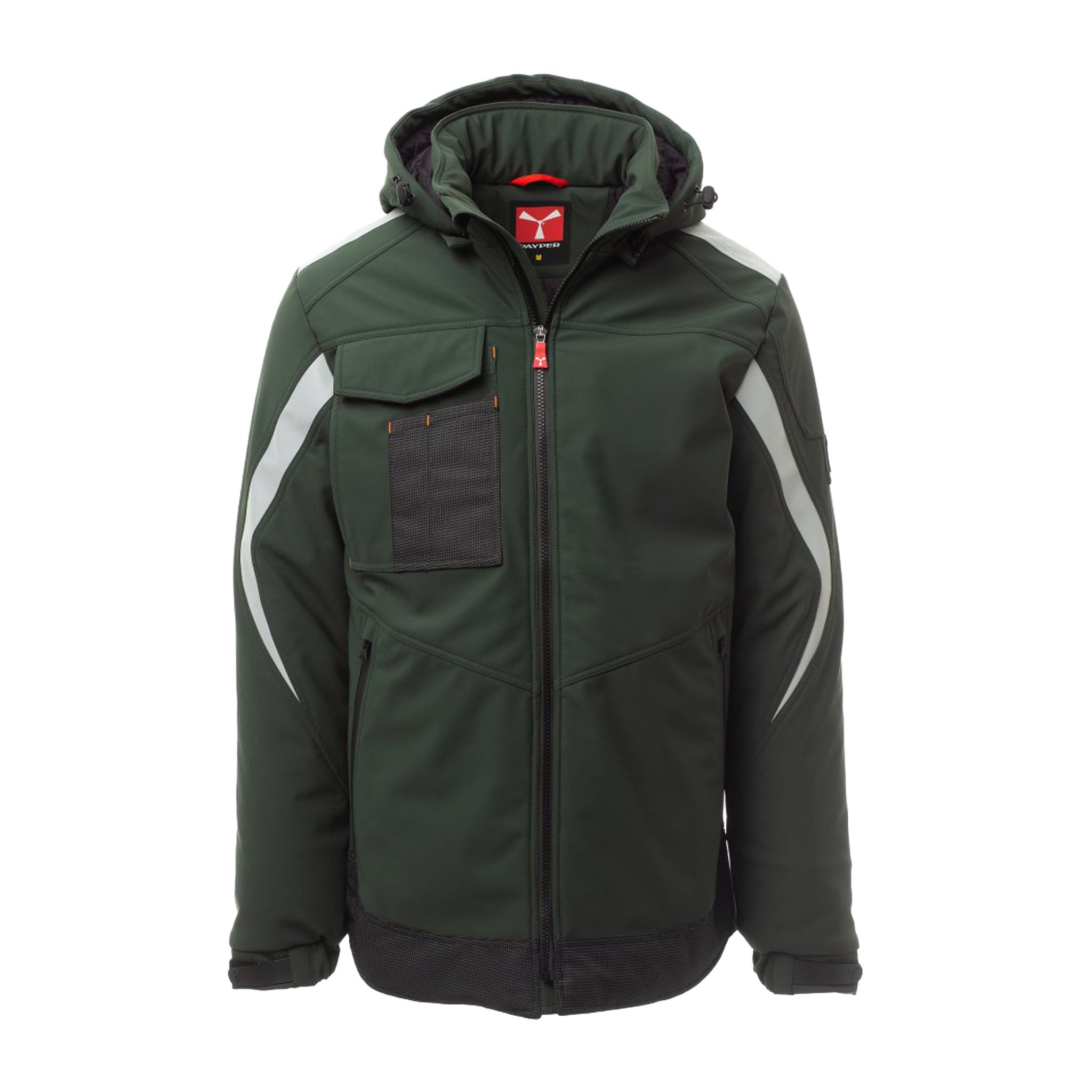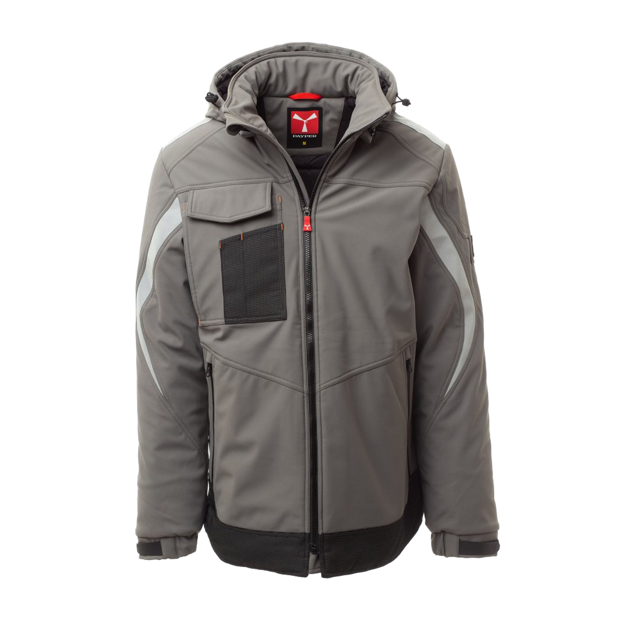 Soft-shell imbottito da uomo con chiusura tramite zip SBS con cursore in metallo "semi-auto lock" e tiretto personalizzato. Cappuccio removibile con coulisse regolabile, tessuto puntinato con effetto retroriflettente, polsini elasticizzati regolabili con velcro e polsino interno. Nastro retroriflettente su spalle e braccia per alta visibilità.