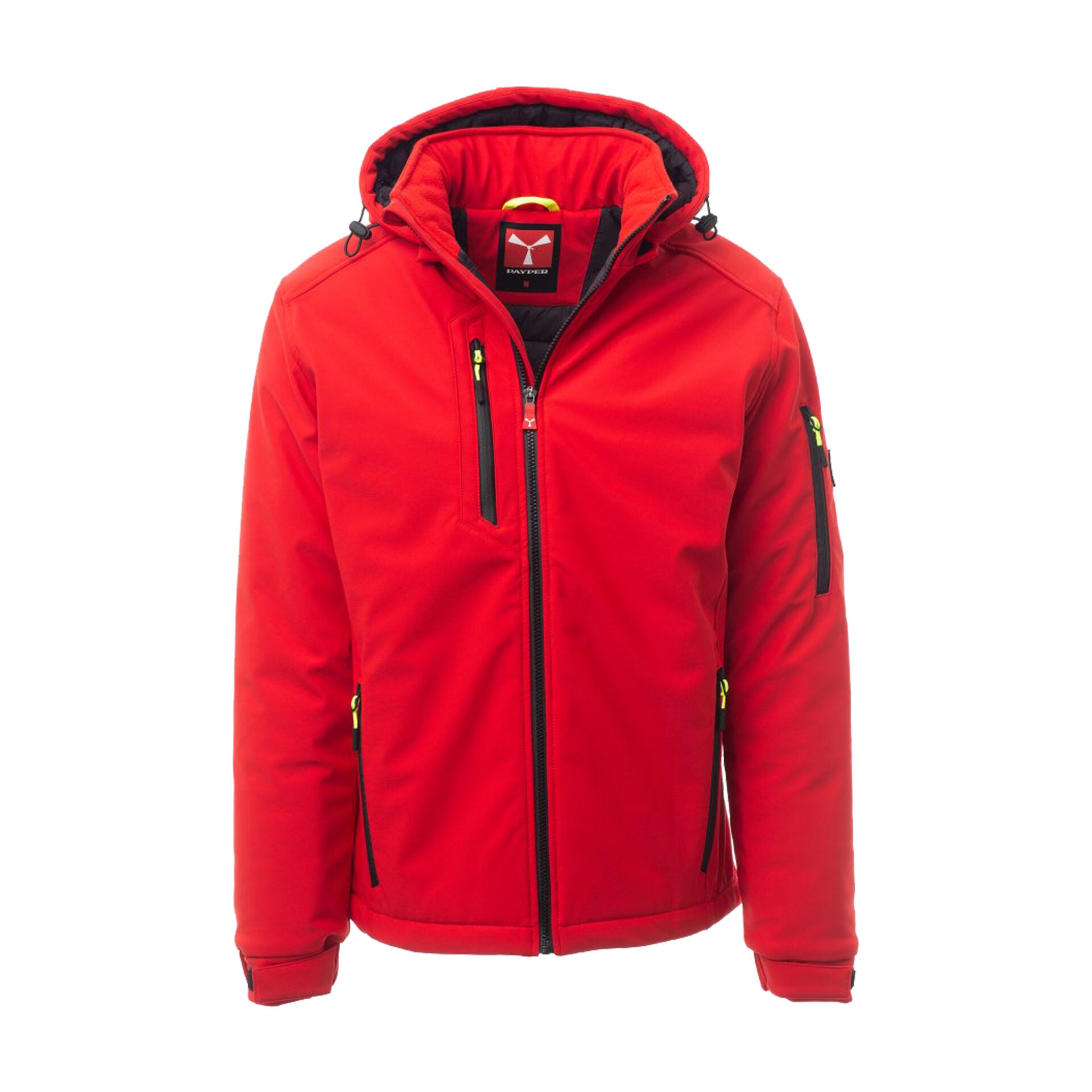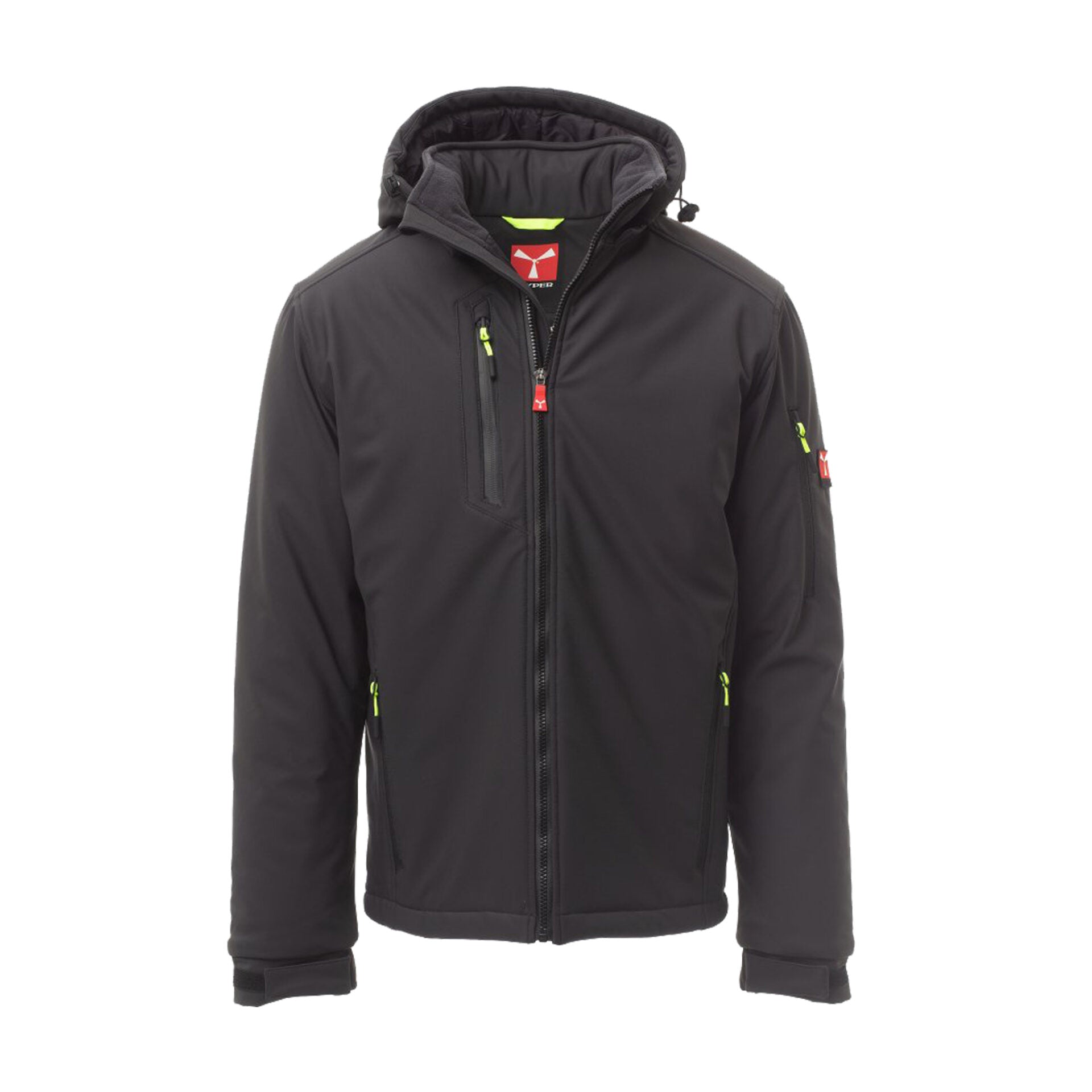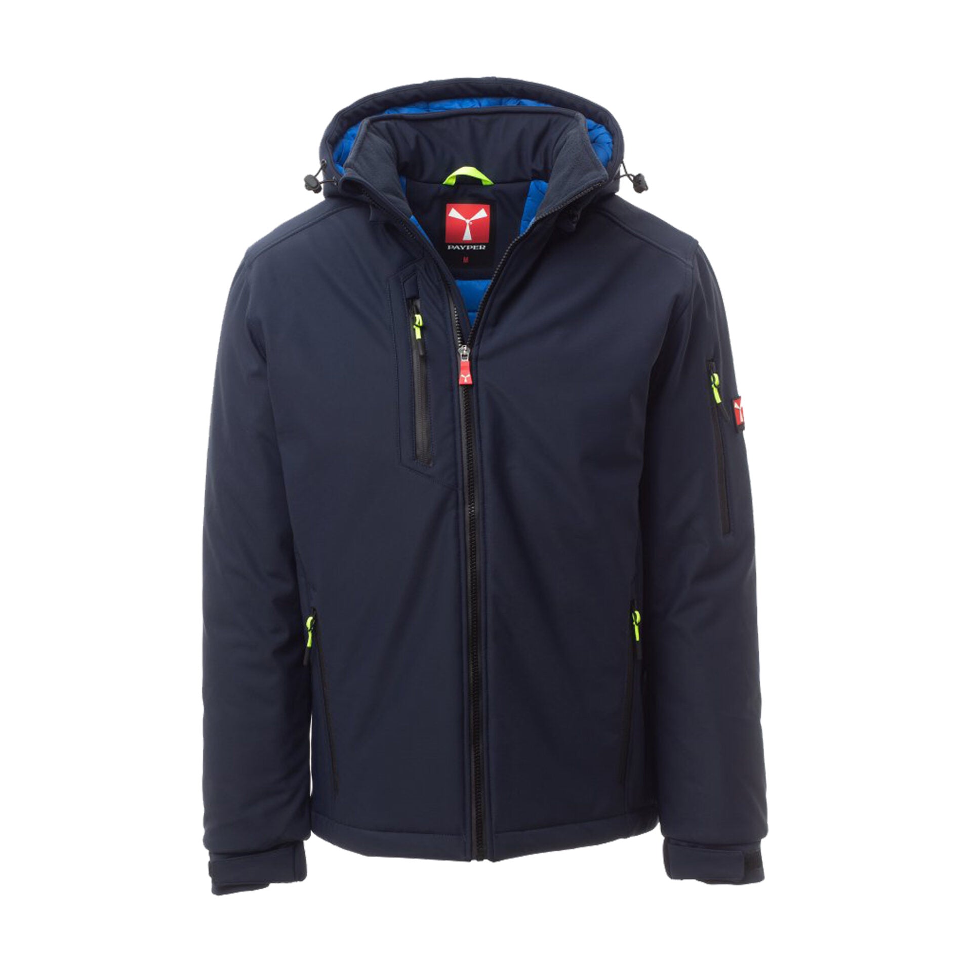 Soft-shell imbottito da uomo con chiusura tramite zip SBS con cursore in metallo "semi-auto lock" e tiretto personalizzato. Cappuccio removibile con coulisse regolabile, colletto interno con dettagli in pile. Bande retroriflettenti su fondoschiena e retro cappuccio. Polsini elasticizzati regolabili con velcro. Due tasche laterali con zip, una tasca al petto con zip spalmata, una tasca sul braccio sinistro con porta penne integrato e chiusura a zip, una tasca interna a filetto con chiusura in velcro. Fondo regolabile con stopper personalizzati. Tiretti fluorescenti per maggiore visibilità.