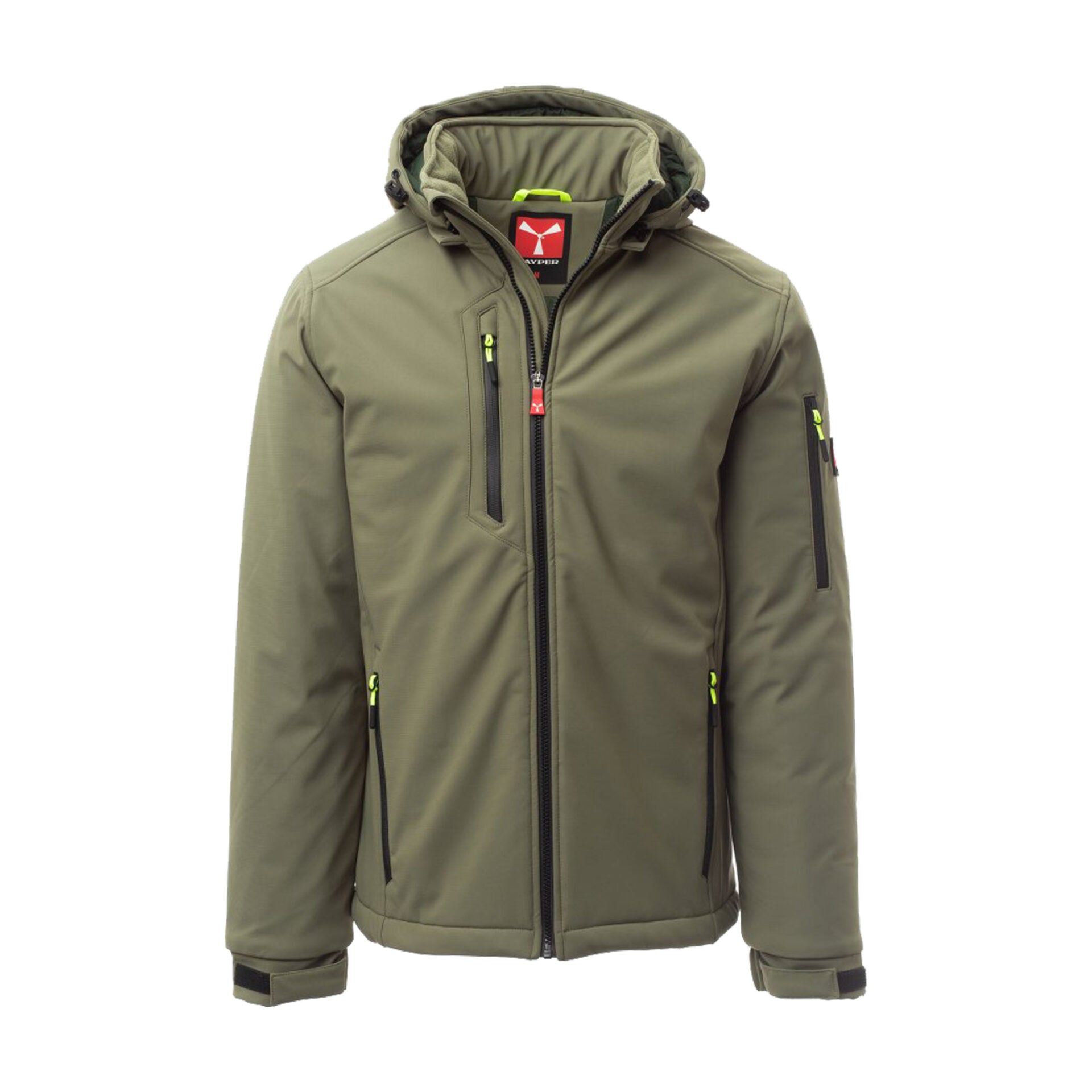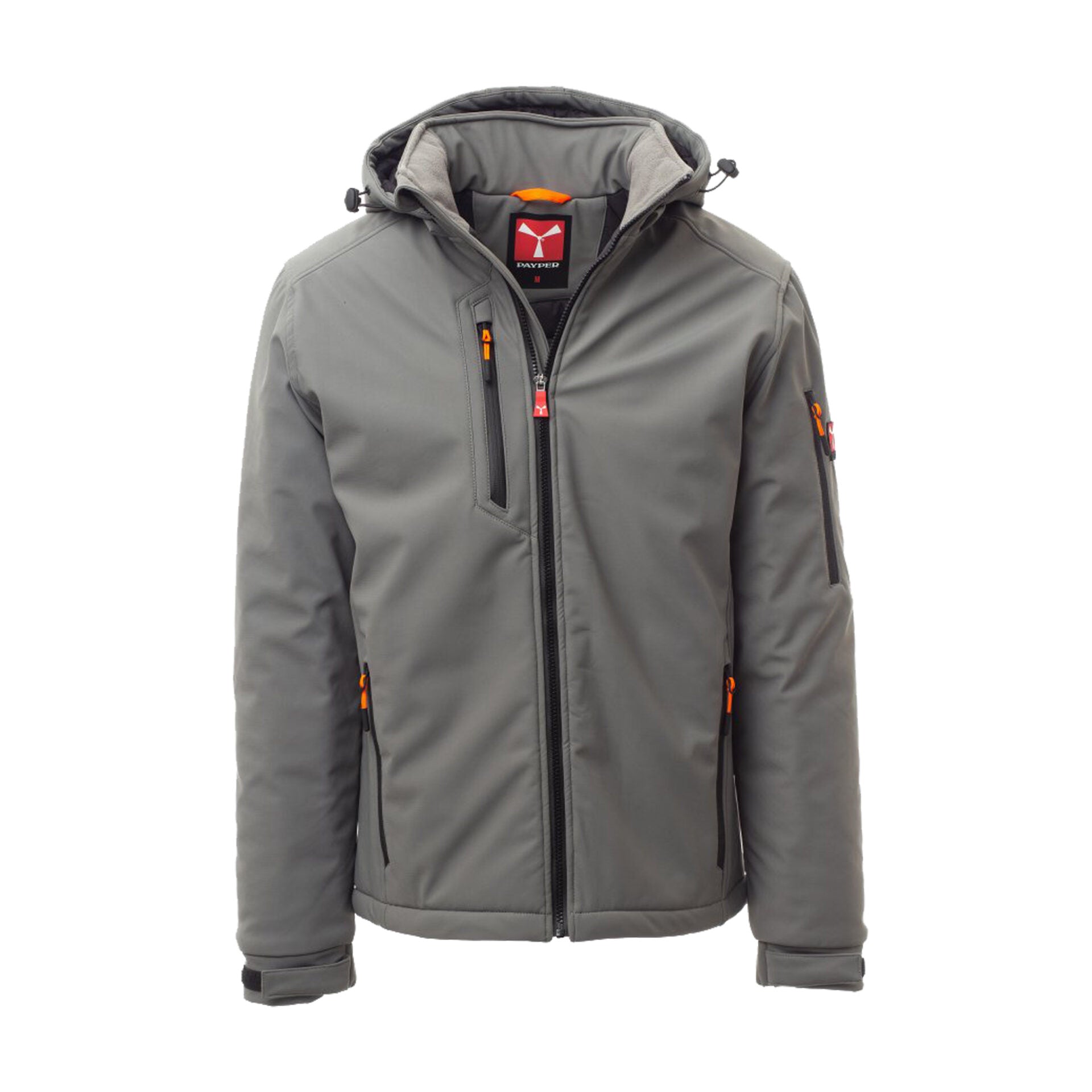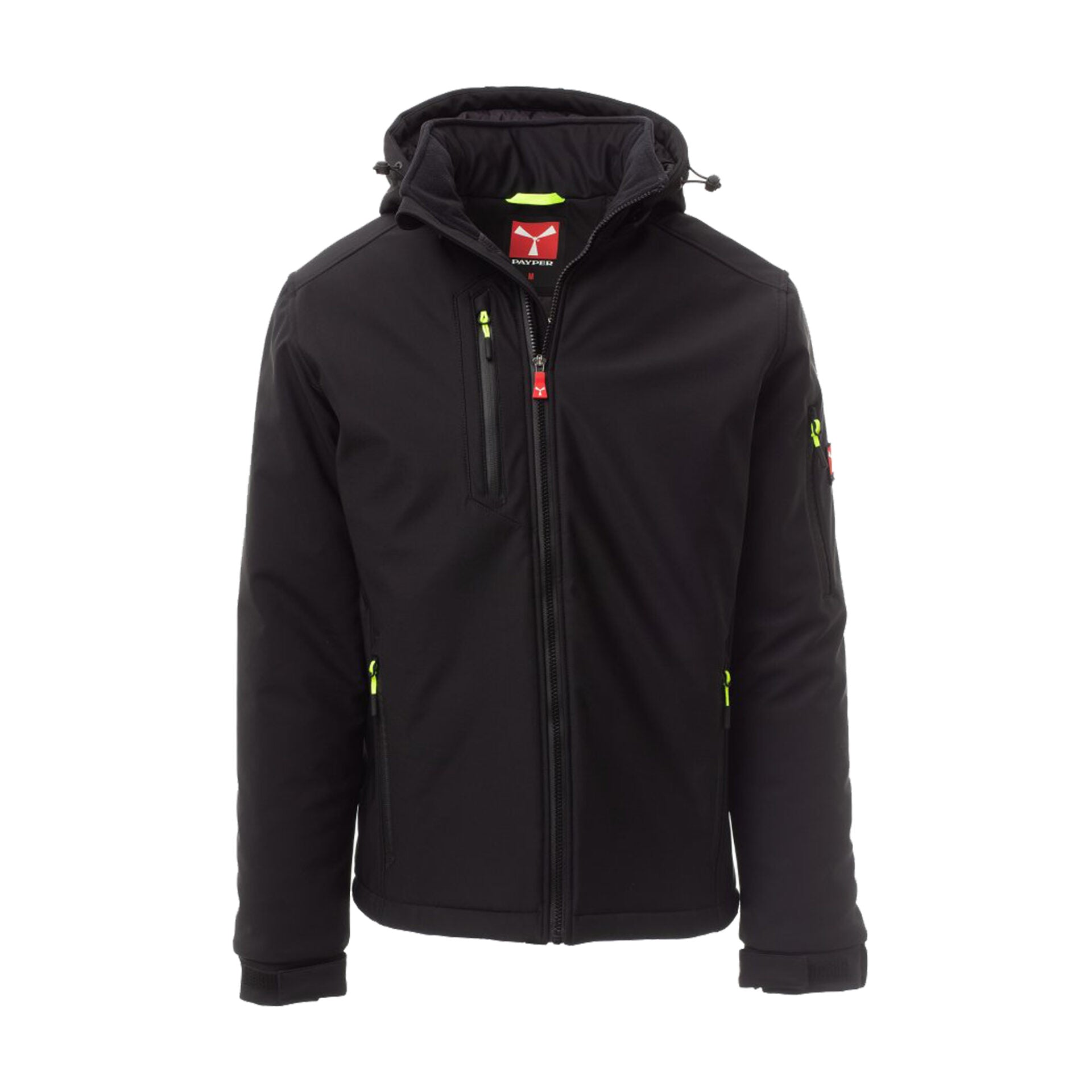 Soft-shell imbottito da uomo con chiusura tramite zip SBS con cursore in metallo "semi-auto lock" e tiretto personalizzato. Cappuccio removibile con coulisse regolabile, colletto interno con dettagli in pile. Bande retroriflettenti su fondoschiena e retro cappuccio. Polsini elasticizzati regolabili con velcro. Due tasche laterali con zip, una tasca al petto con zip spalmata, una tasca sul braccio sinistro con porta penne integrato e chiusura a zip, una tasca interna a filetto con chiusura in velcro. Fondo regolabile con stopper personalizzati. Tiretti fluorescenti per maggiore visibilità.