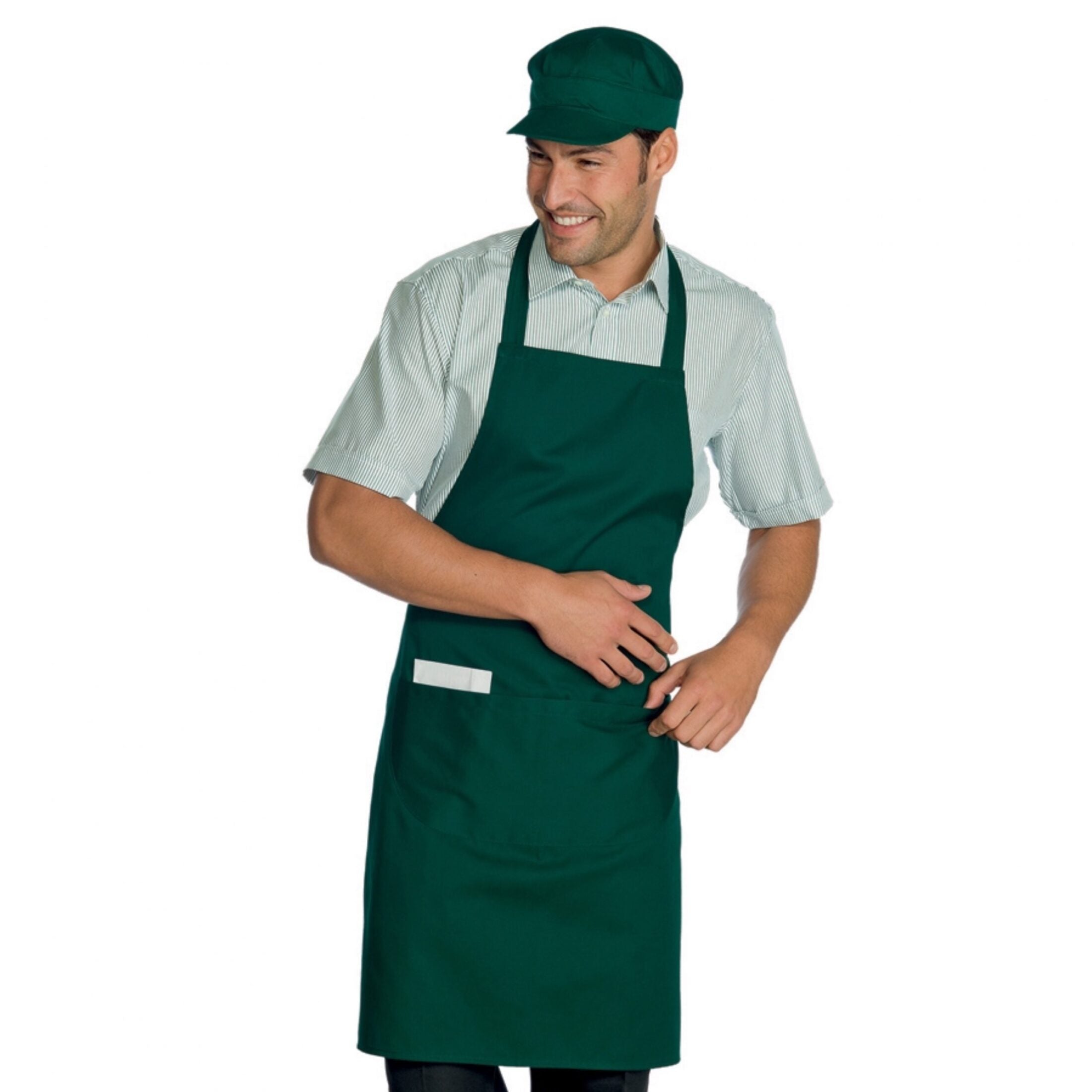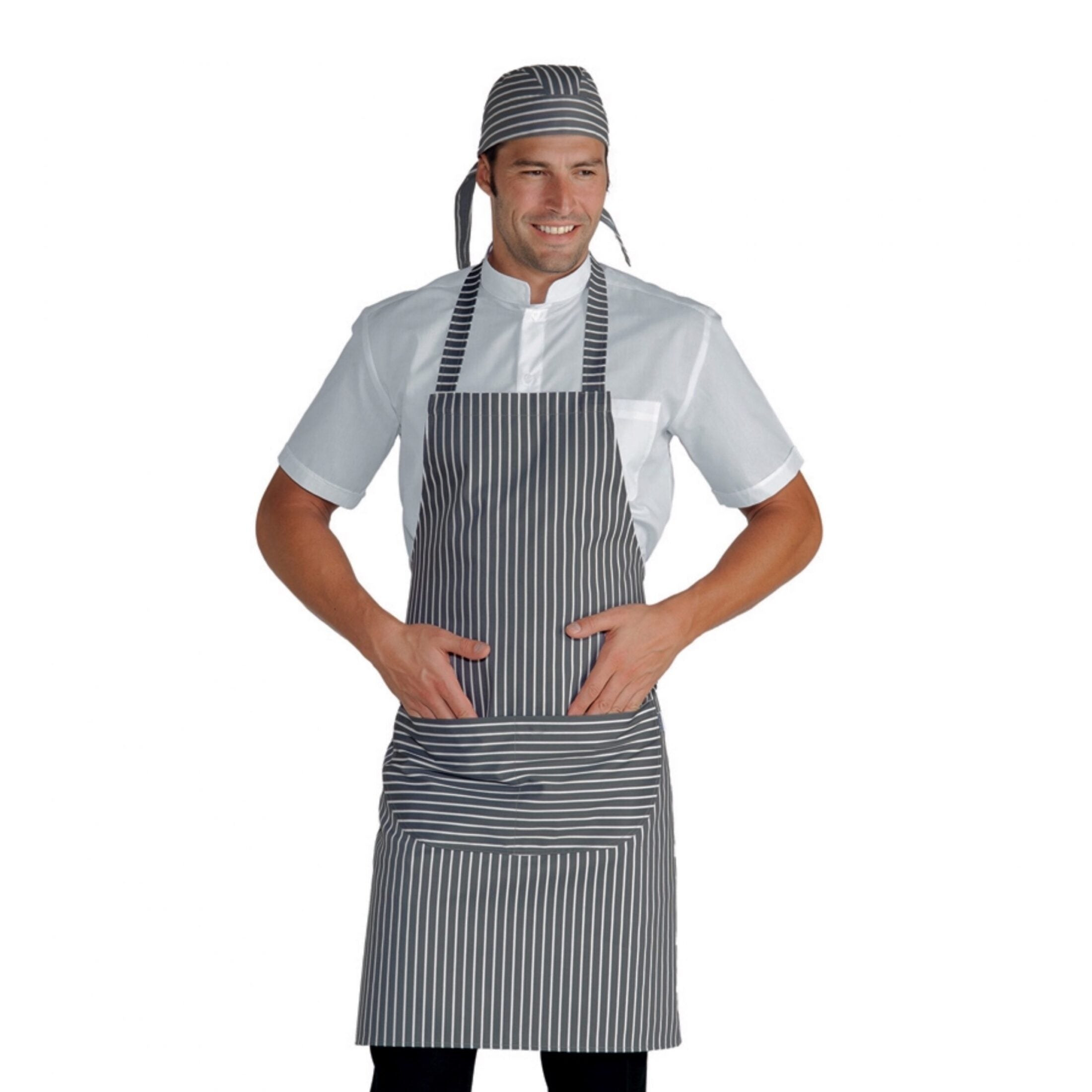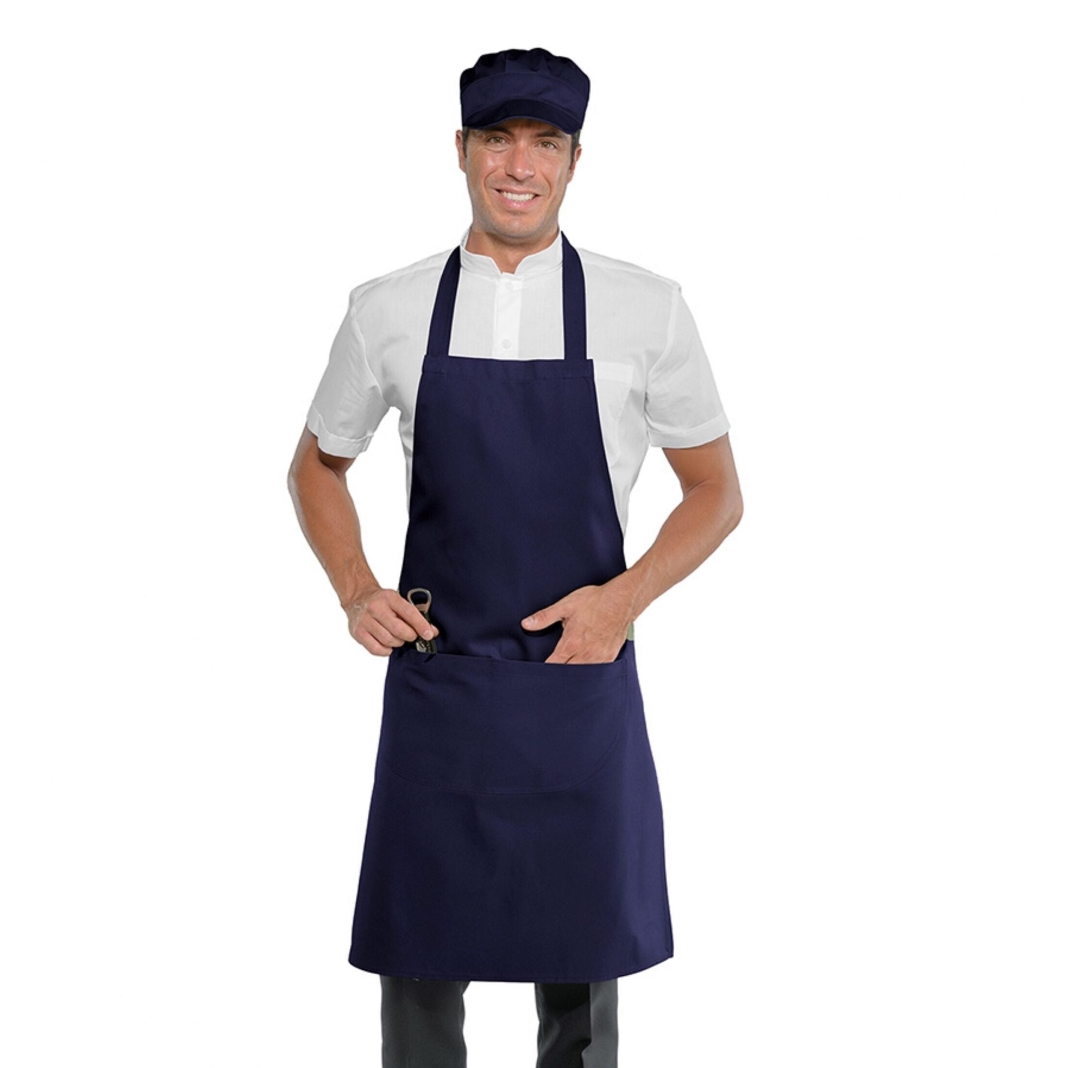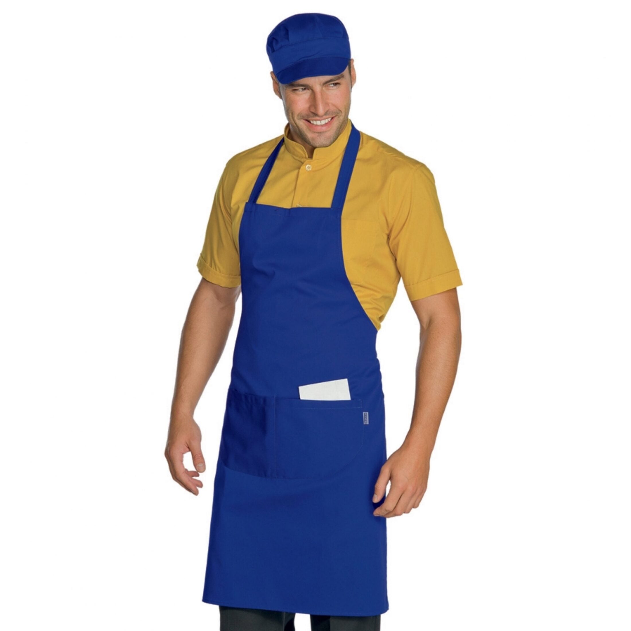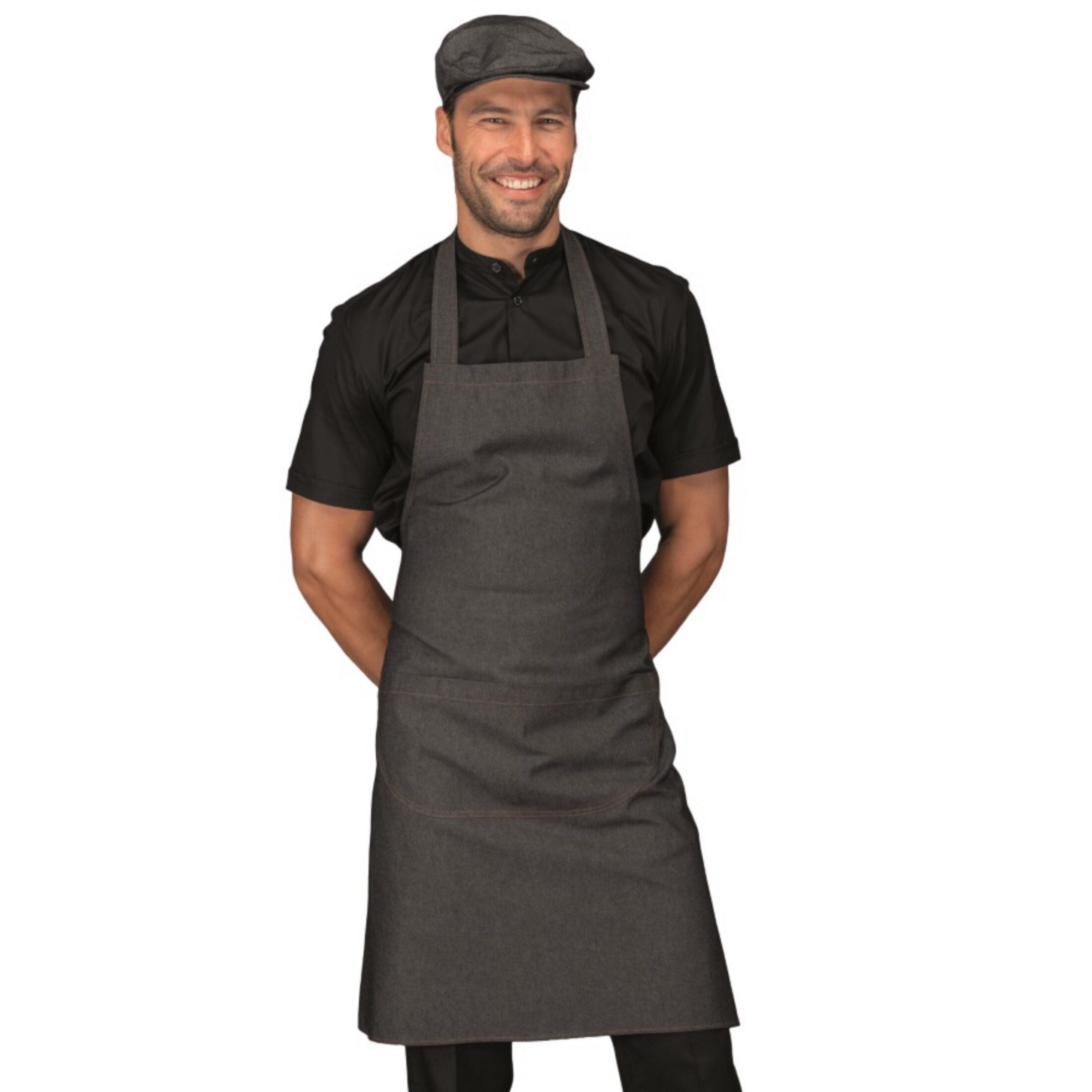 Grembiule con pettorina Isacco, modello unisex con tasca anteriore arrotondata, ideale per ristorazione, bar, hotel e caffetteria. Realizzato in 100% cotone oppure in 65% poliestere / 35% cotone, resistente e comodo. Dotato di laccio regolabile per adattarsi a qualsiasi taglia.