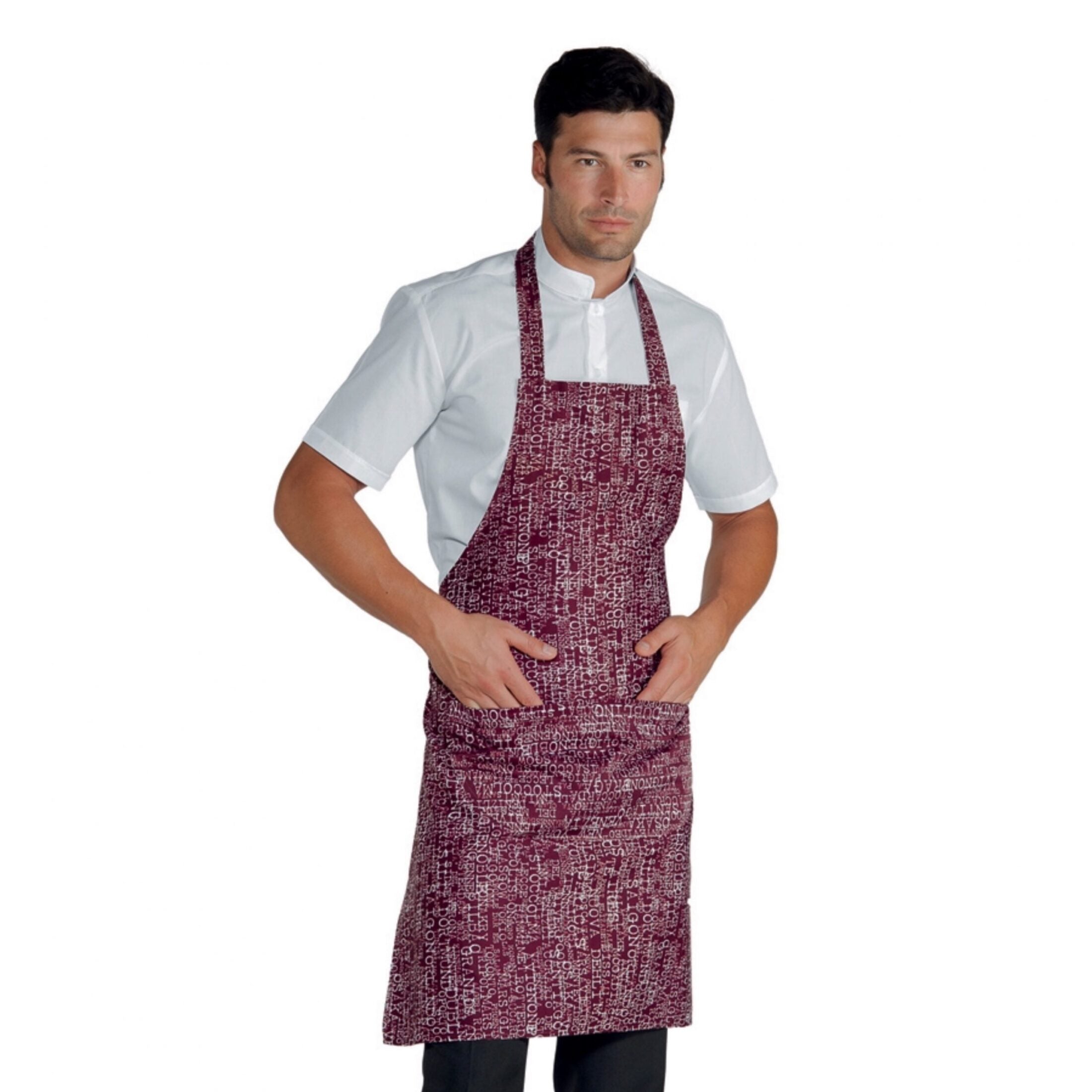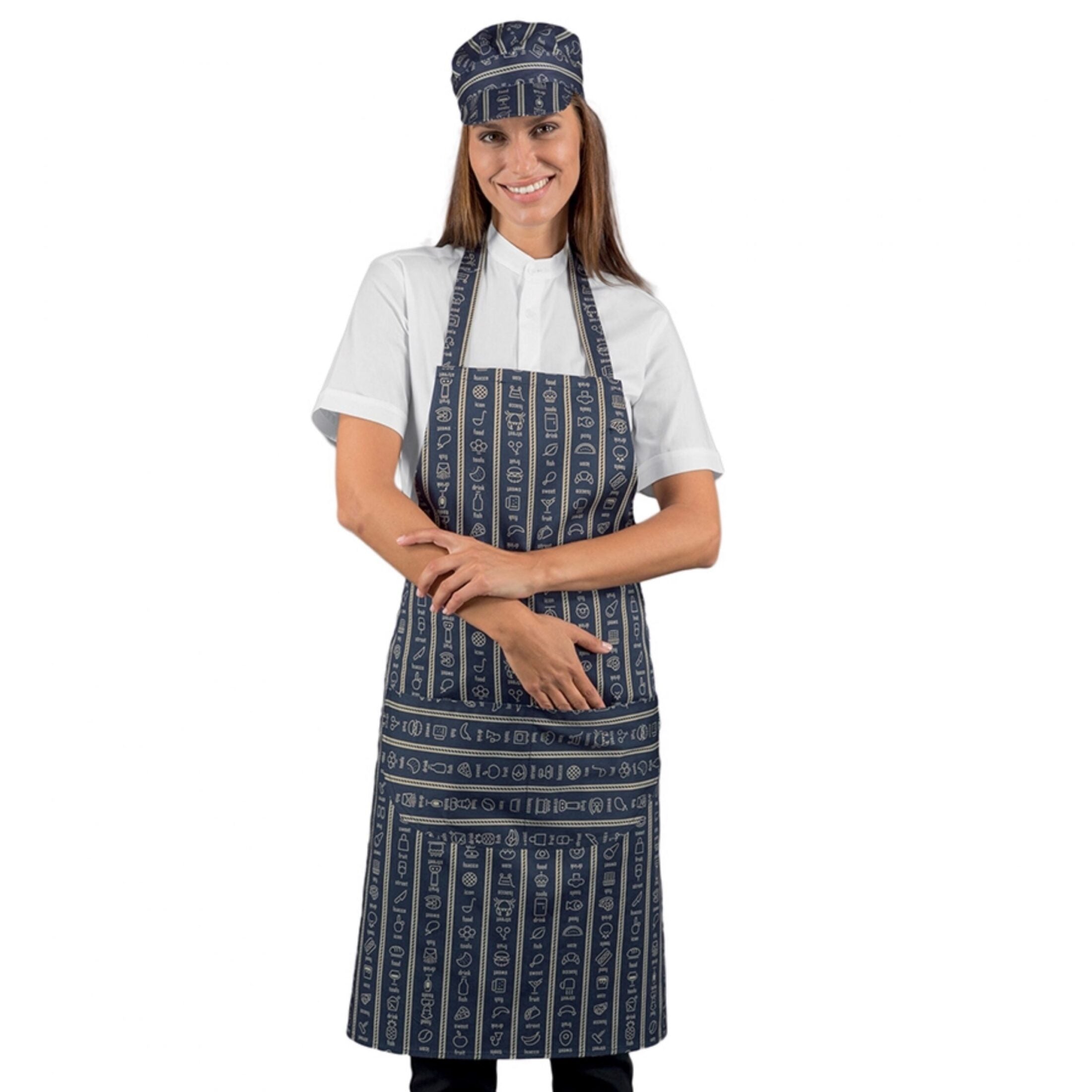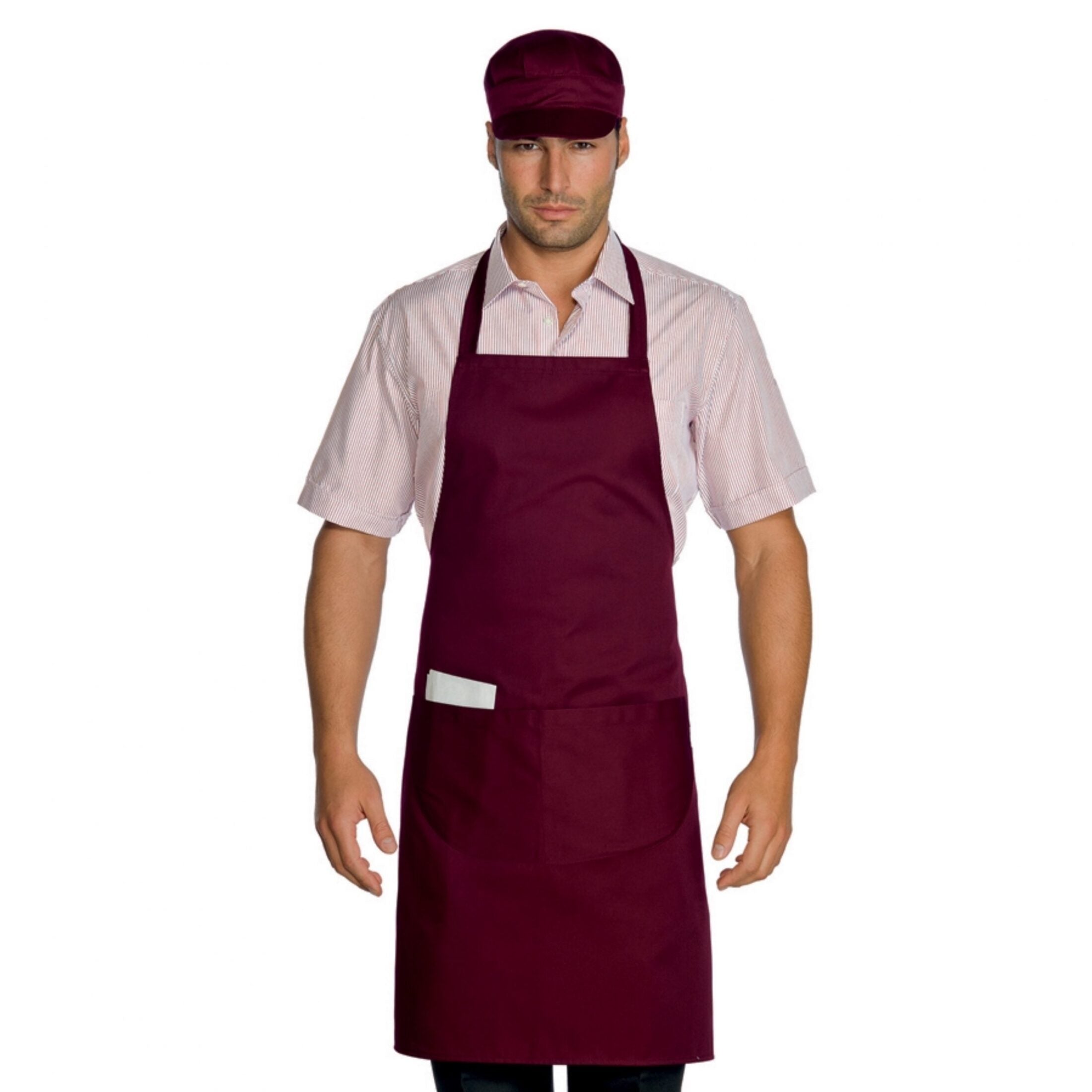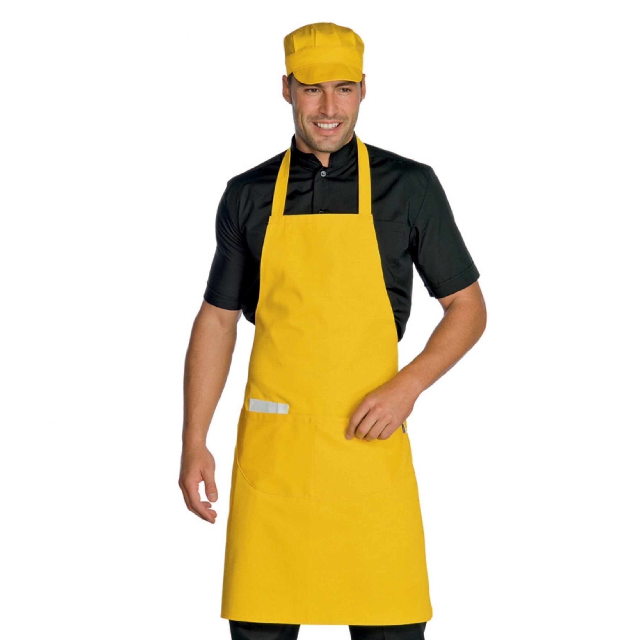 Grembiule con pettorina Isacco, modello unisex con tasca anteriore arrotondata, ideale per ristorazione, bar, hotel e caffetteria. Realizzato in 100% cotone oppure in 65% poliestere / 35% cotone, resistente e comodo. Dotato di laccio regolabile per adattarsi a qualsiasi taglia.