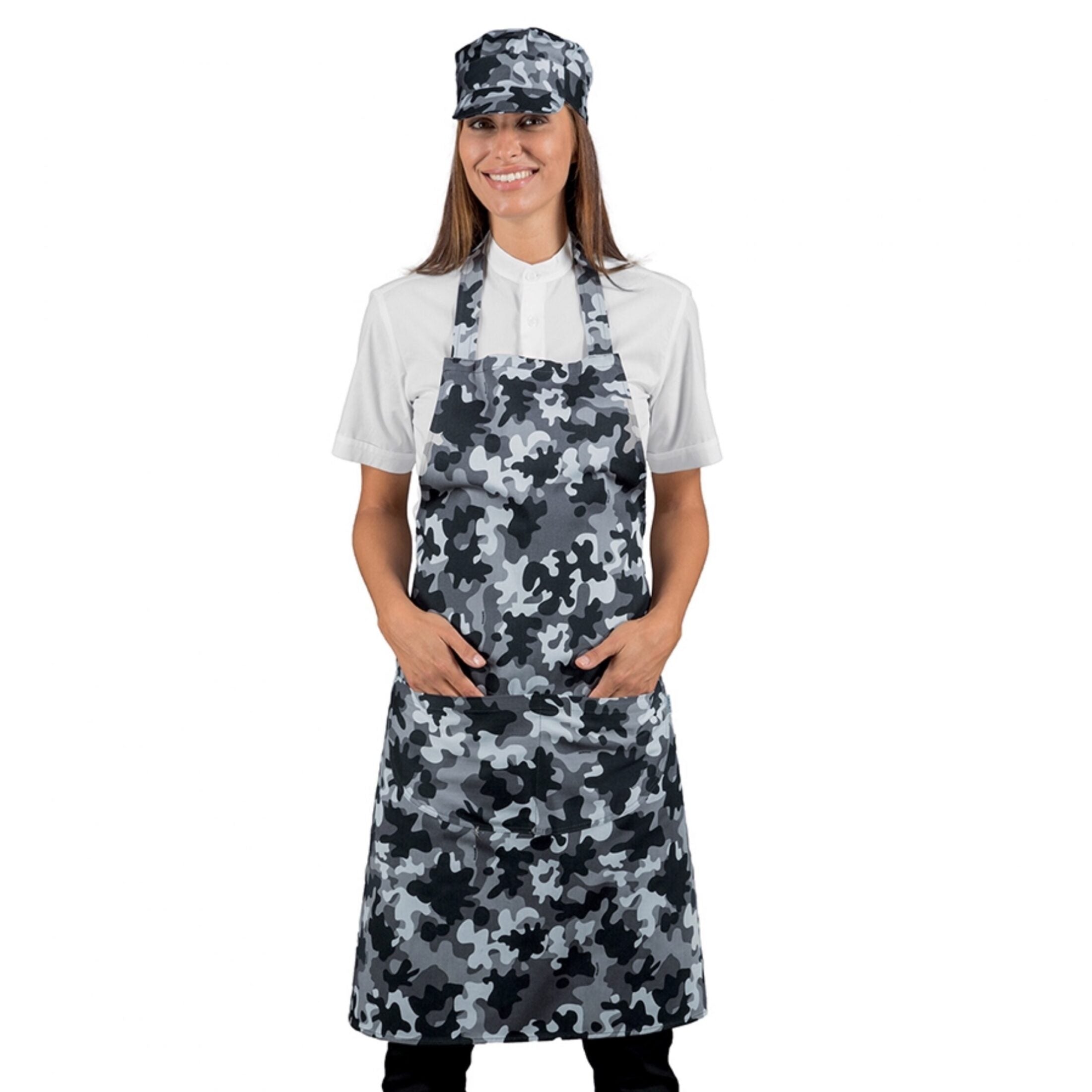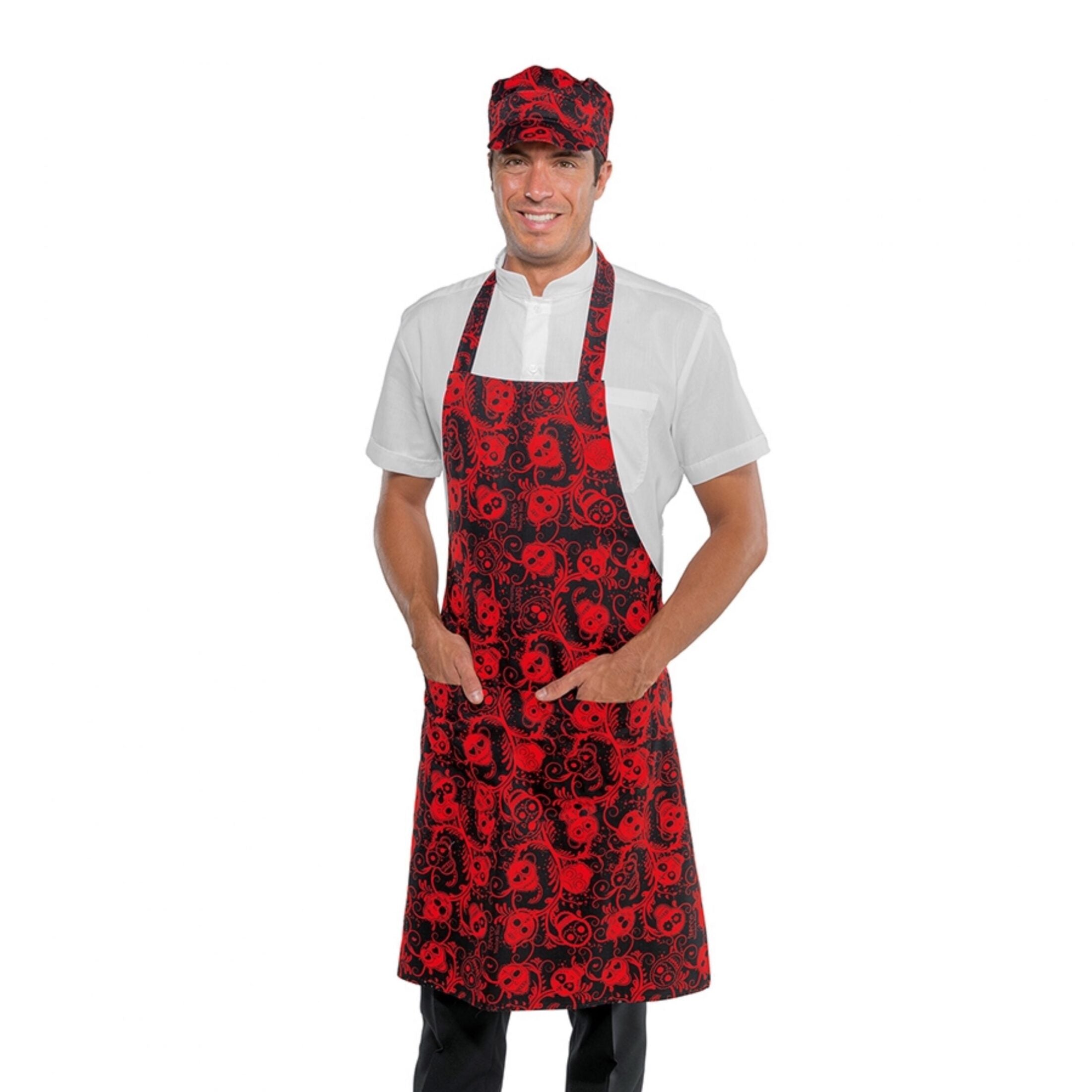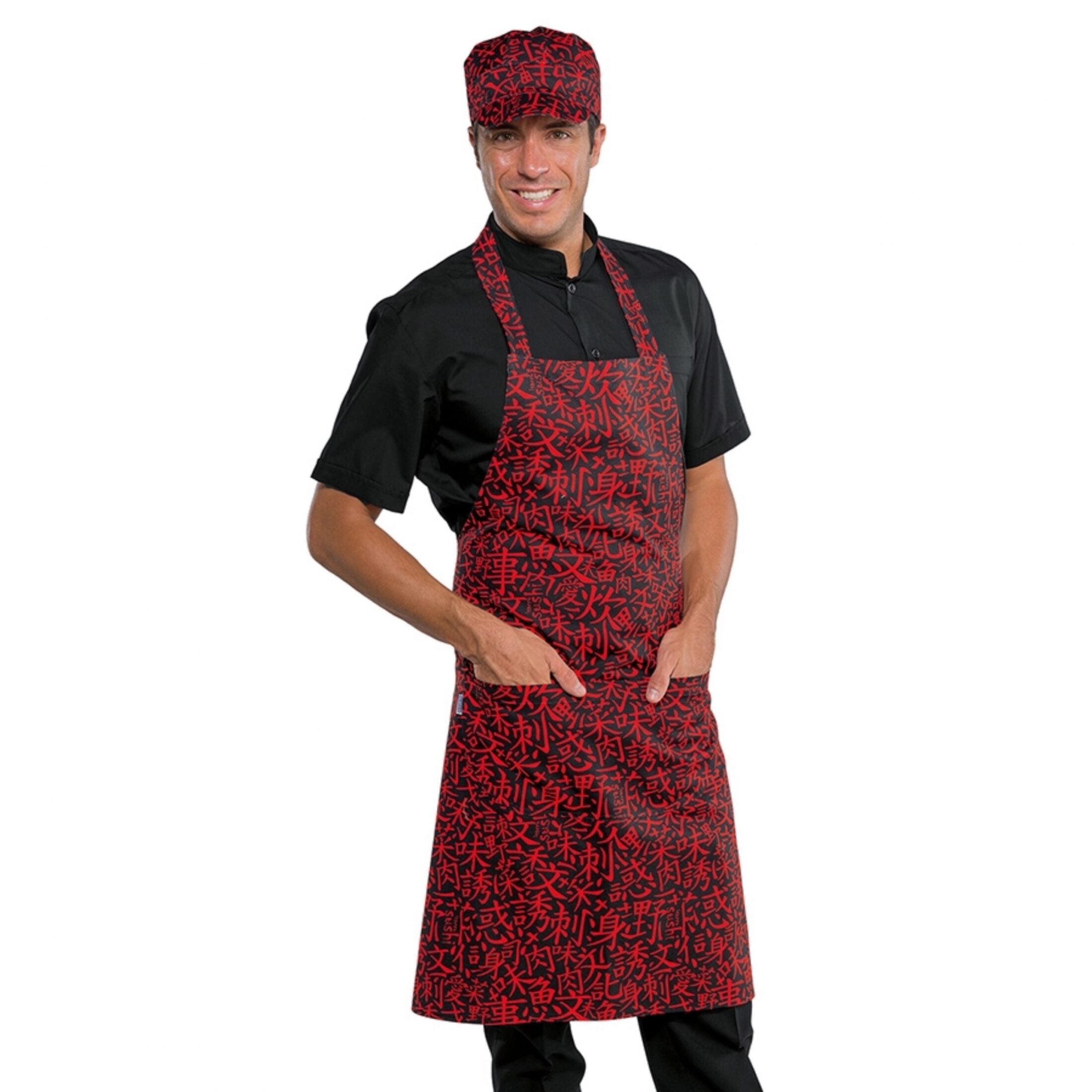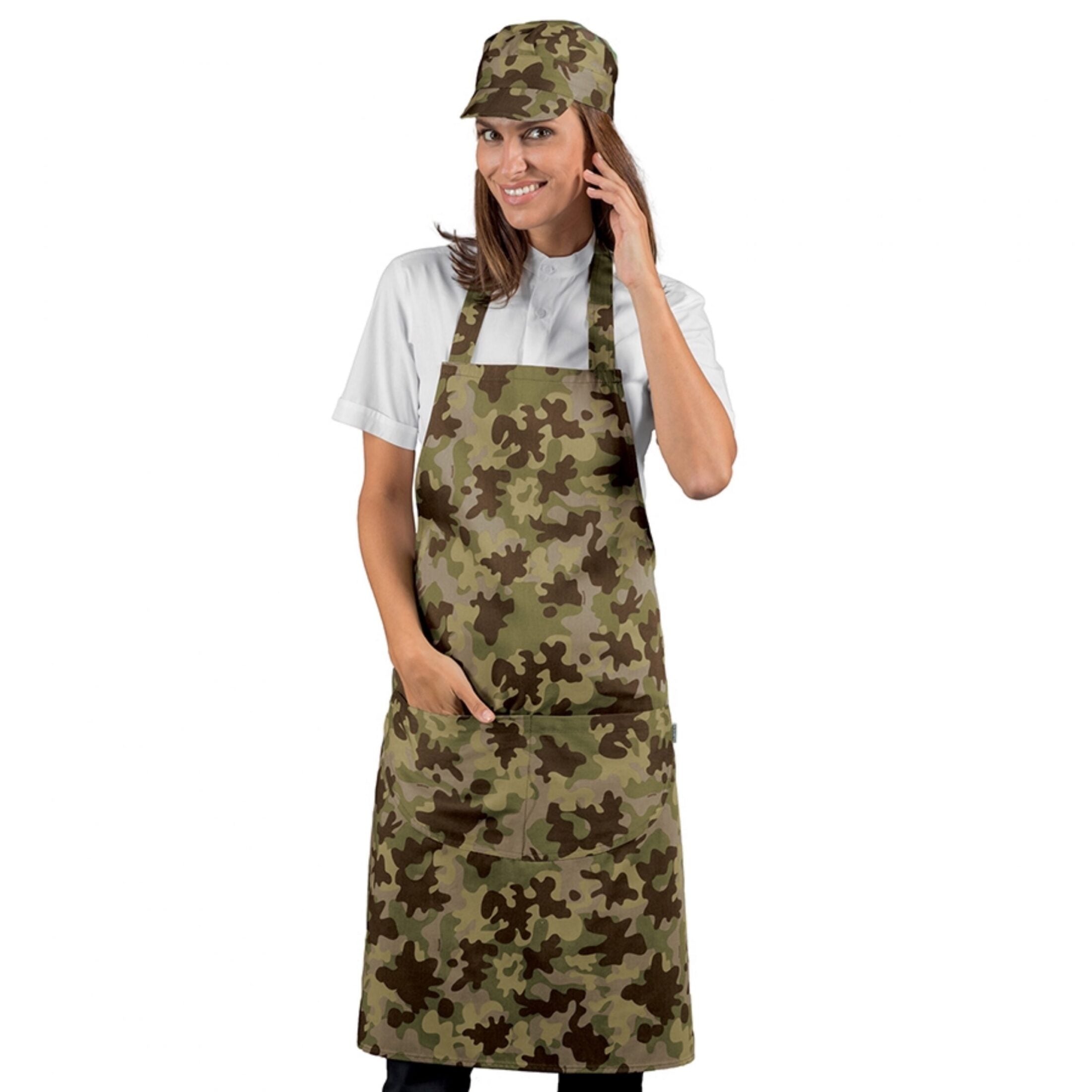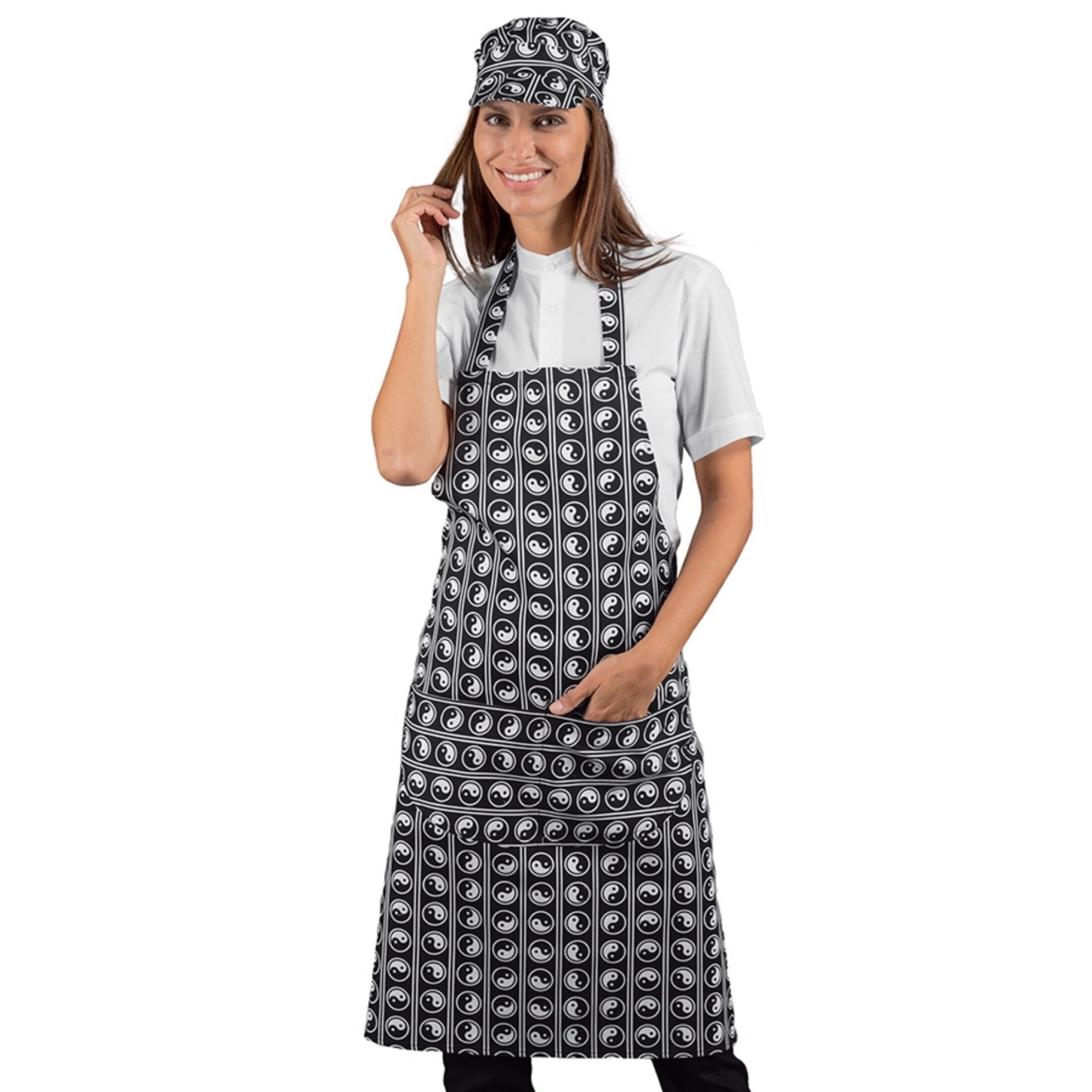 Grembiule con pettorina Isacco, modello unisex con tasca anteriore arrotondata, ideale per ristorazione, bar, hotel e caffetteria. Realizzato in 100% cotone oppure in 65% poliestere / 35% cotone, resistente e comodo. Dotato di laccio regolabile per adattarsi a qualsiasi taglia.