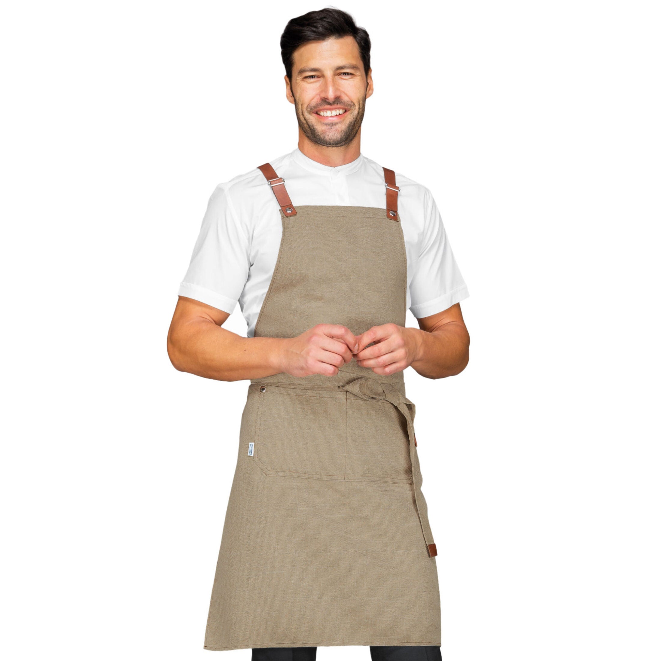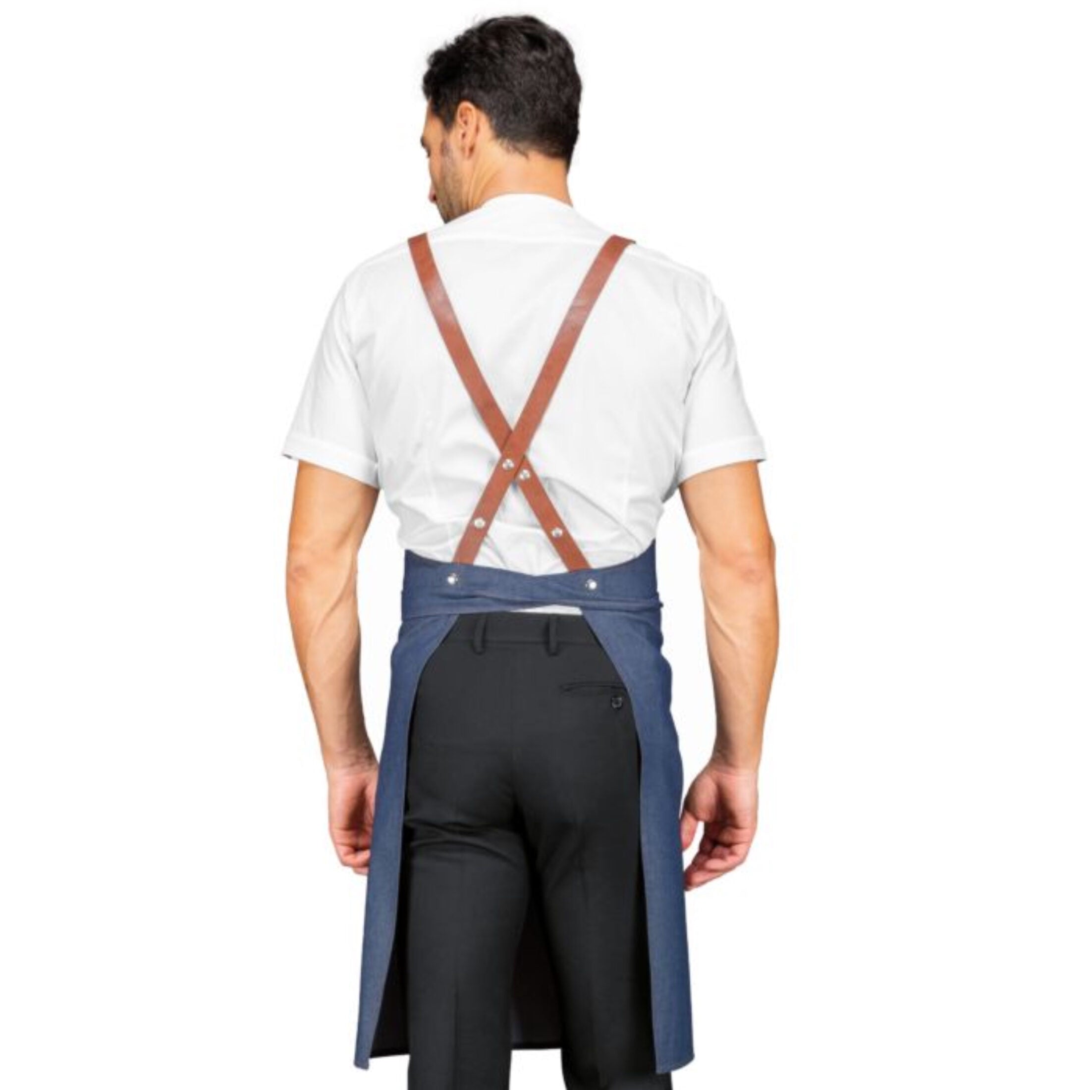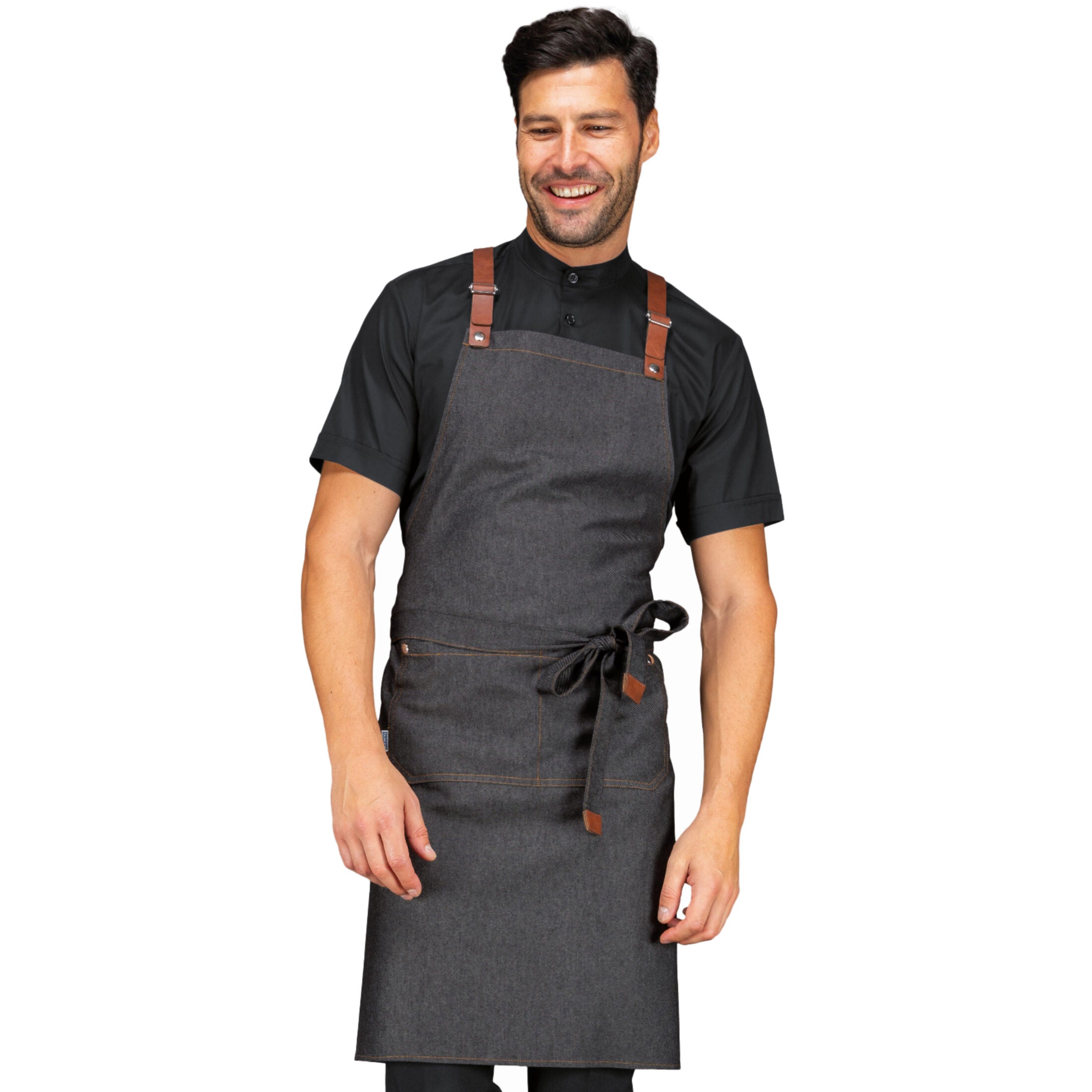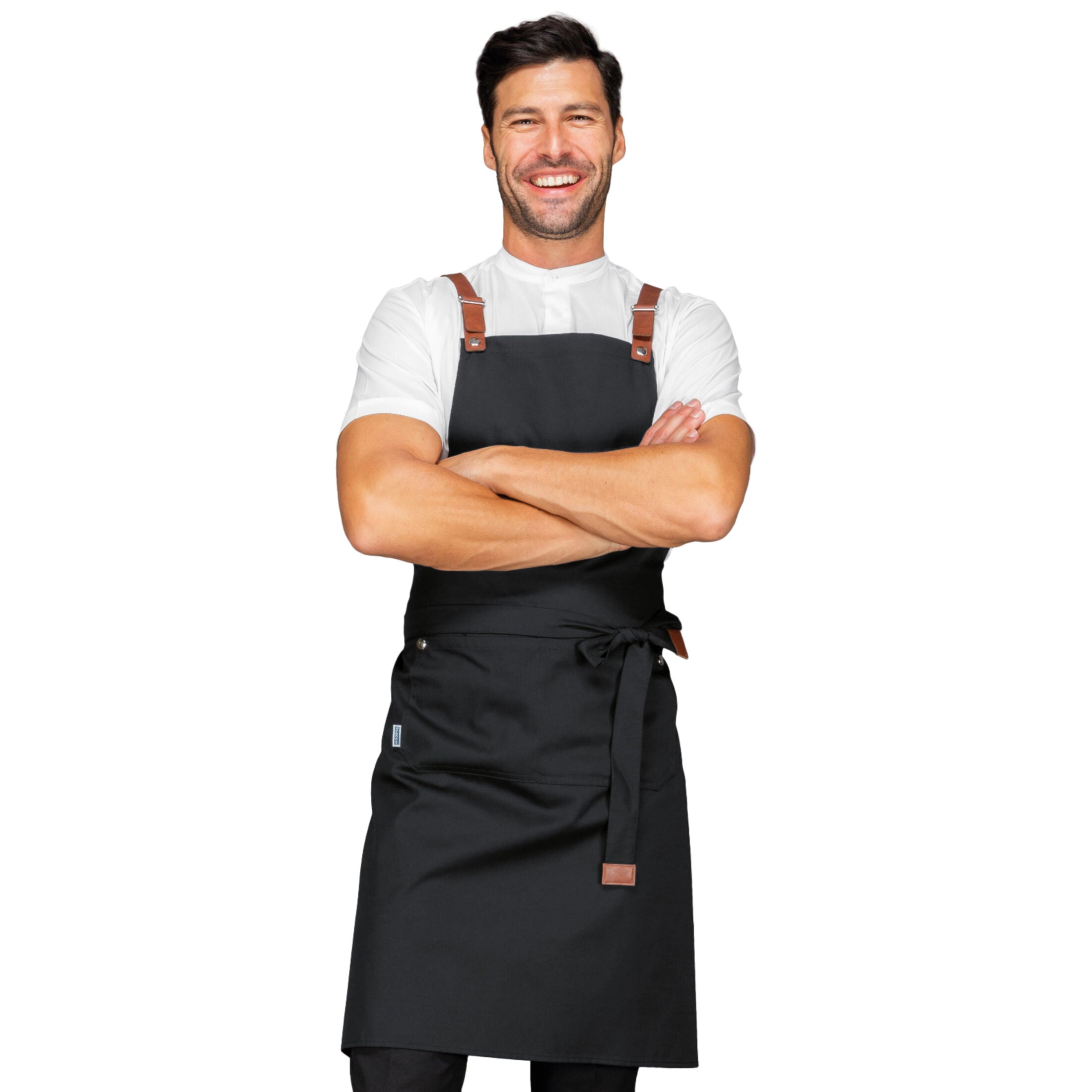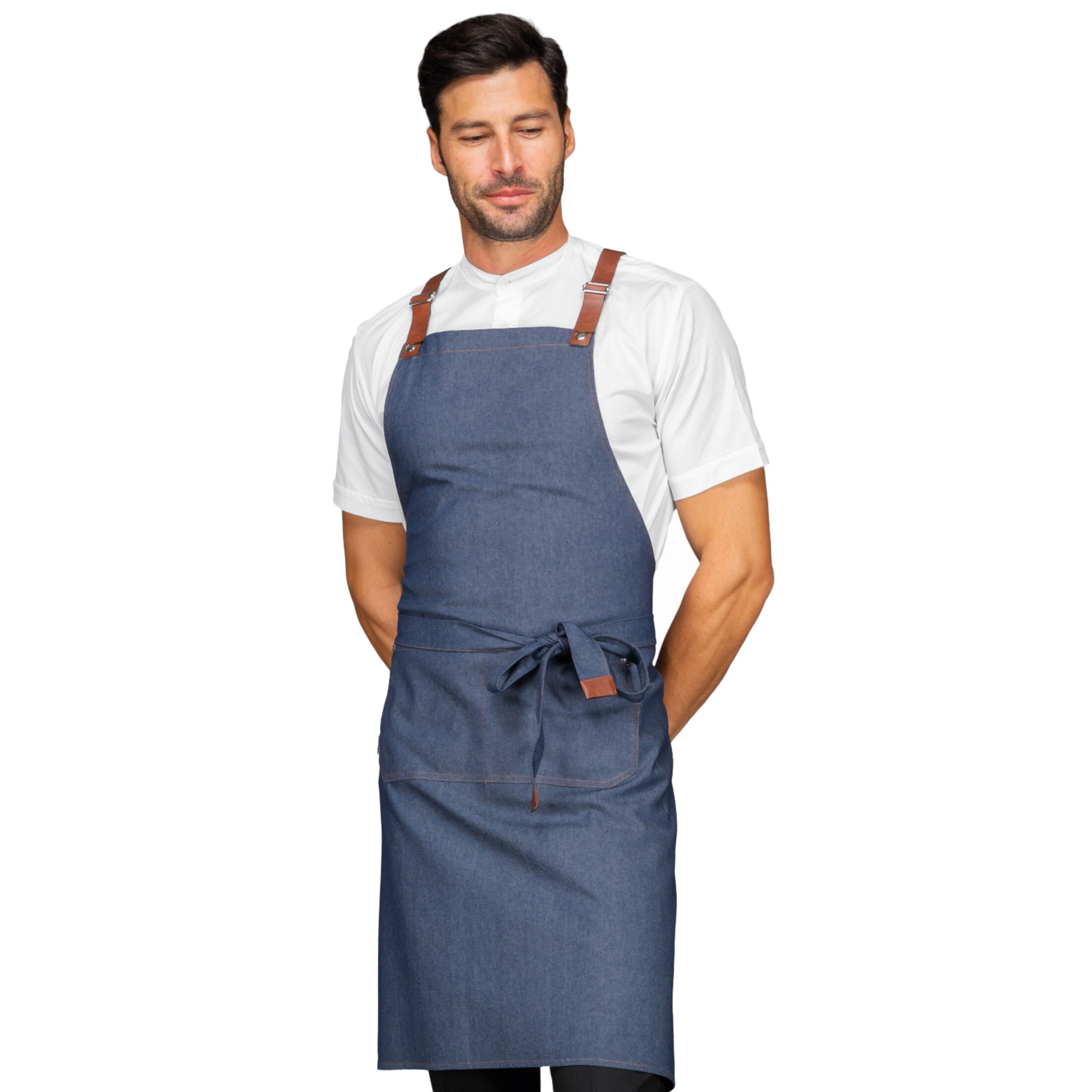 Grembiule con pettorina Isacco Mexico personalizzato, perfetto per ambienti professionali come bar, ristoranti, caffetterie e hotel. Realizzato in cotone e poliestere ad alta resistenza, offre comfort e stile. Il design include una chiusura a incrocio regolabile con bretelle in pelle e due ampie tasche frontali. Ideale per il personale che desidera una divisa funzionale e distintiva.