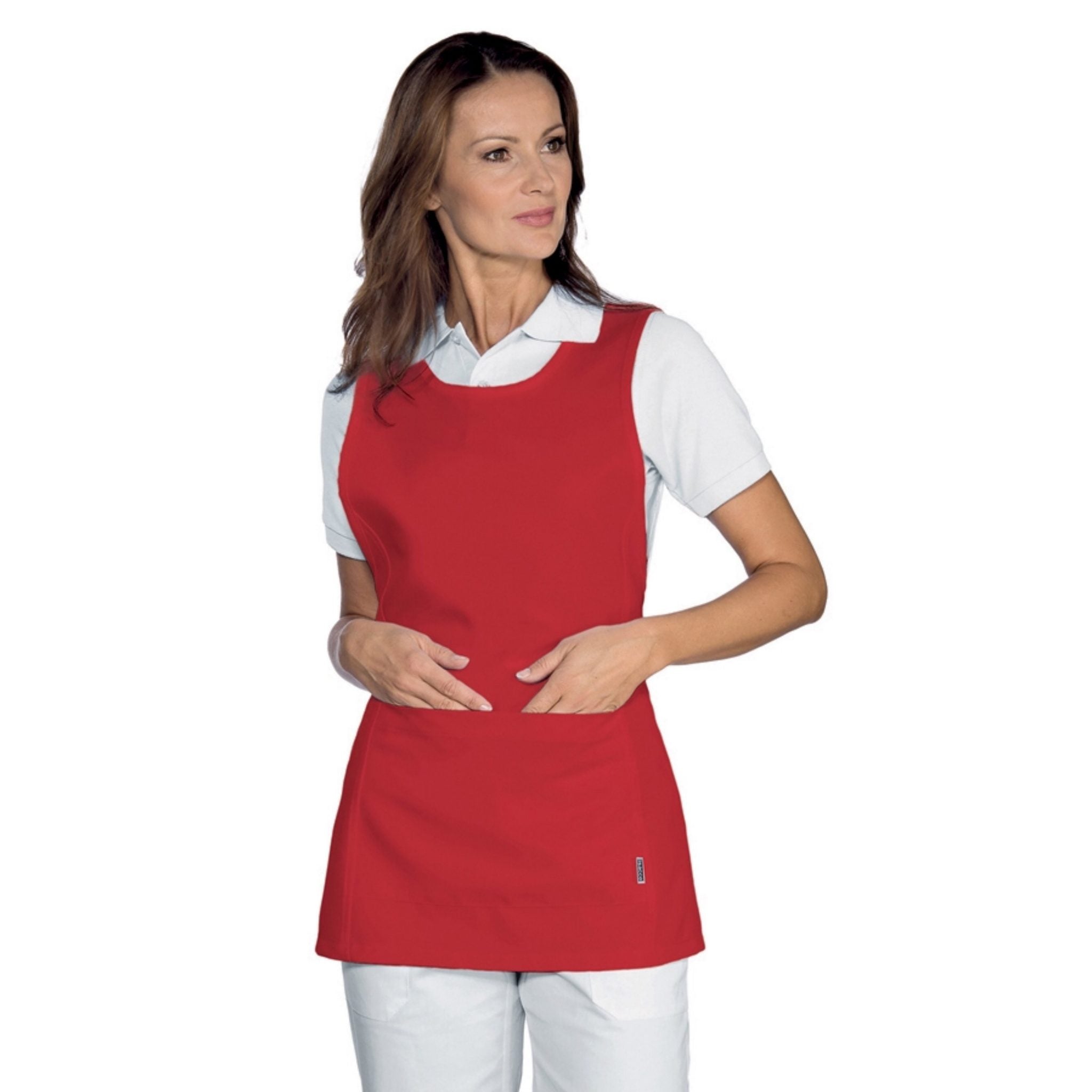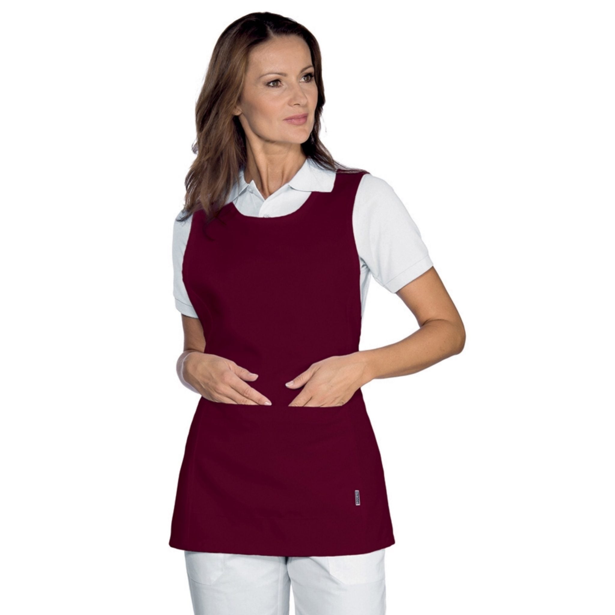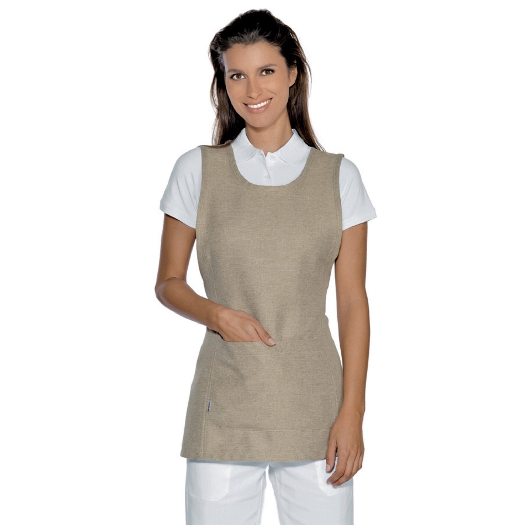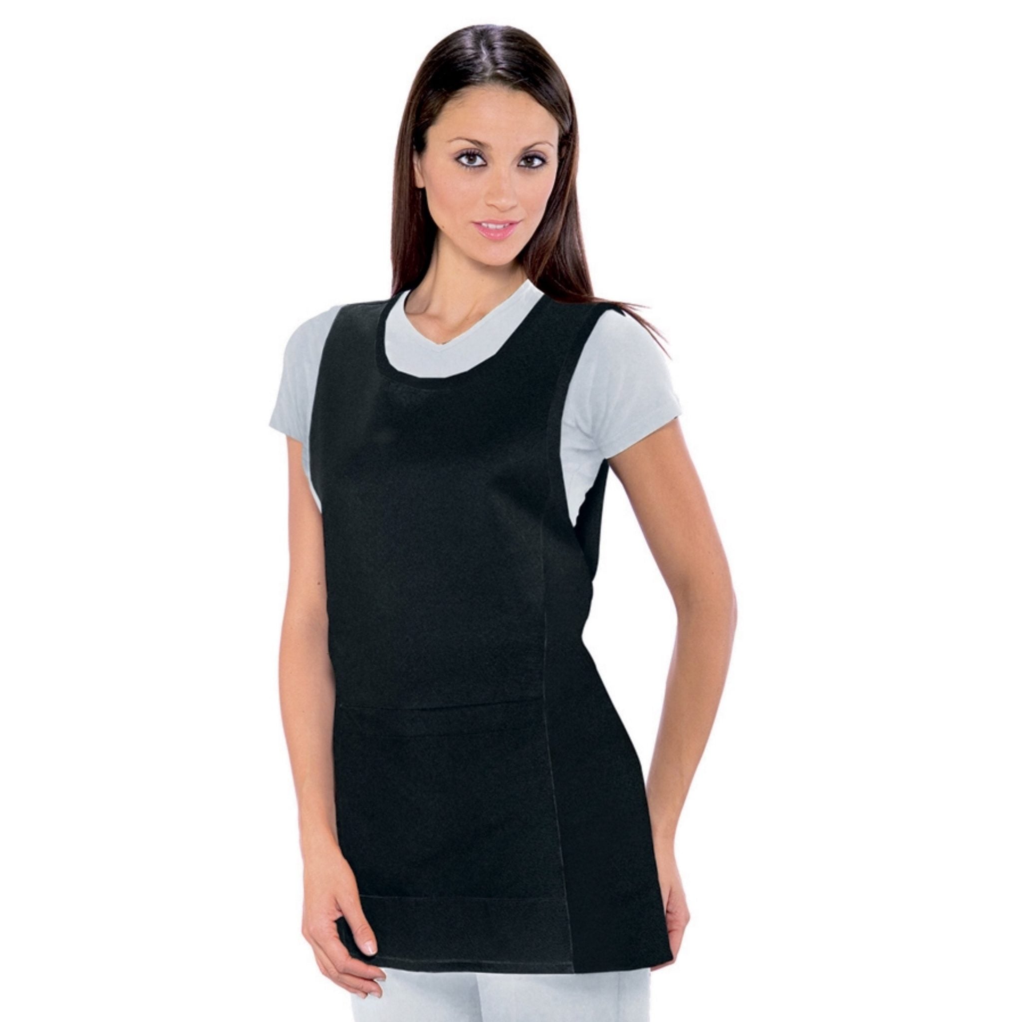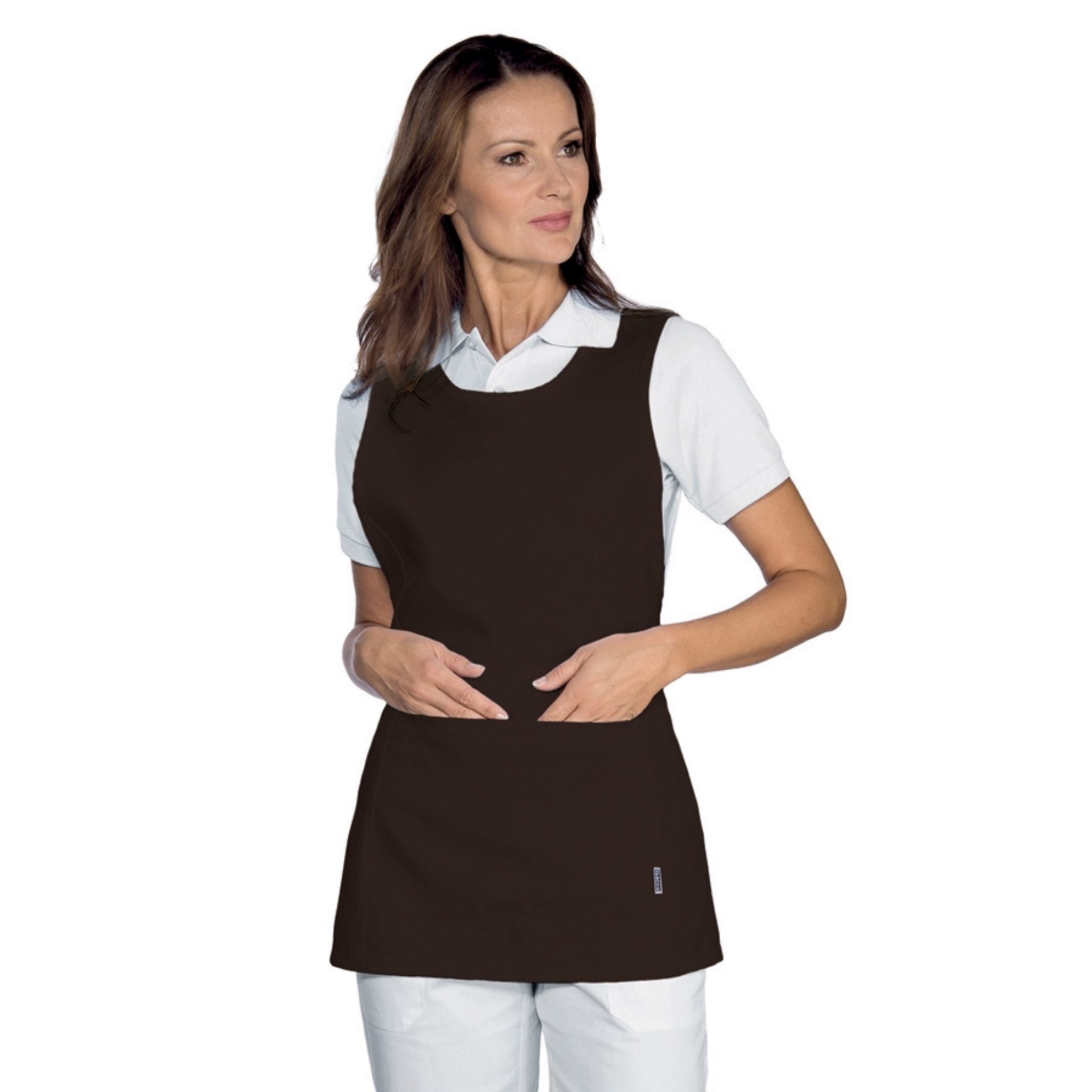 Grembiule con pettorina Isacco Papeete da donna, elegante e pratico, perfetto per ambienti come bar, ristoranti, sale e hotel. Realizzato in 100% poliestere da 220 gr/m², è resistente, comodo e lavabile a 40°C. Dotato di due tasche anteriori e laccio regolabile per taglia unica.