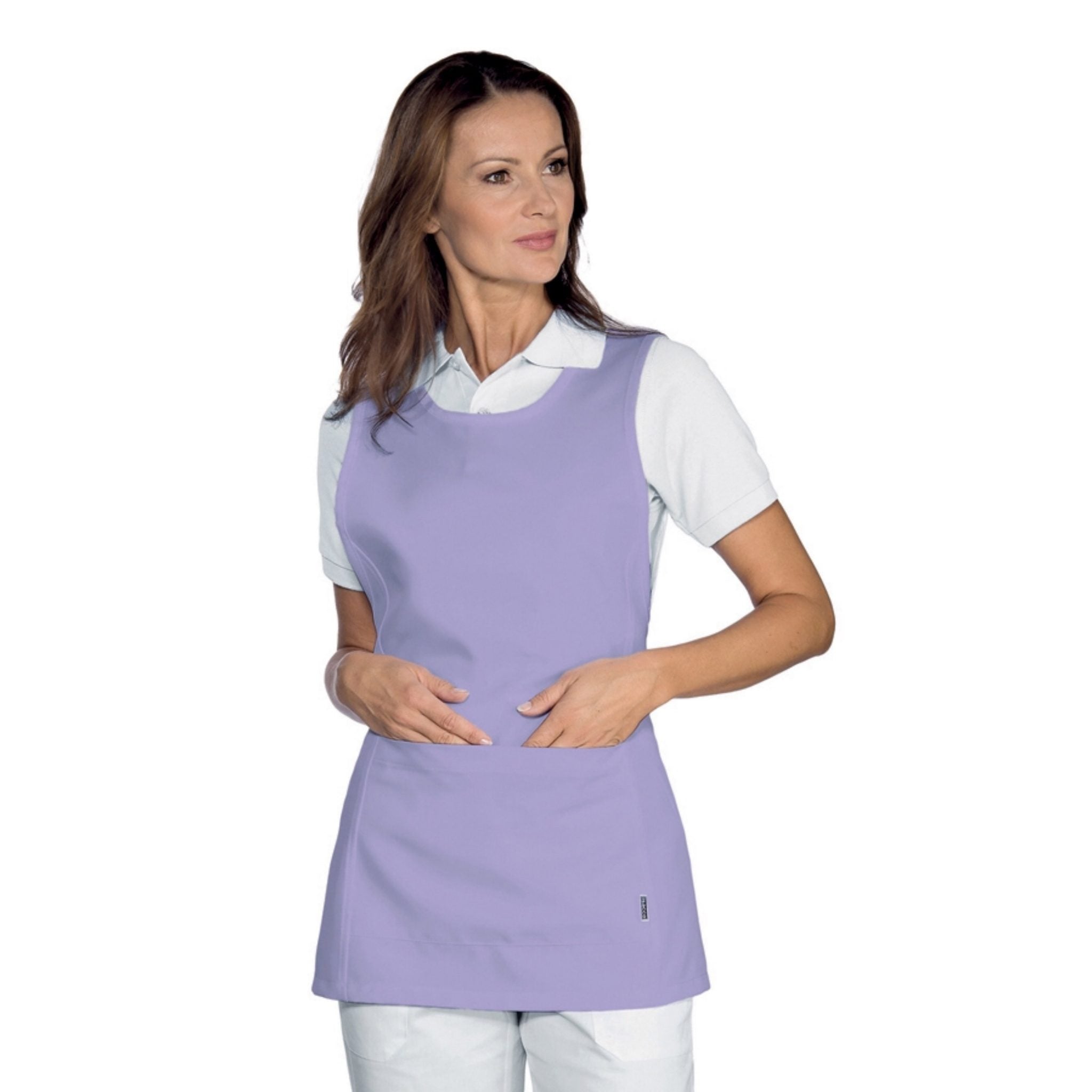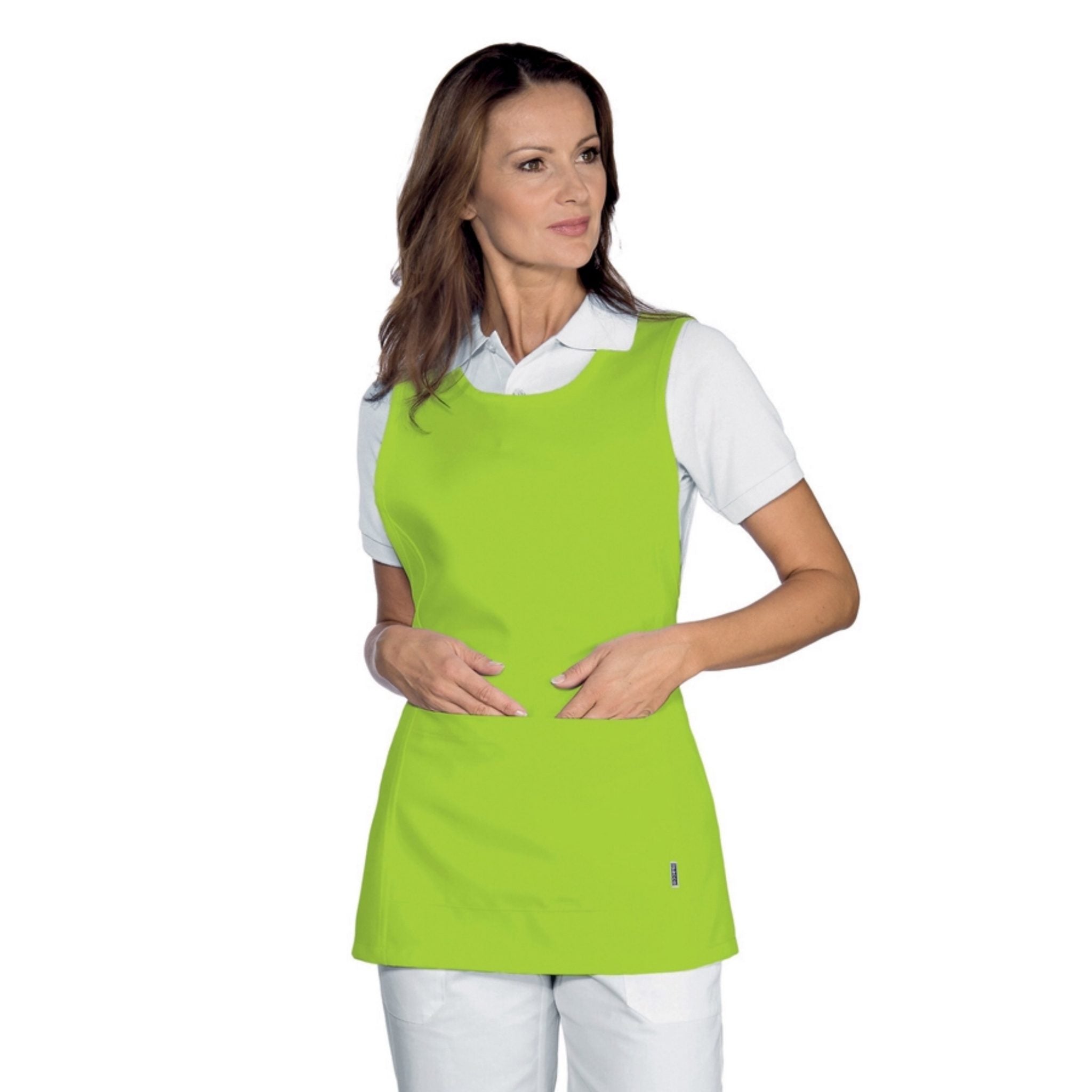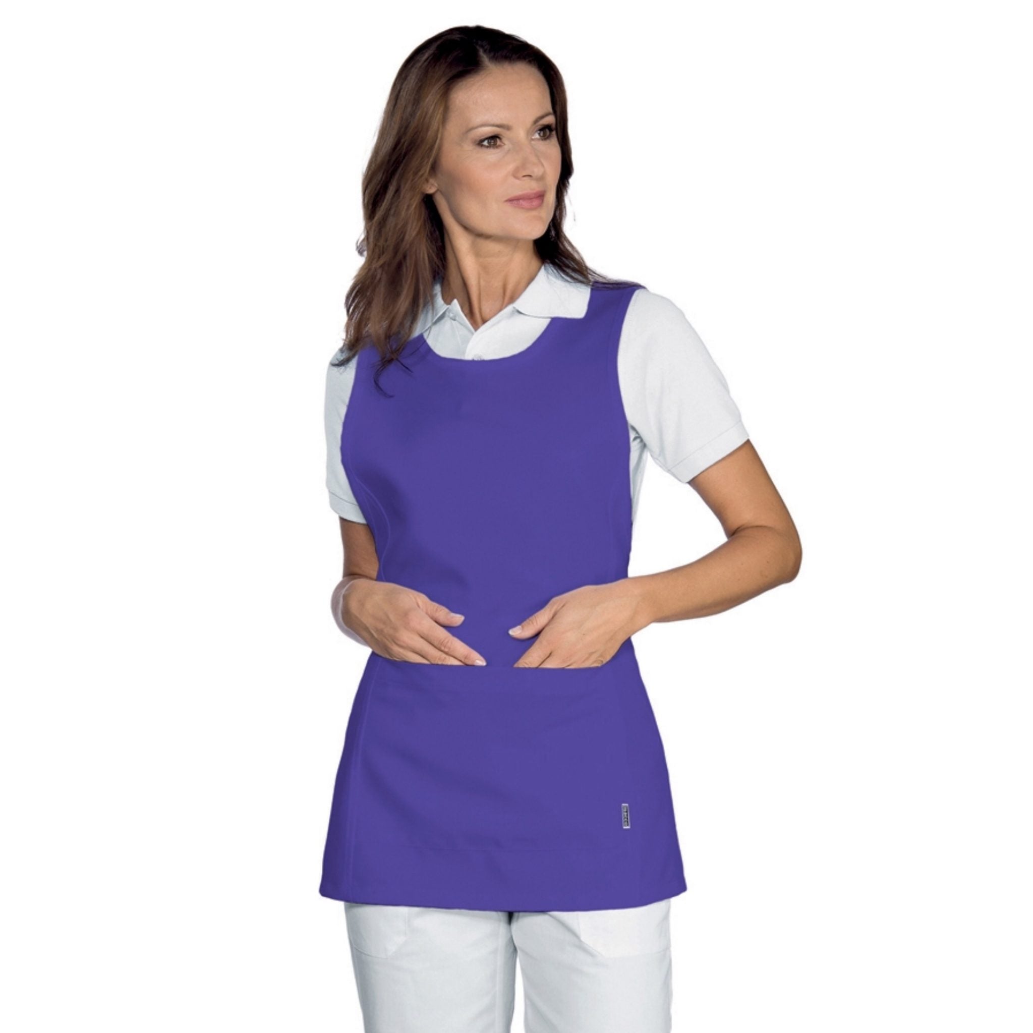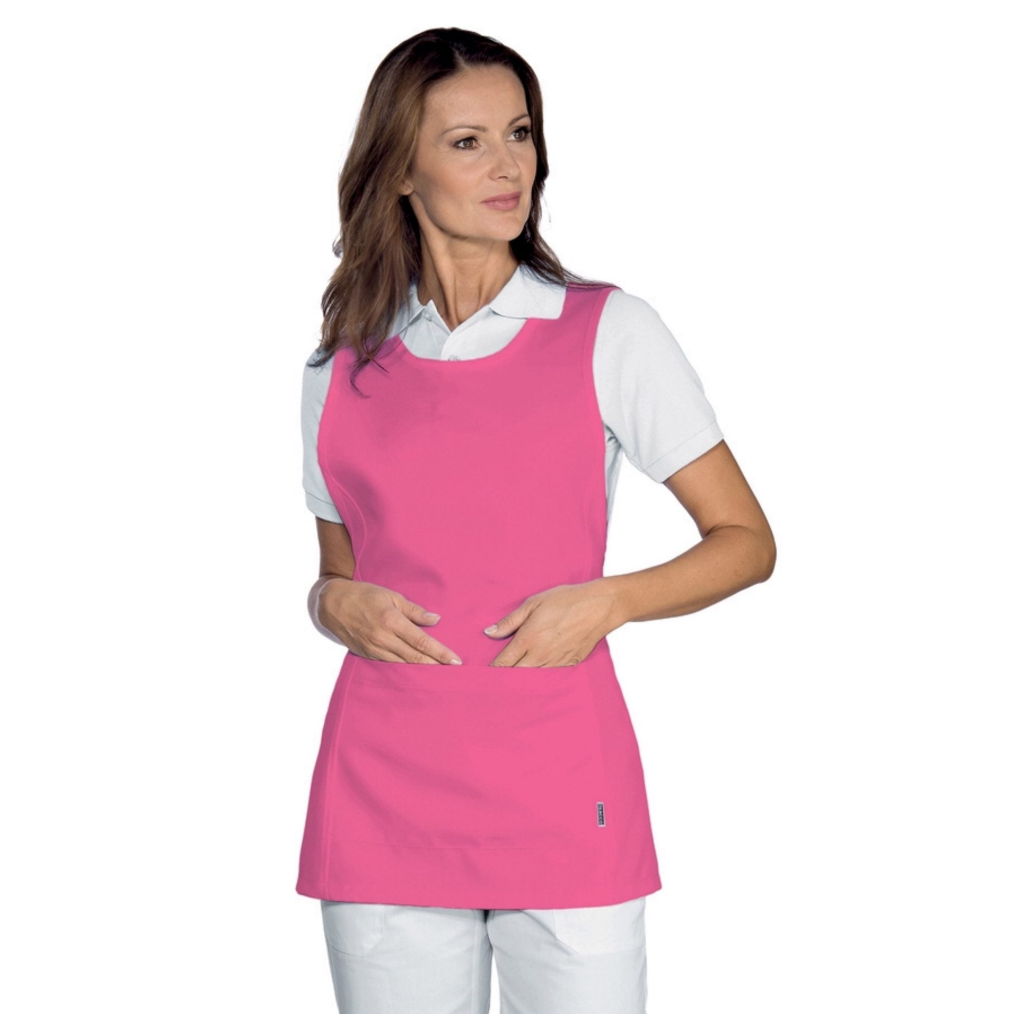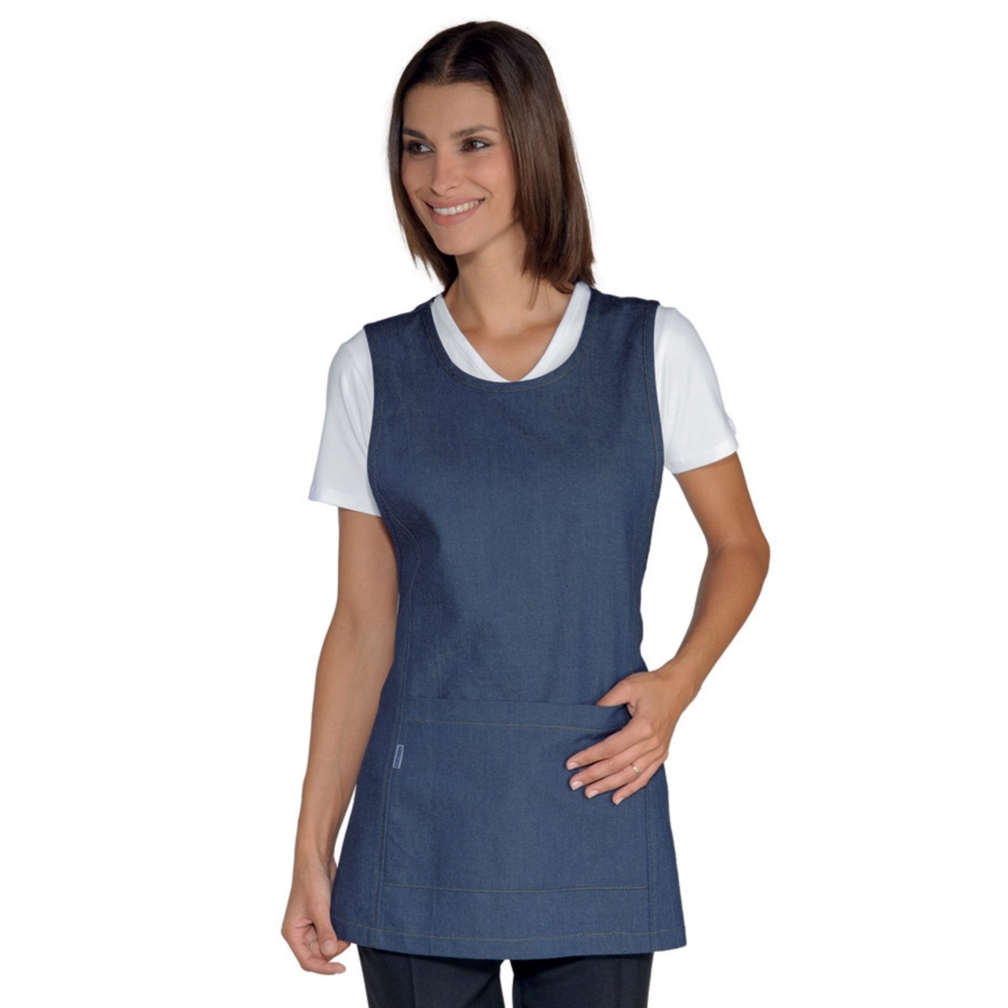 Grembiule con pettorina Isacco Papeete da donna, elegante e pratico, perfetto per ambienti come bar, ristoranti, sale e hotel. Realizzato in 100% poliestere da 220 gr/m², è resistente, comodo e lavabile a 40°C. Dotato di due tasche anteriori e laccio regolabile per taglia unica.