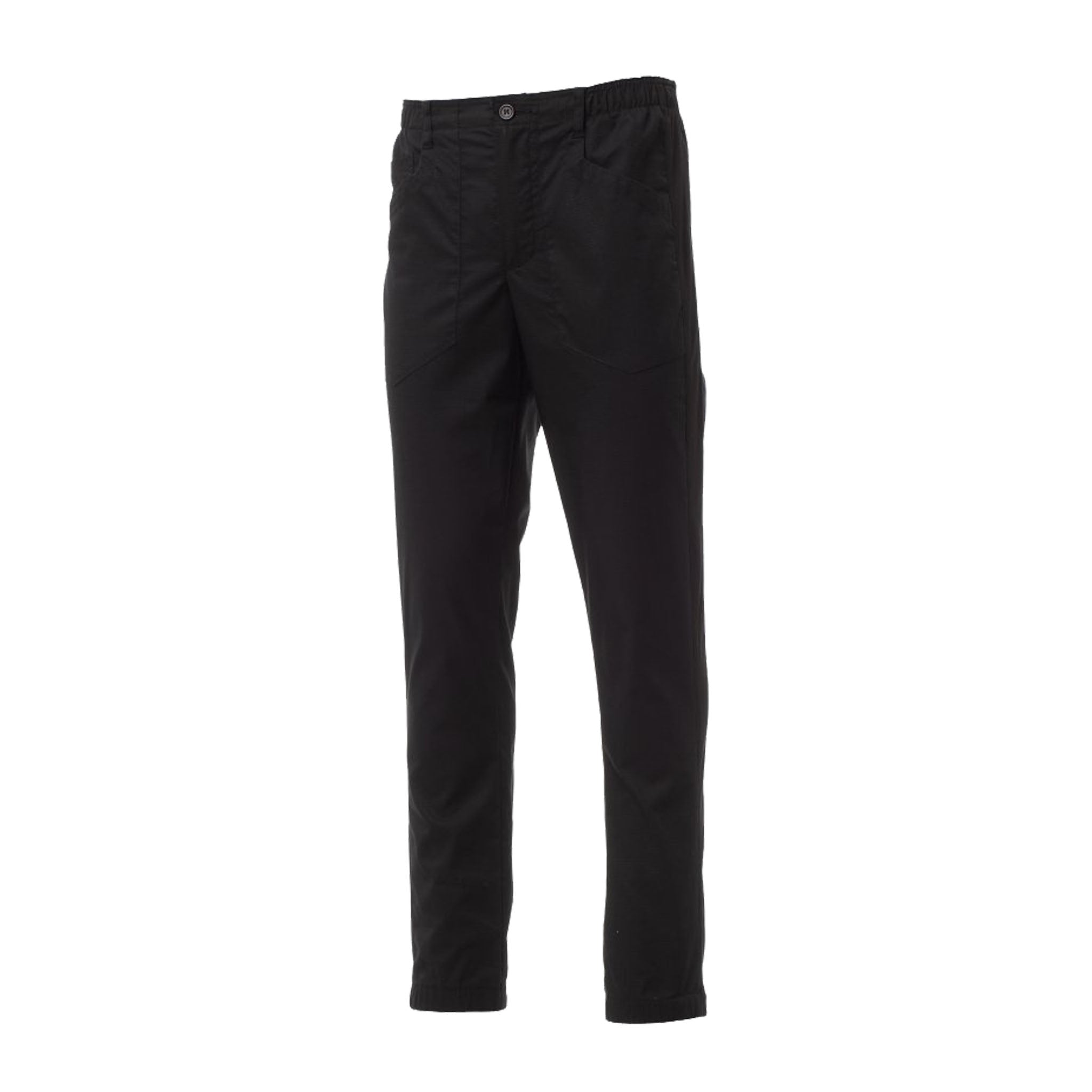 Chiusura con zip e bottone, passanti in vita e fascia interna antisudore. Frontalmente presenta due tasche sagomate e un taschino porta monete. Sul retro è presente una tasca a toppa sagomata. Fondo gamba elastico e travette di rinforzo in tinta per una maggiore resistenza.