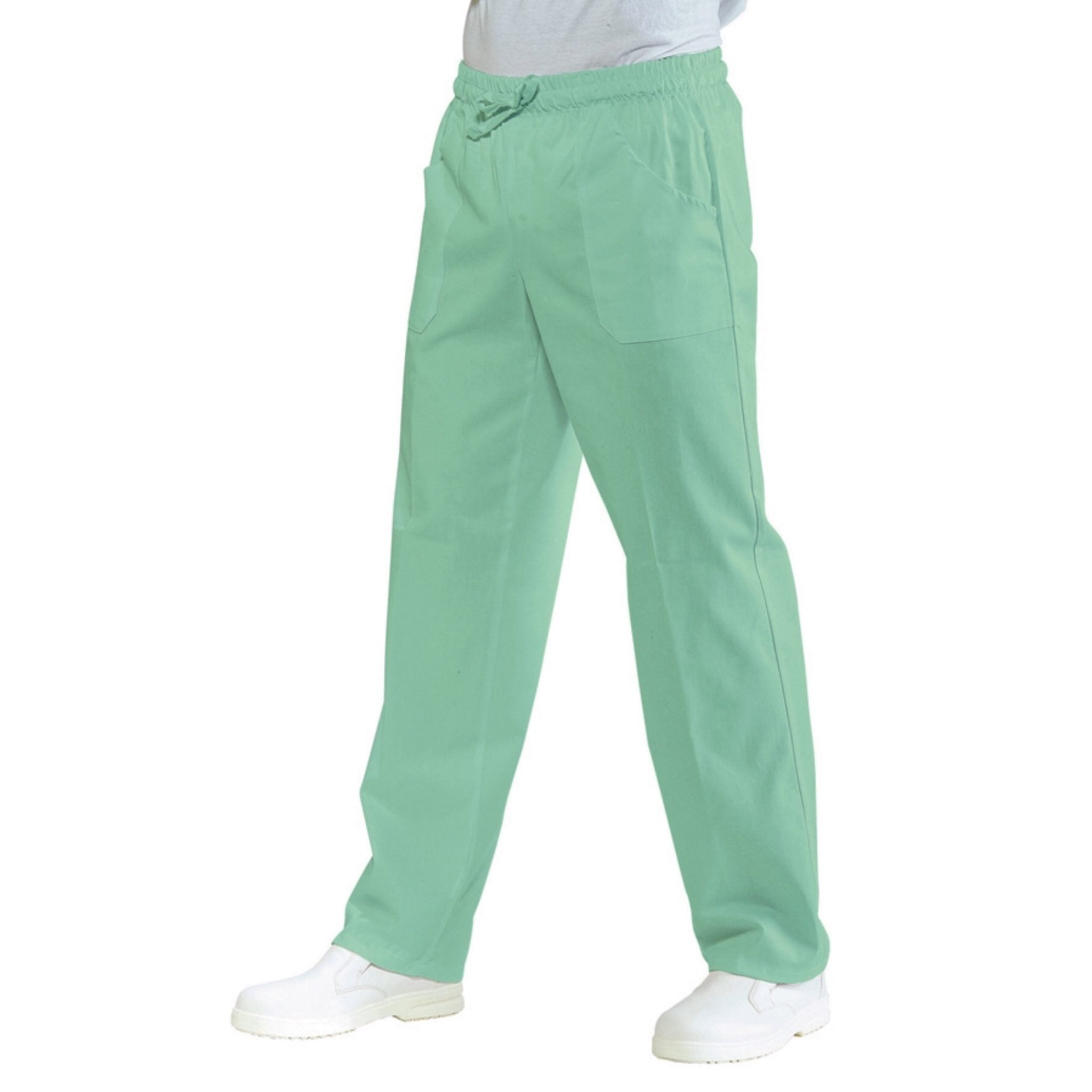 Pantalone unisex Isacco con elastico in vita, ideale per personale sanitario, OSS e assistenti. Realizzato in 100% cotone da 185 gr/m², è comodo, traspirante e lavabile a 60°C. Dotato di lacci piatti in tinta, due tasche anteriori e una tasca posteriore con bottone. Praticità e comfort per l’uso quotidiano in ambienti professionali.