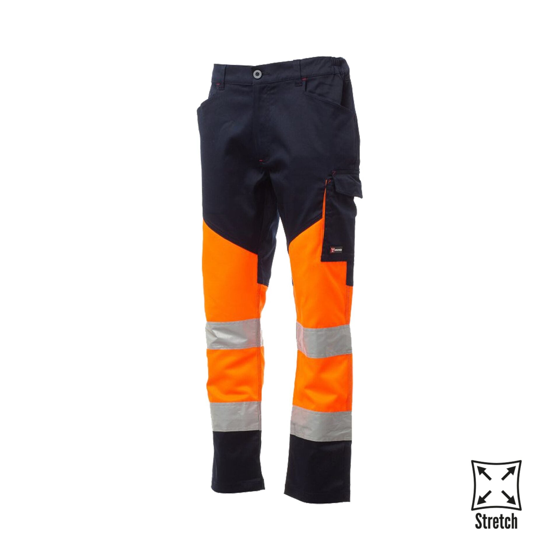 Pantalone unisex multistagione ad alta visibilità, con bande retroriflettenti. Design bicolore con elastici laterali e passanti in vita. Chiusura con zip e bottone in plastica.