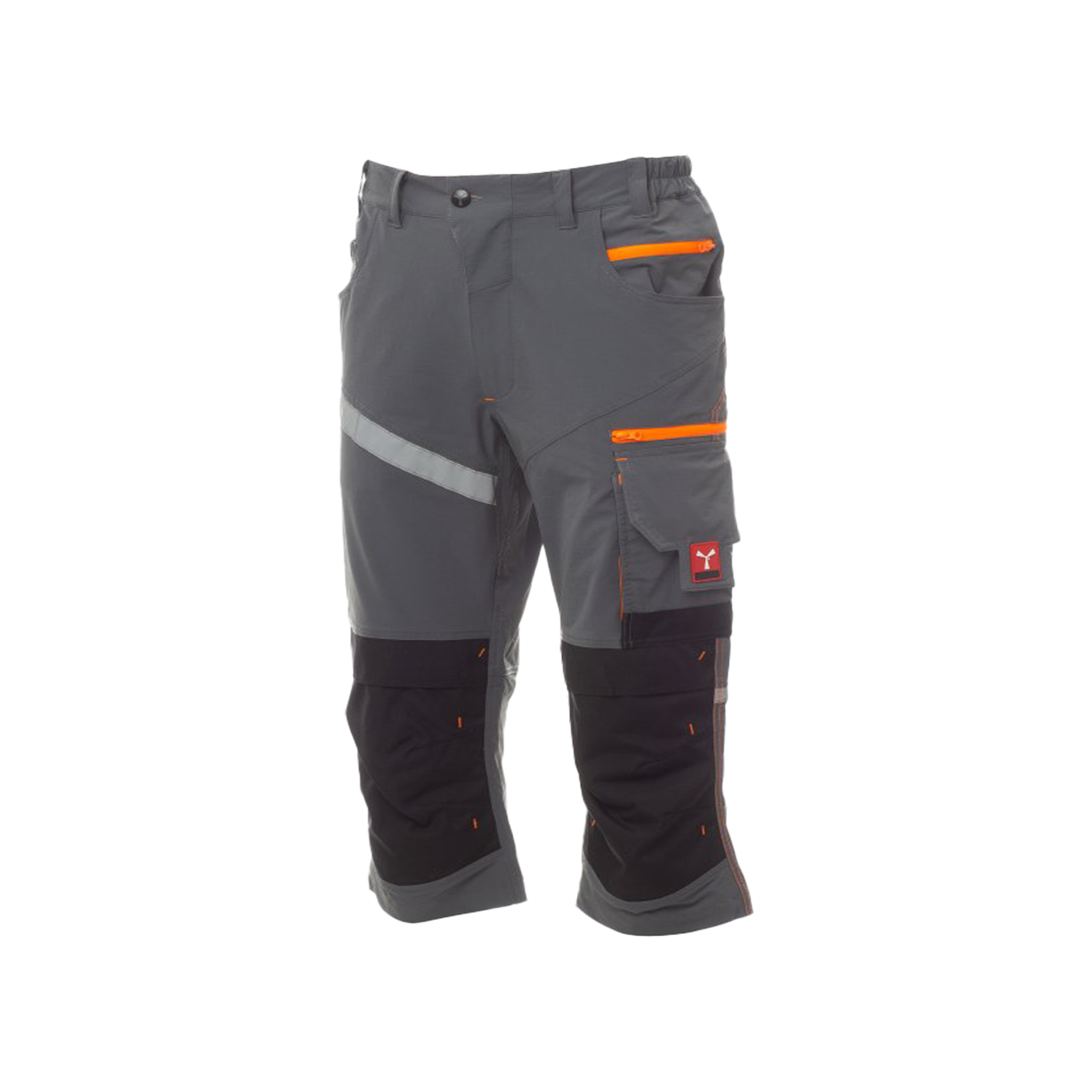 Pantaloni pirata (3/4) unisex in tessuto 4 way stretch, con elastici laterali e passanti in vita. Chiusura con zip e bottone personalizzato. Tasche frontali: 2 arrotondate, 1 porta-monete a destra, 1 di sicurezza con zip a sinistra. Sulla gamba sinistra: 1 tasca orizzontale con zip, 1 tasca con patta sagomata e portabadge, 1 tasca piccola verticale con zip. Gamba destra con banda retroriflettente. Porta-ginocchiere su entrambe le gambe con apertura dall'alto.