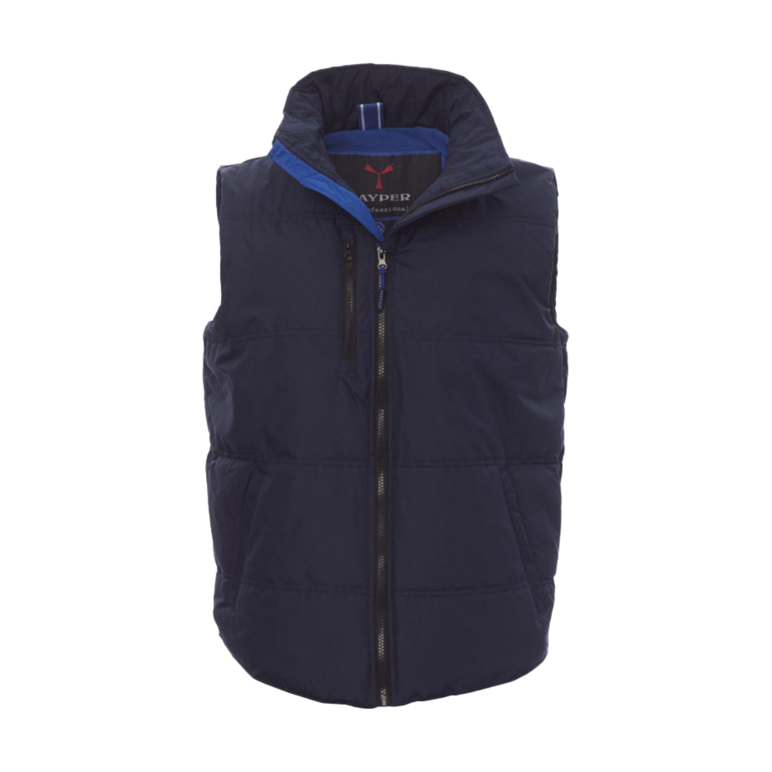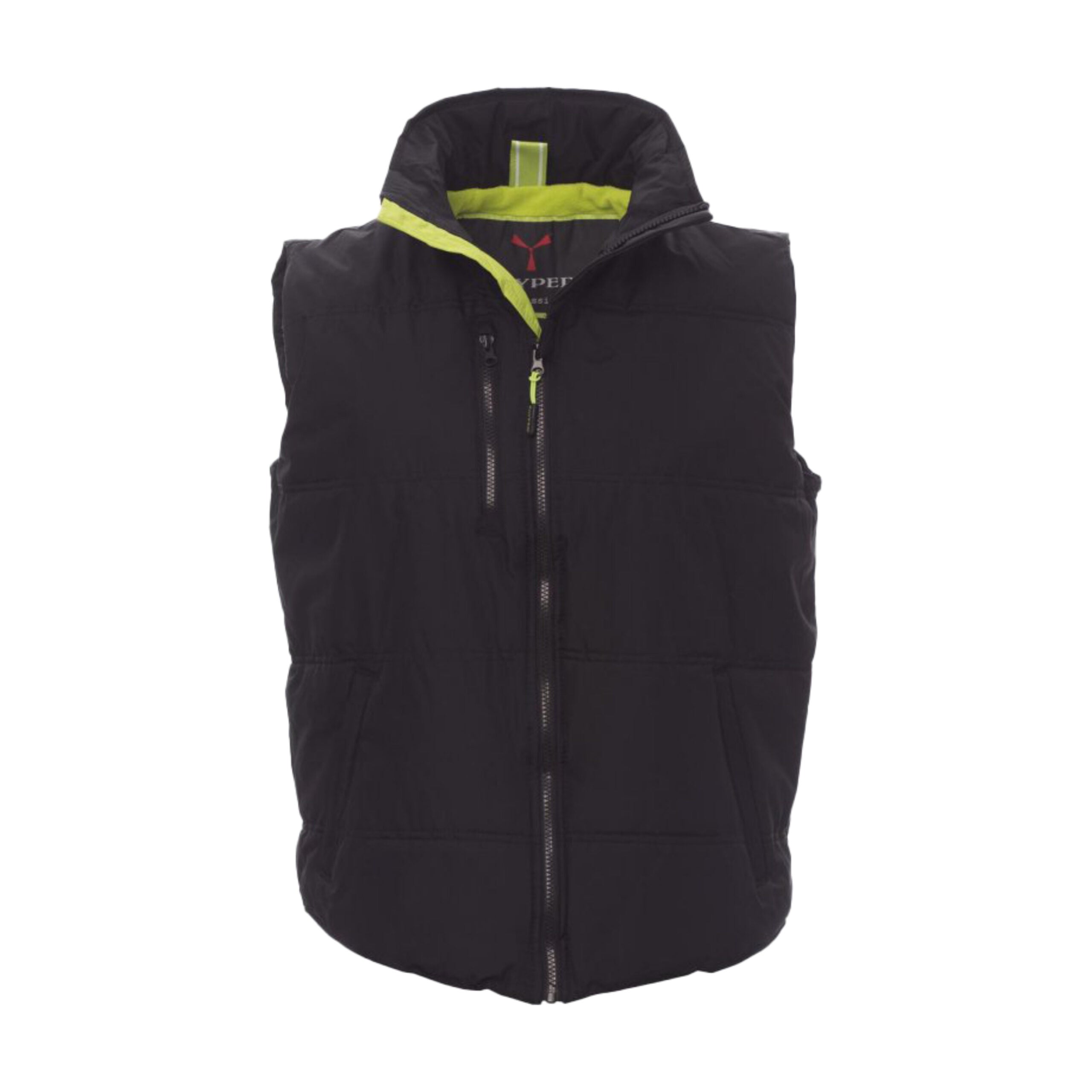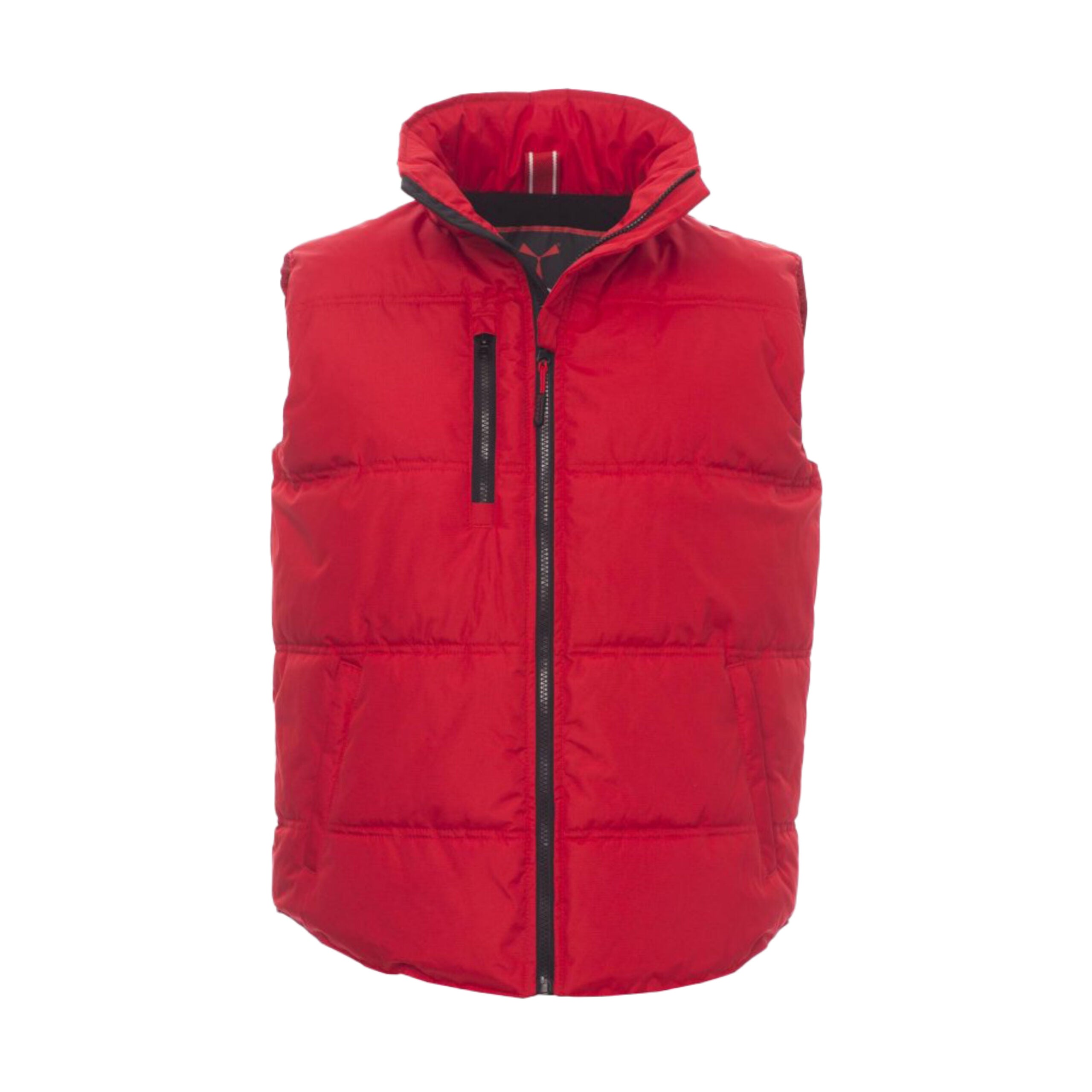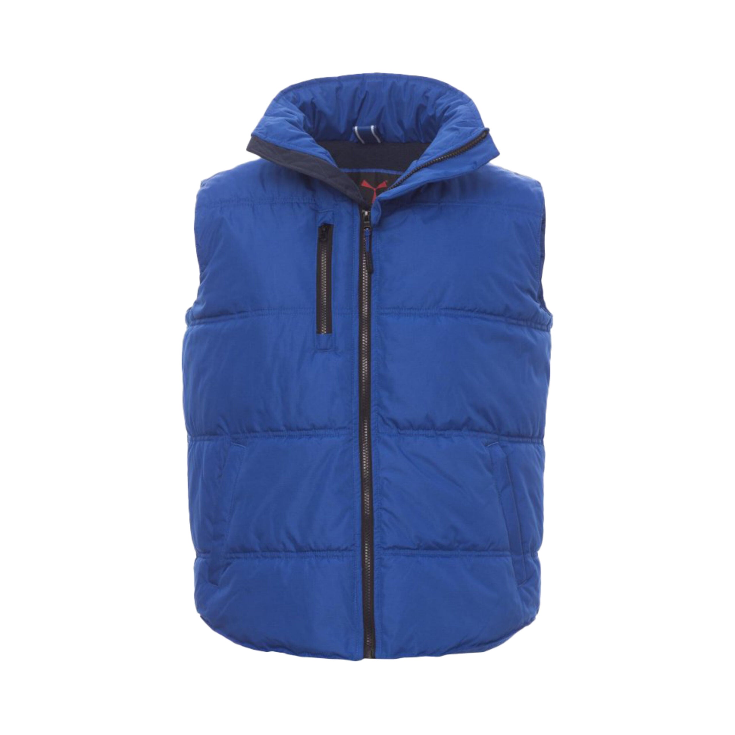 Gilet unisex con zip frontale da 8 mm in plastica e cursore in metallo. Dotato di due tasche laterali con chiusura a zip e una tasca al petto. Interno imbottito in micropile a contrasto per maggiore comfort termico.