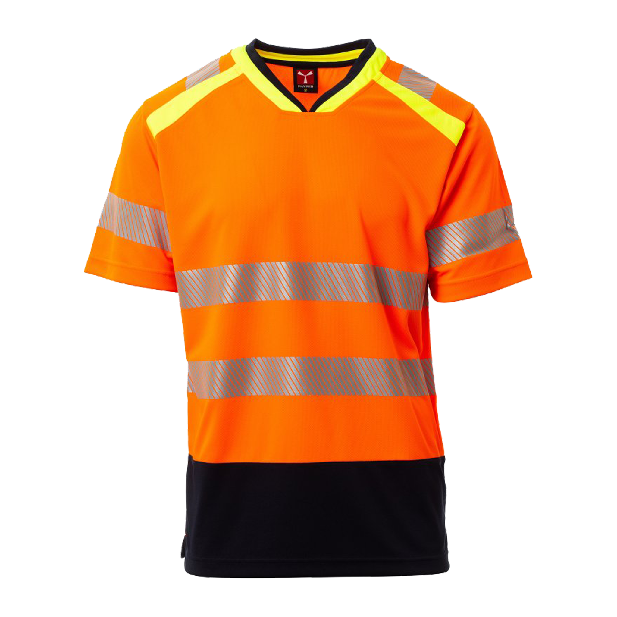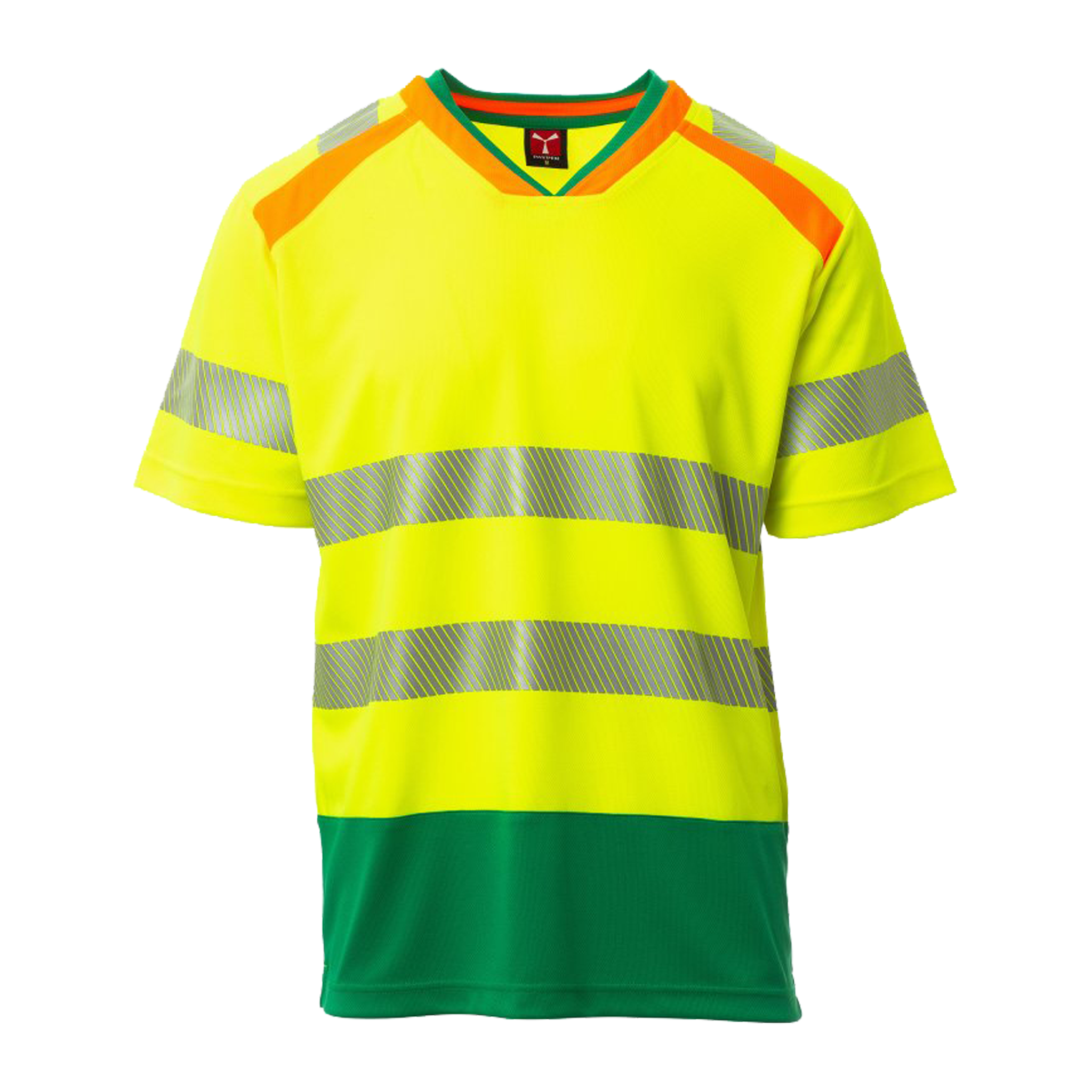 T-shirt tecnica ad alta visibilità, bicolore, con scollo a V e colletto in costina a contrasto con cuciture coperte. Dotata di bande retroriflettenti segmentate e termosaldate su spalle, maniche e vita per garantire maggiore libertà di movimento. Rinforzi con nastro a contrasto e spacchetti laterali per un comfort ottimale anche durante le attività lavorative più intense.