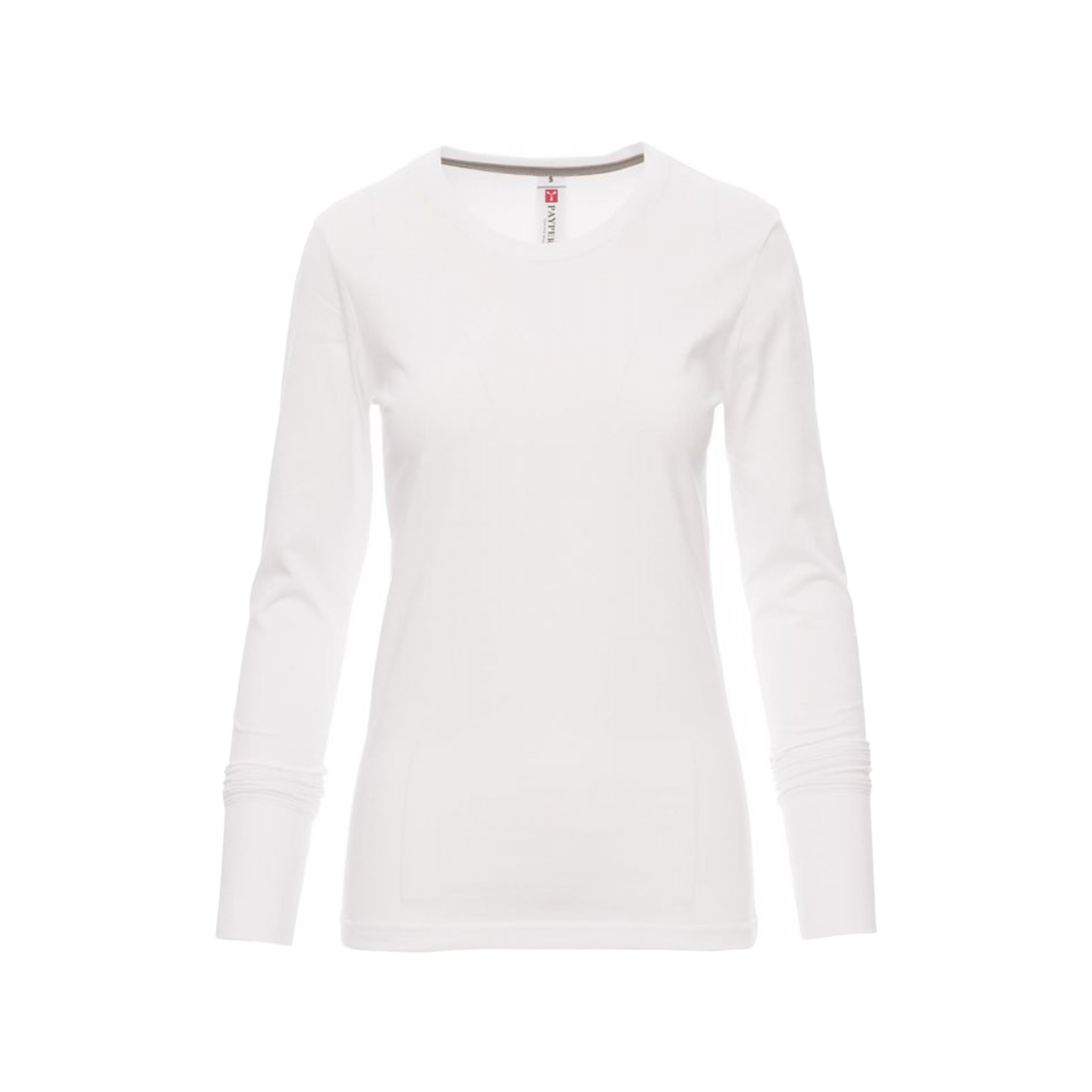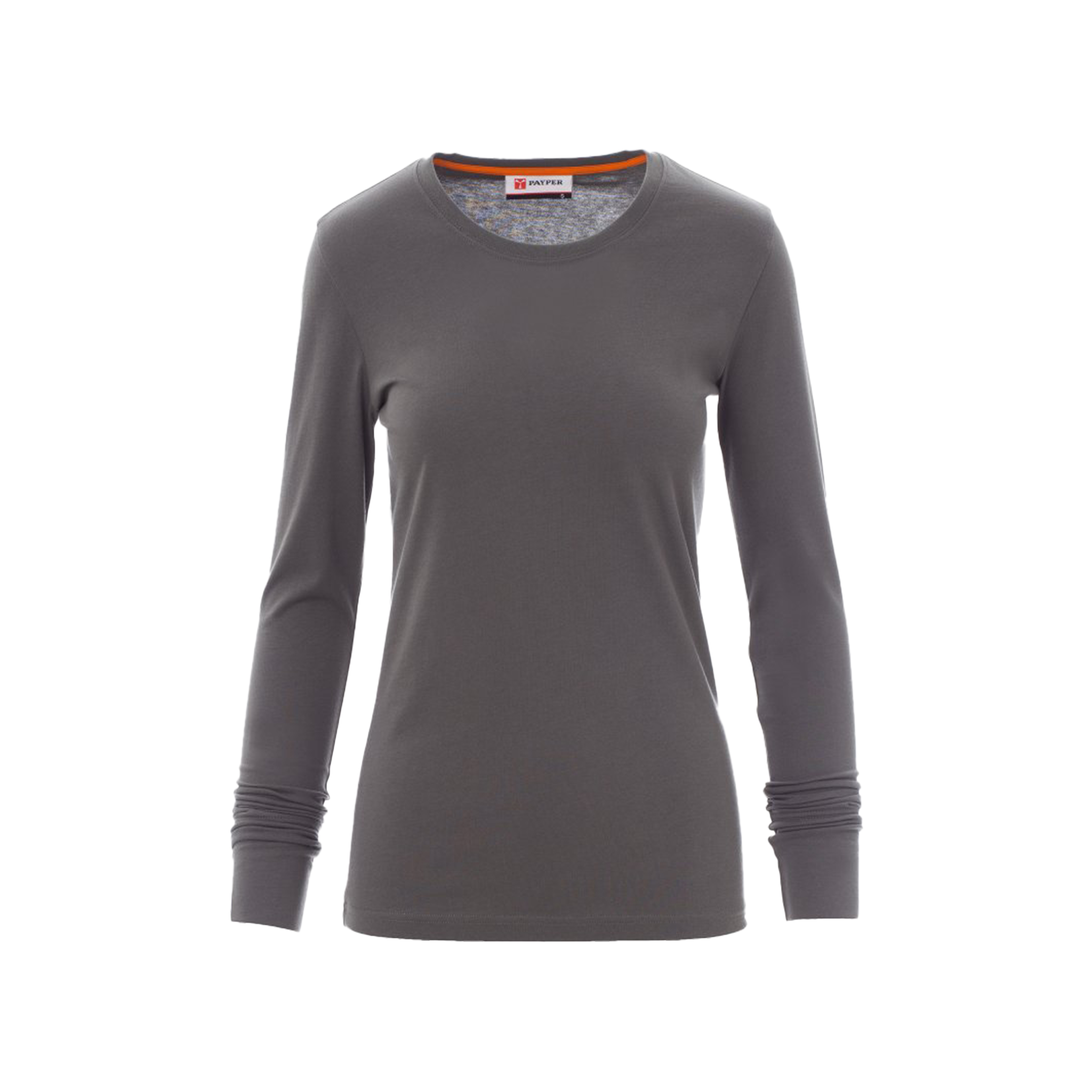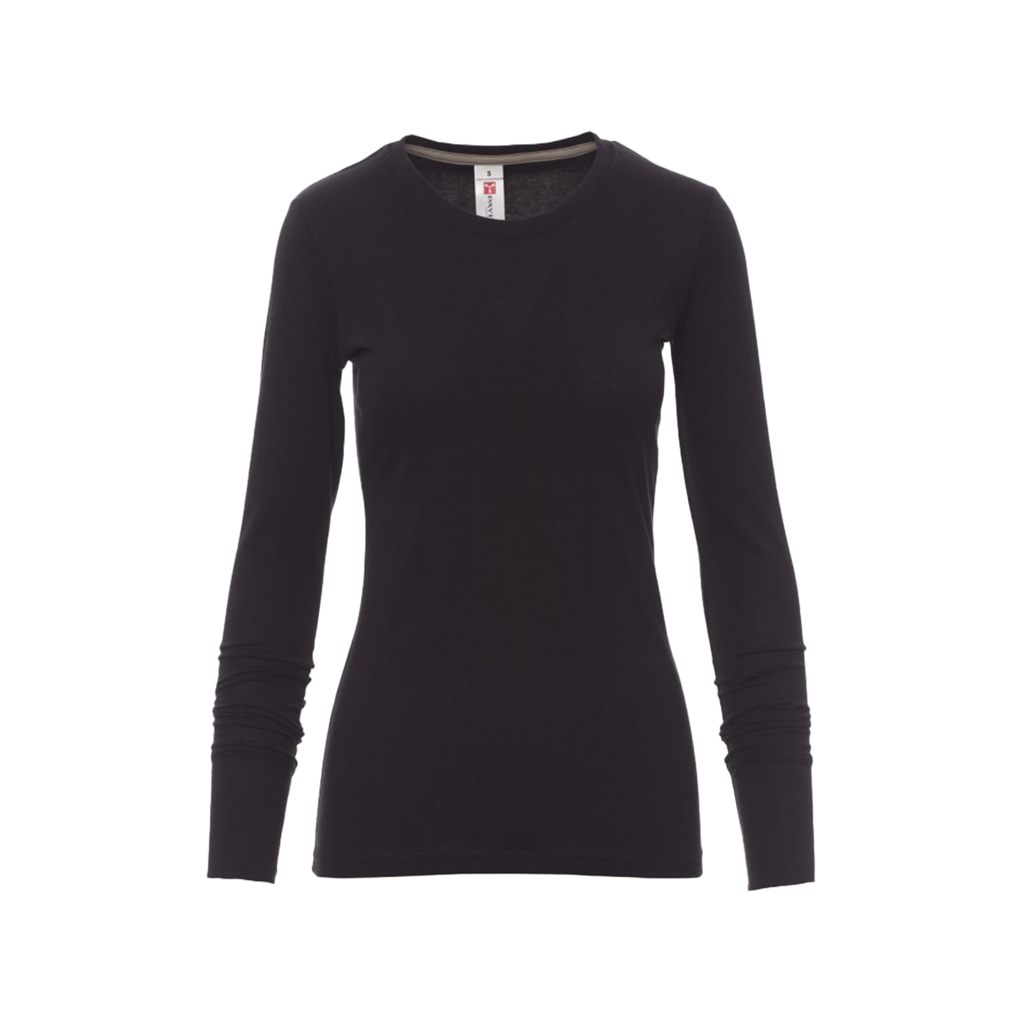 T-shirt da donna sfiancata a manica lunga, con colletto in costina misto spandex da 1,5 cm e cucitura ribattuta sul davanti. Presenta maniche con polsino lungo, cuciture stretch e laterali, nastro di rinforzo da spalla a spalla in colore a contrasto visibile nel colletto.