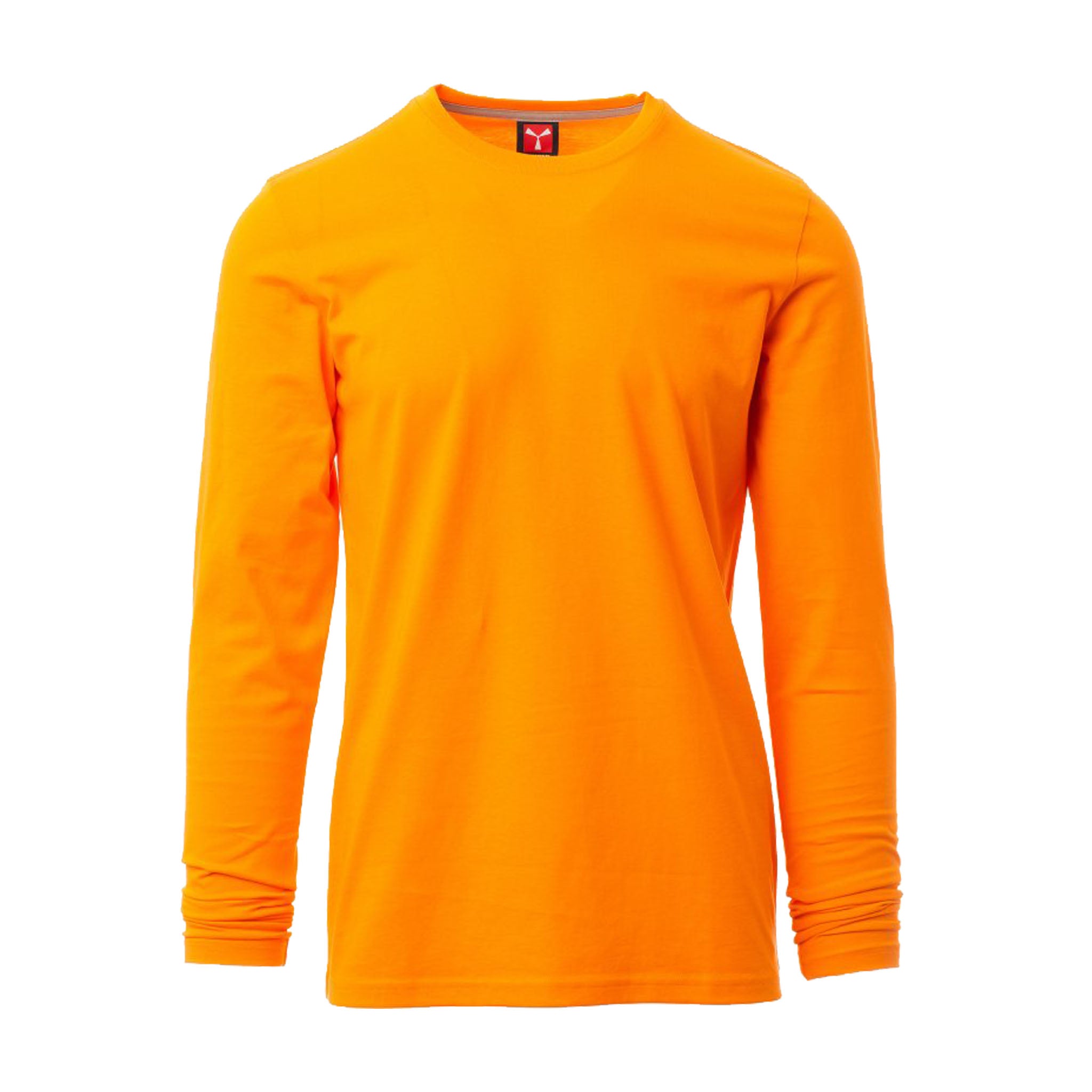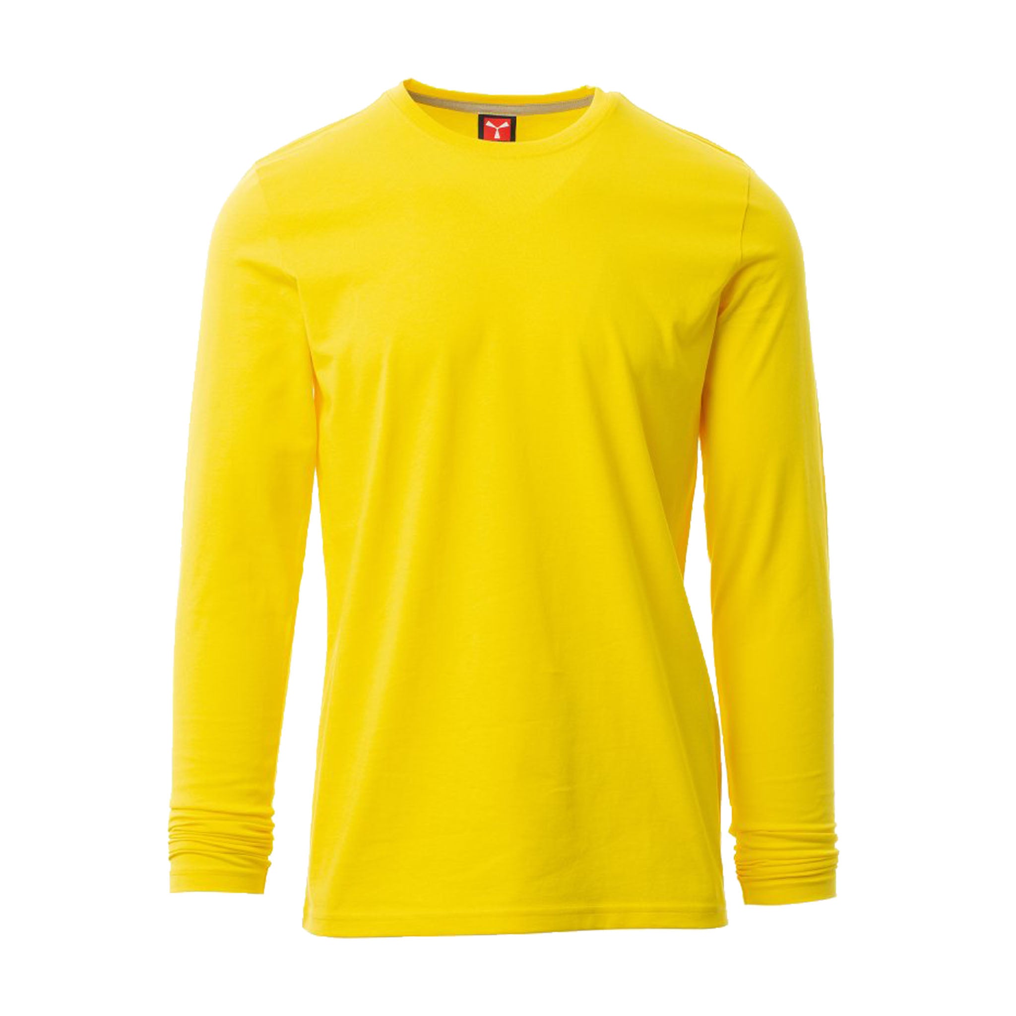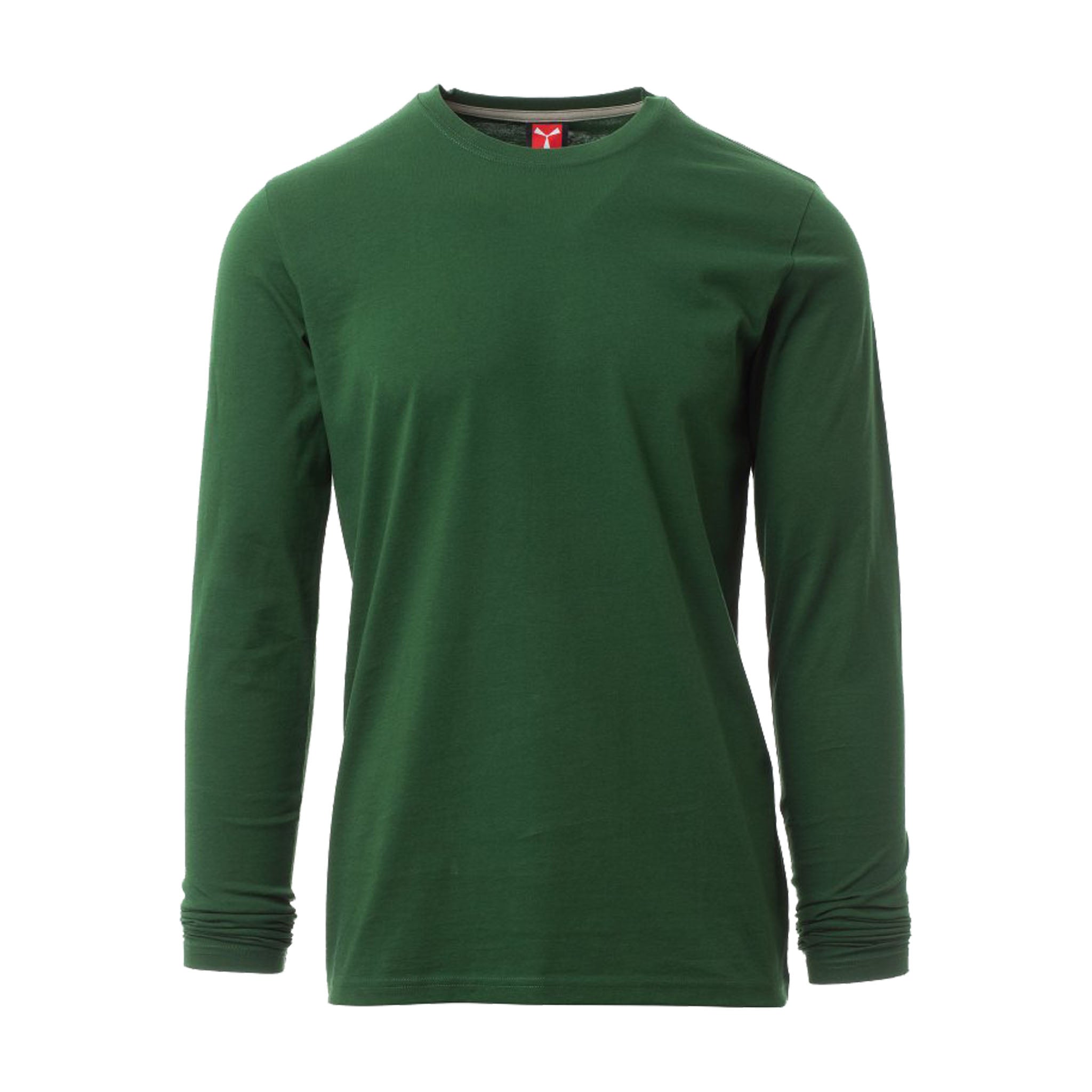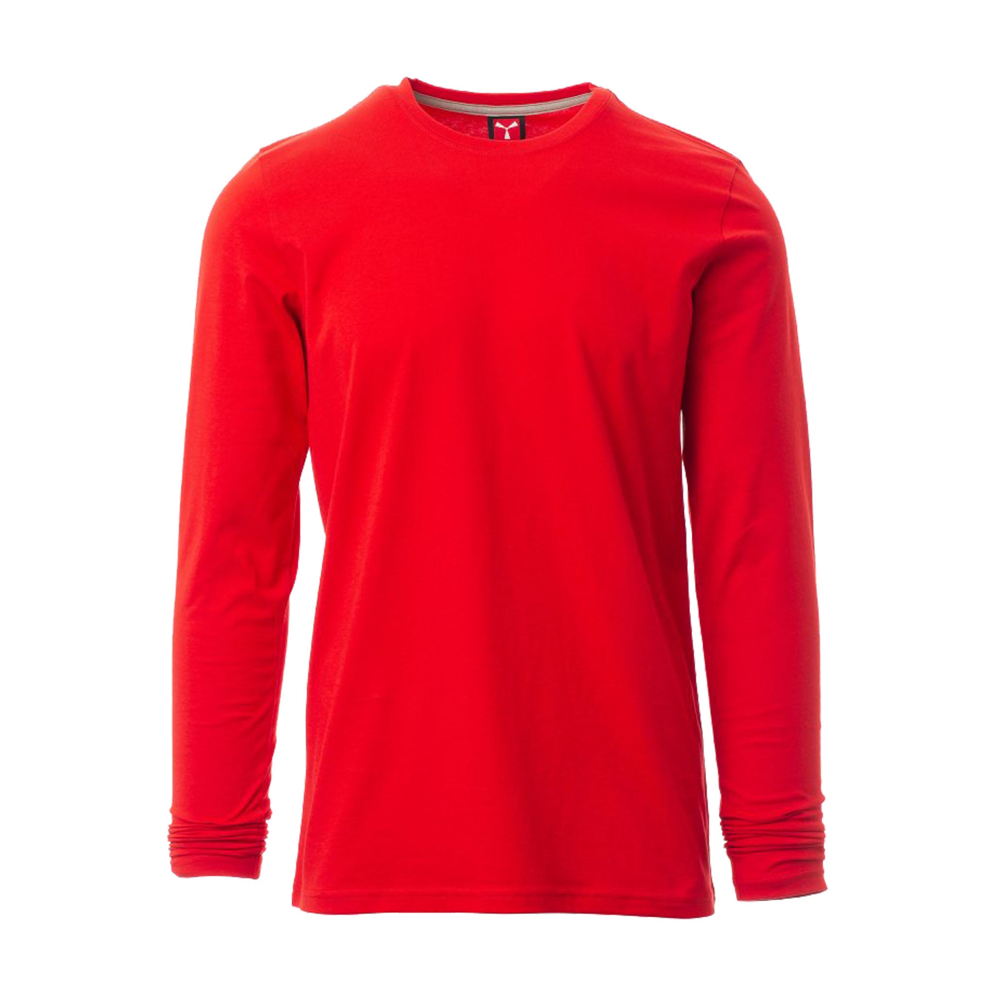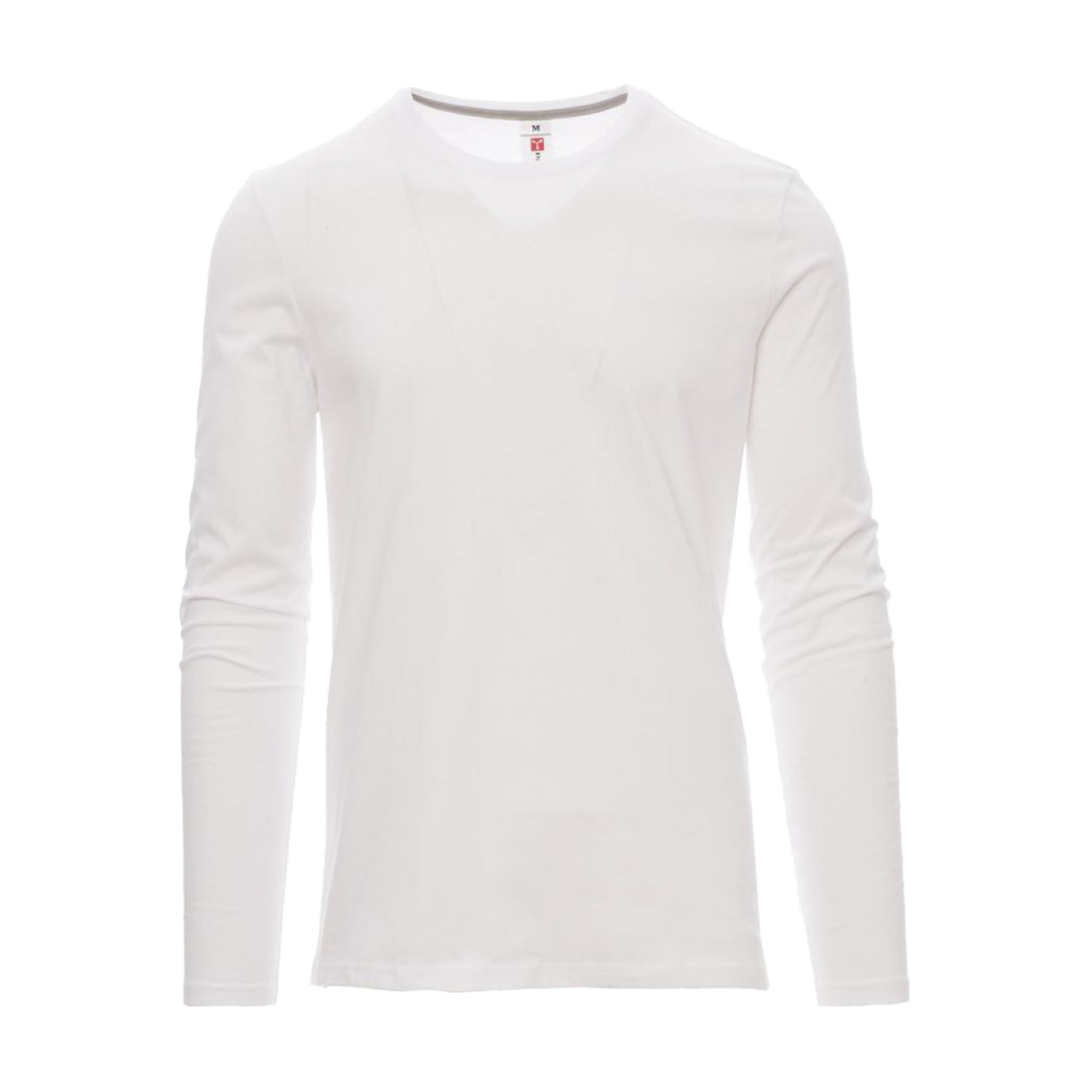 T-shirt da uomo a manica lunga, realizzata in jersey 100% cotone da 165 gr/mq. Il modello è dotato di colletto in costina mista spandex da 1,5 cm con cucitura ribattuta frontale per una tenuta duratura. Cuciture stretch e struttura laterale per una vestibilità ergonomica. Il nastro di rinforzo da spalla a spalla, in colore a contrasto, è visibile all’interno del colletto. Le maniche lunghe sono rifinite con polsino per una migliore aderenza.