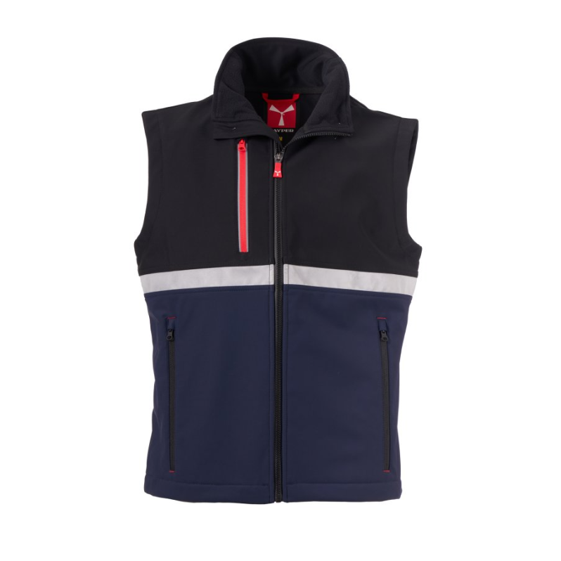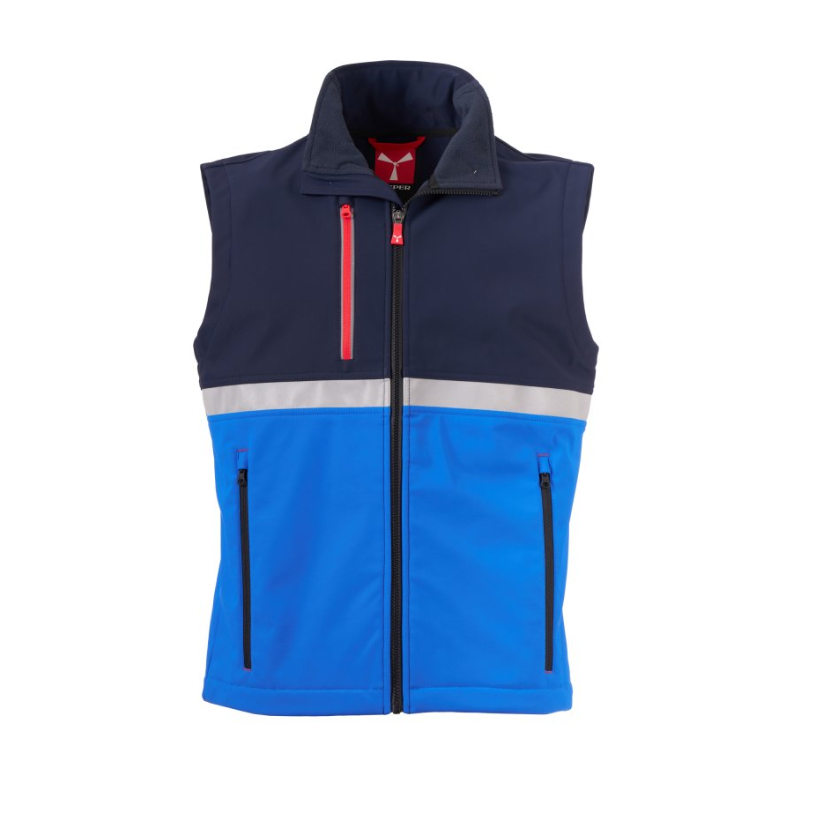 Gilet softshell bicolore da uomo a 3 strati, progettato per utilizzo professionale 4 stagioni. Impermeabile fino a 8000 mm H₂O e traspirante 5000 g/m² 24h, garantisce protezione da pioggia e vento mantenendo massima libertà di movimento grazie alla struttura stretch in nylon ed elastan. Collo con inserti in pile per maggiore comfort e chiusura con zip SBS con cursore in metallo semi-auto lock.